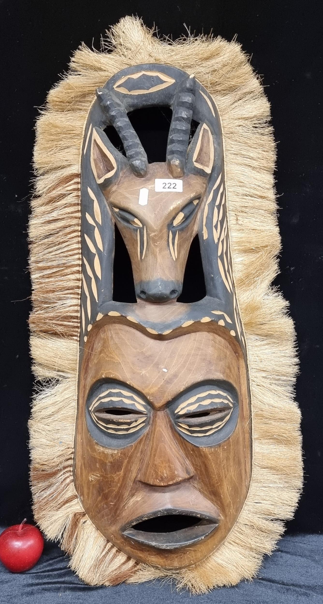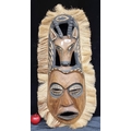 A very large African wood carved mask, with pierced detail depicting a face and antelope encased in a beige fringe. H 80cm.