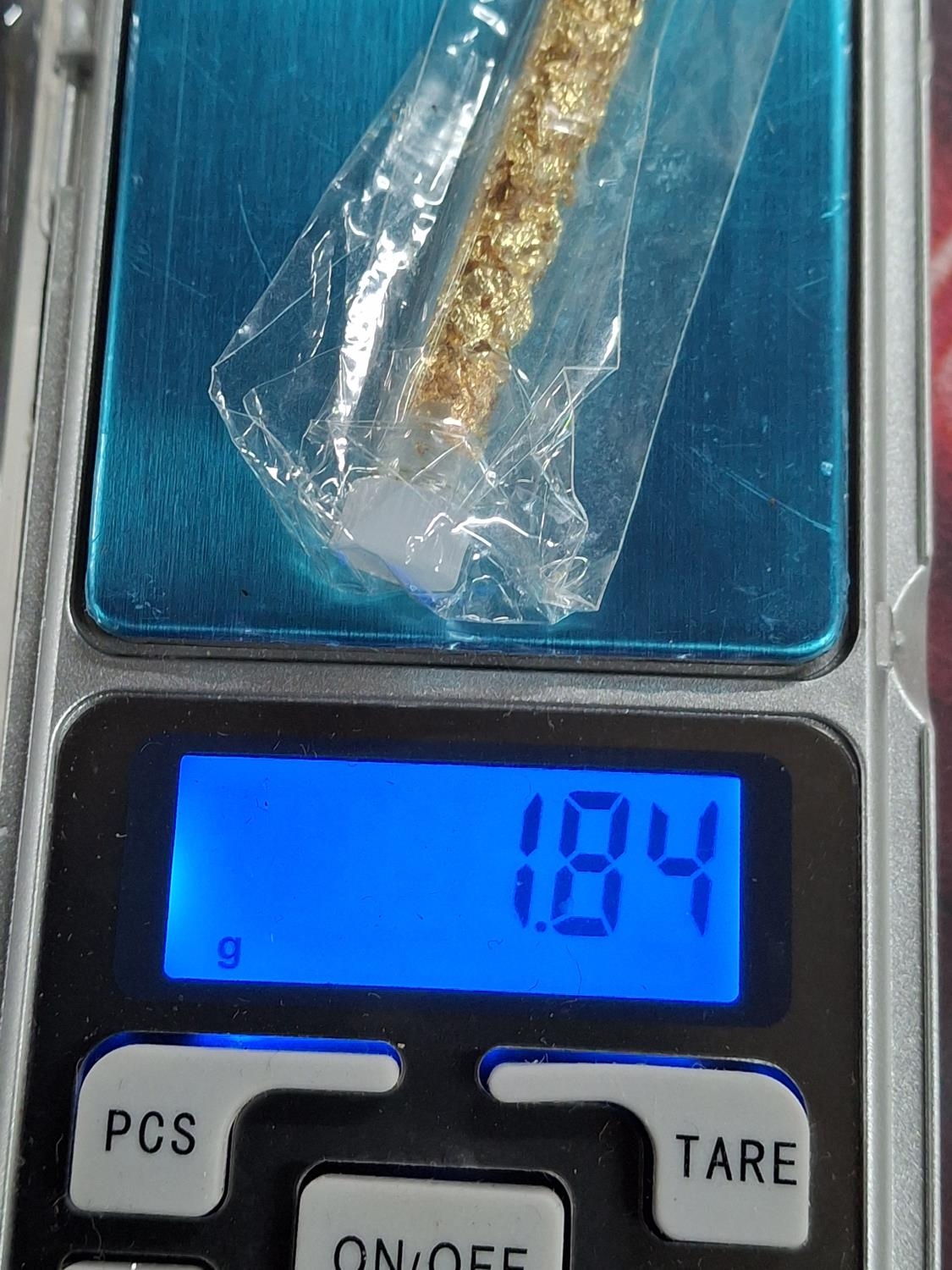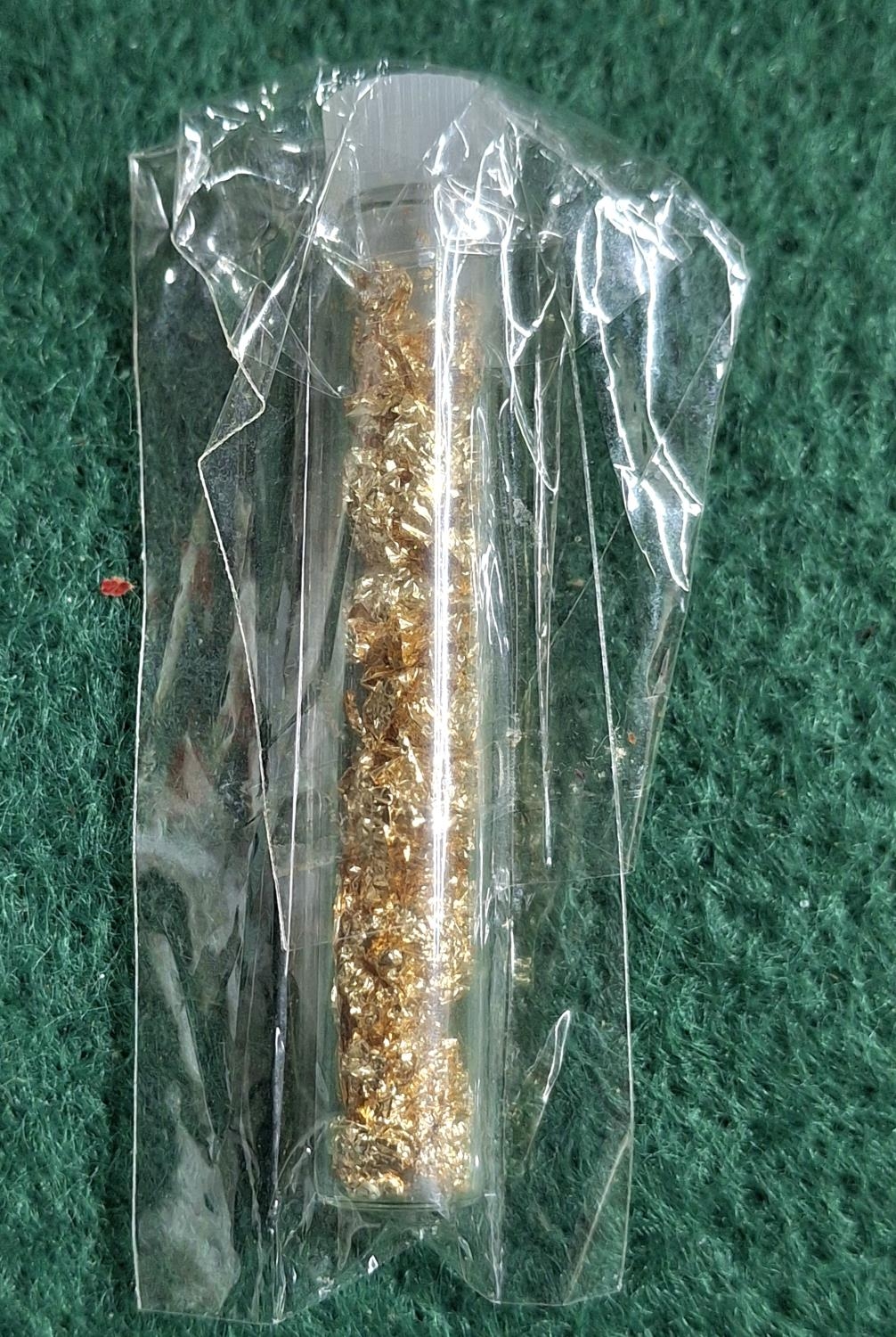 Small glass vial filled with gold coloured flakes, supposedly Gold.