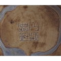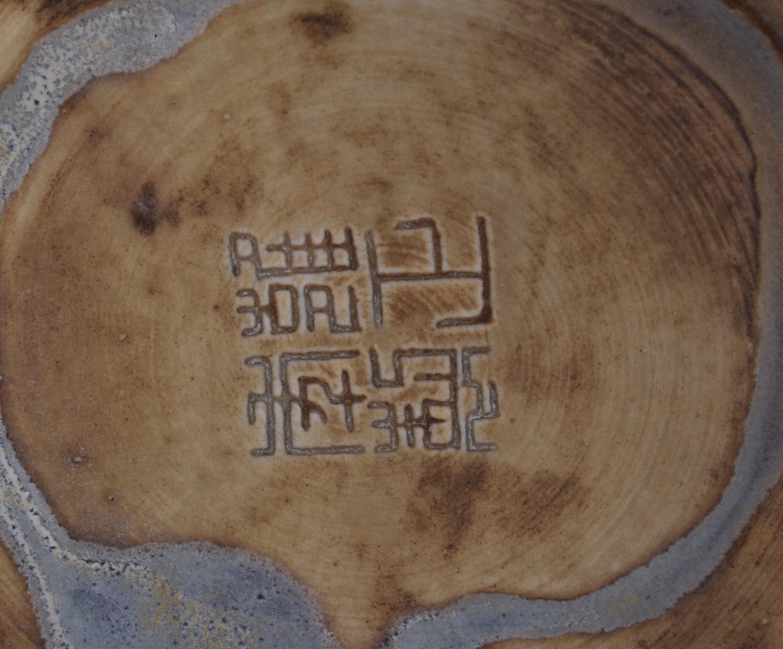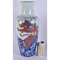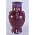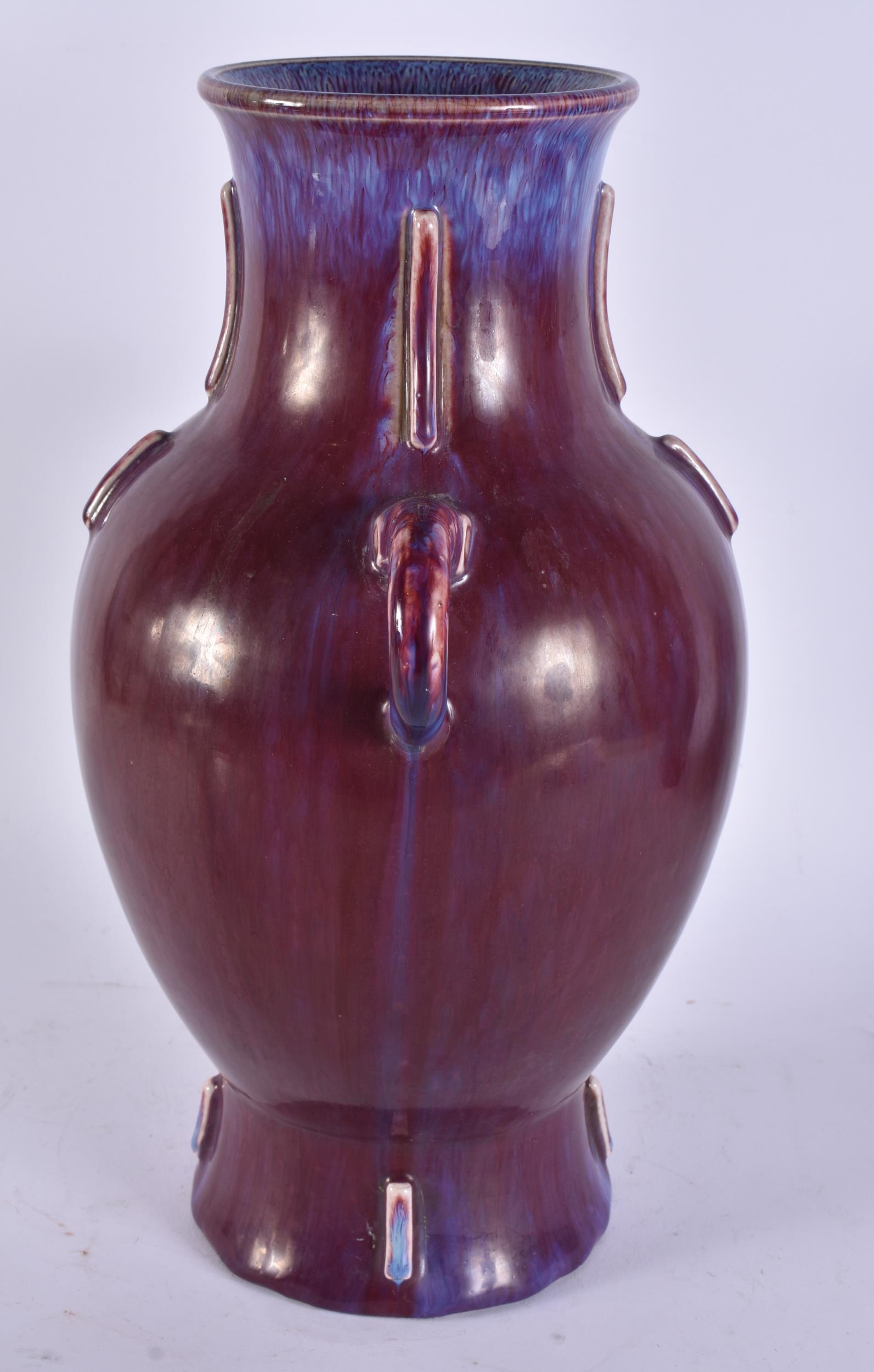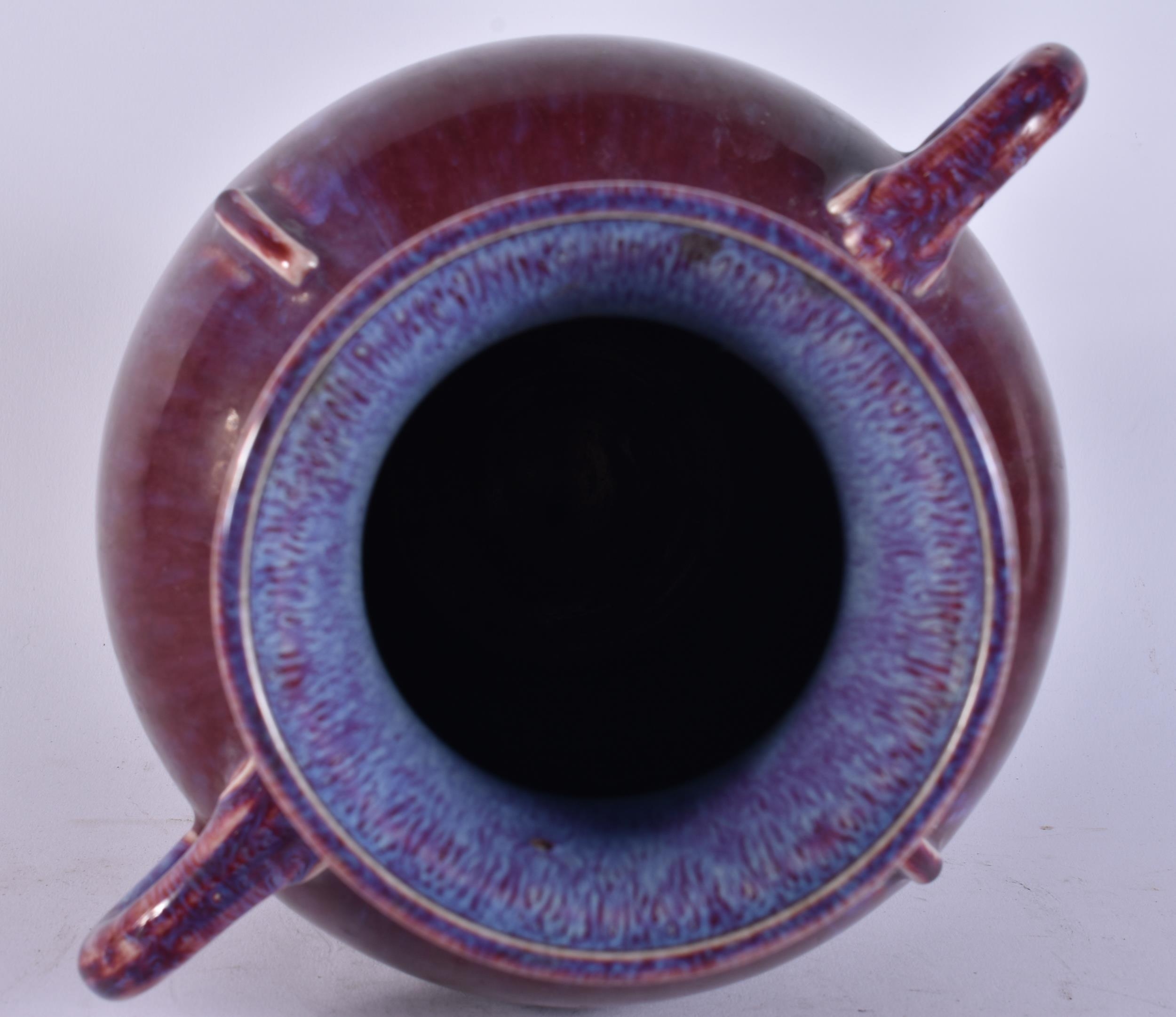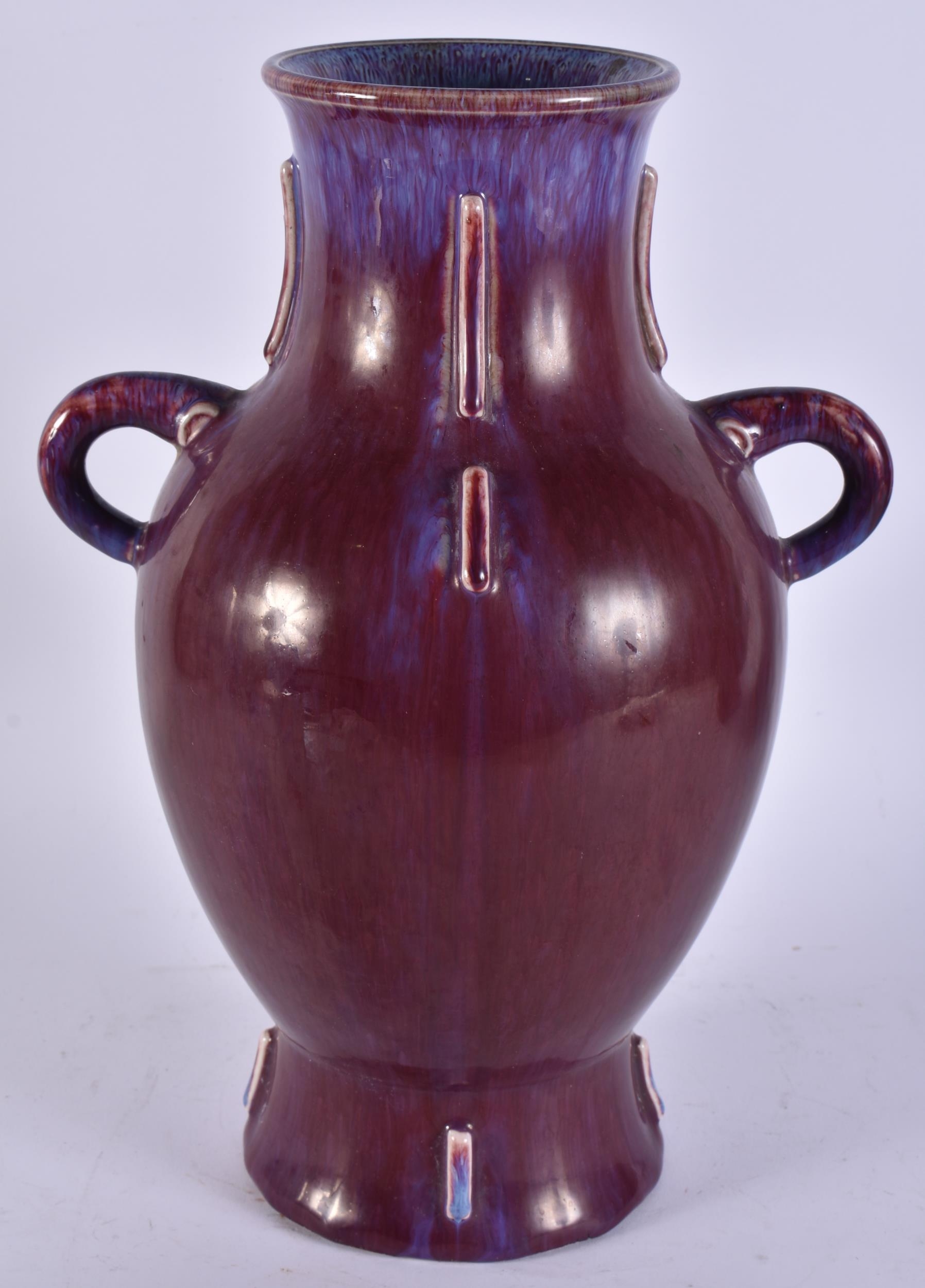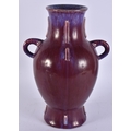 A LARGE CHINESE FLAMBE GLAZED TWIN HANDLED PORCELAIN VASE. 33 cm x 20 cm.