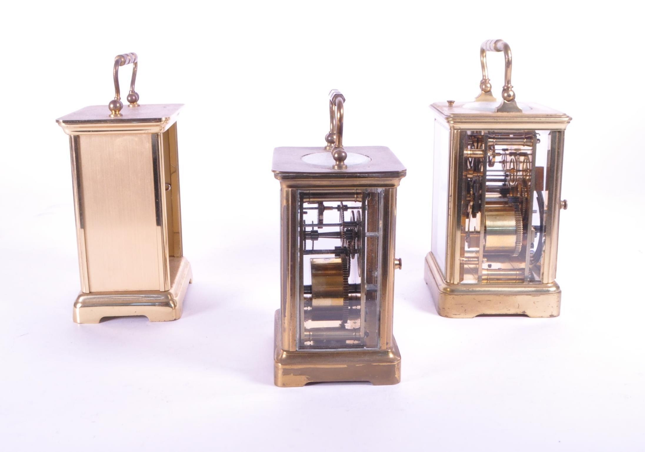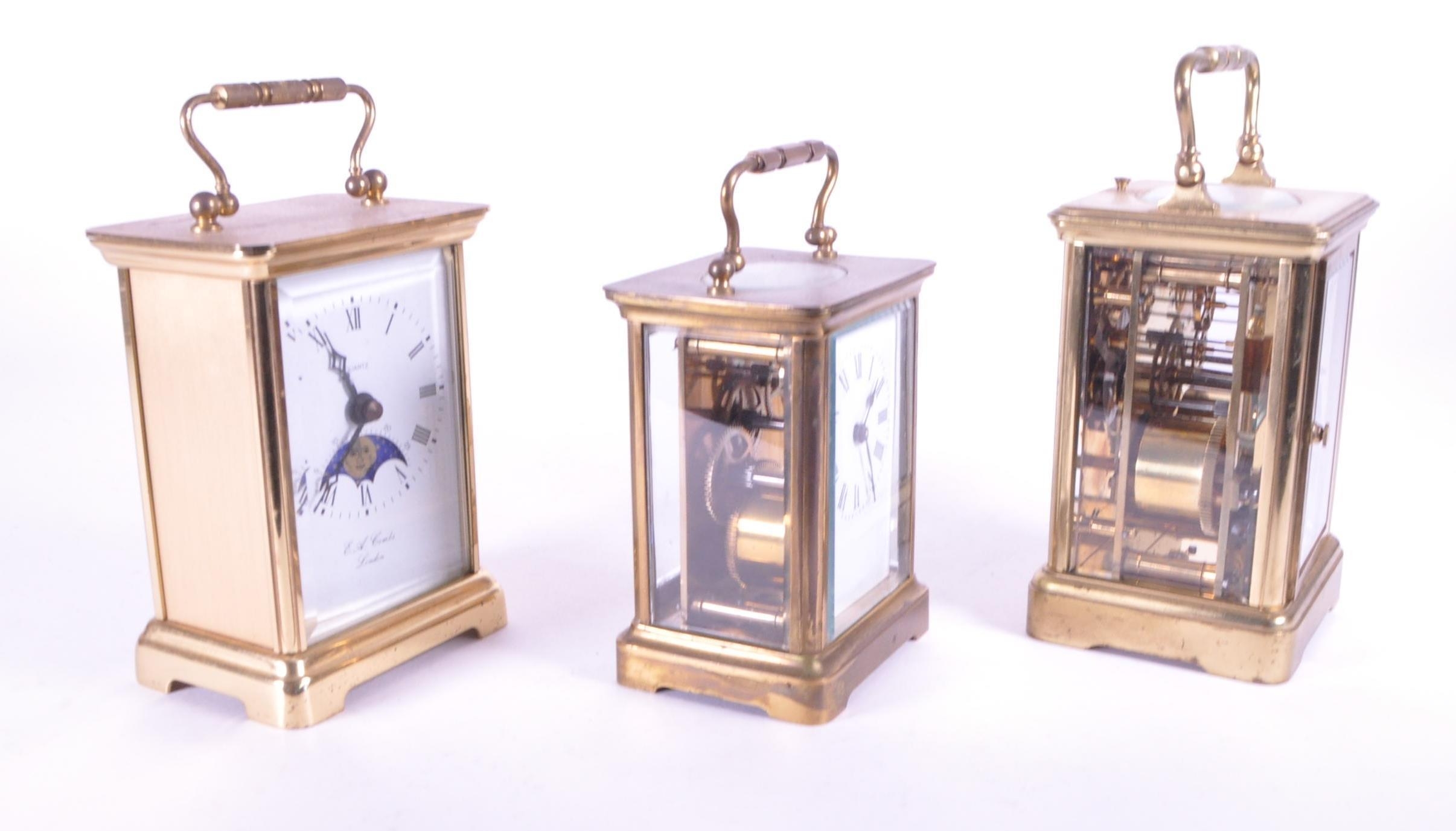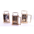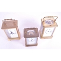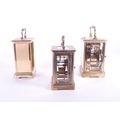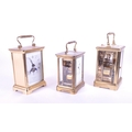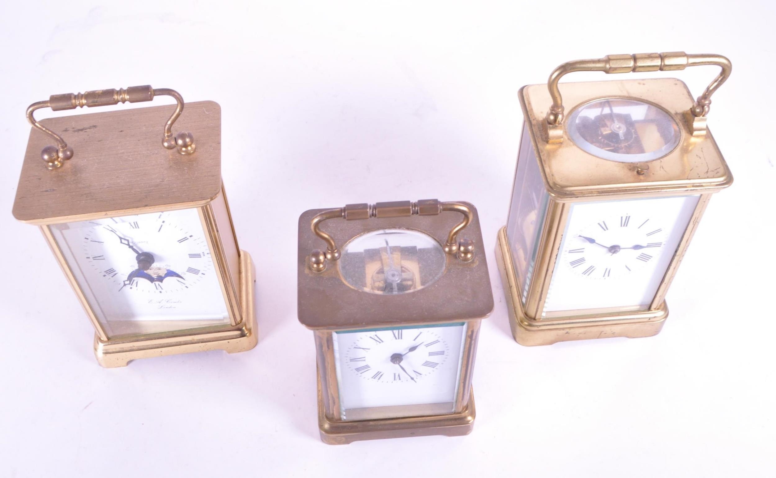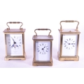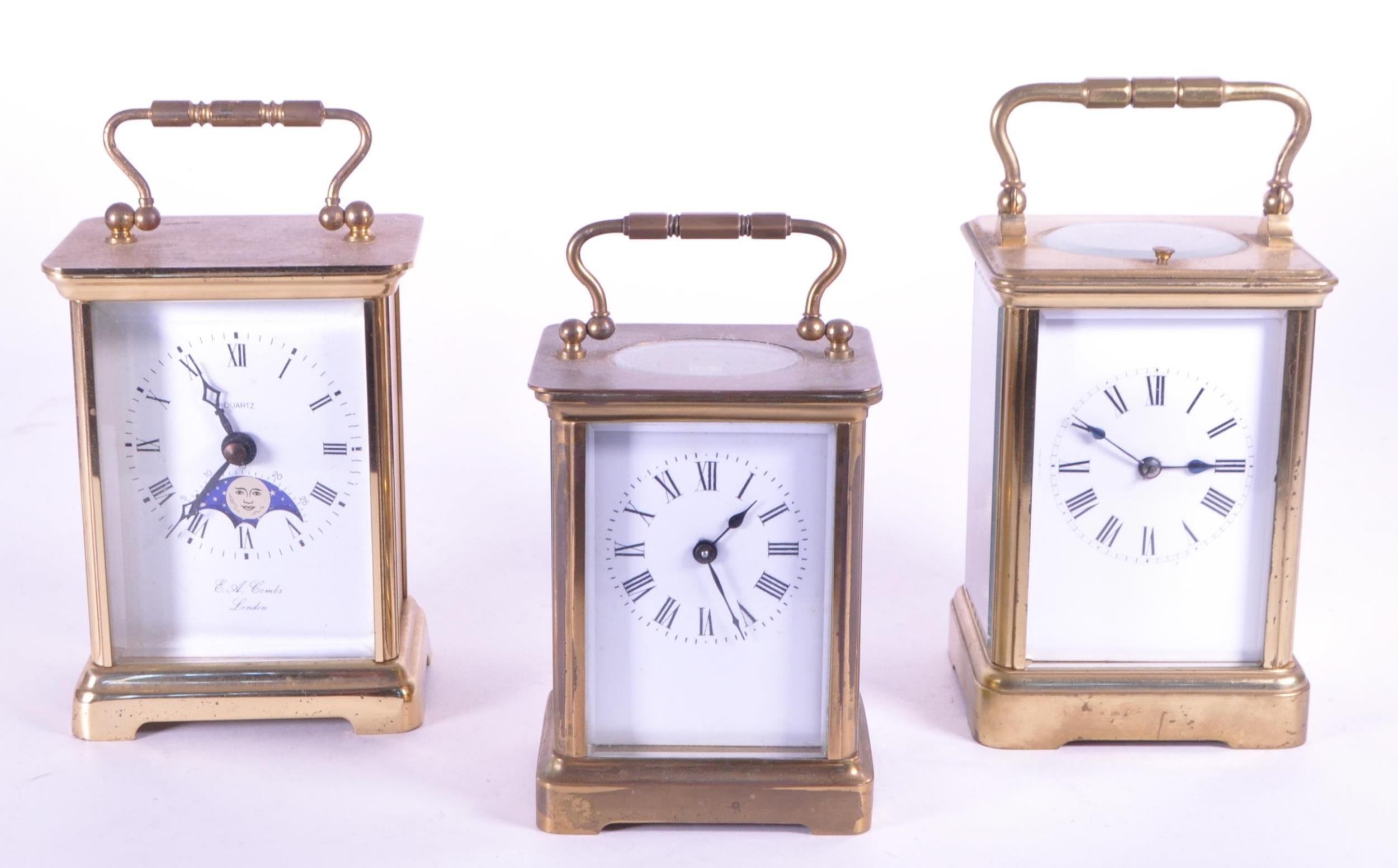 Three 20th century brass carriage clocks. Comprised of an E. A. Combs London Quartz carriage clock, a French A.C.C carriage clock, and an early 20th century carriage clock. All with bevel glazed fronts, handle atop, white clock faces and Roman numeral chapter rings. Largest measuring approx. 13cm x 6.5cm x 9cm.