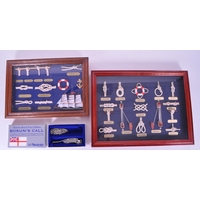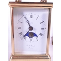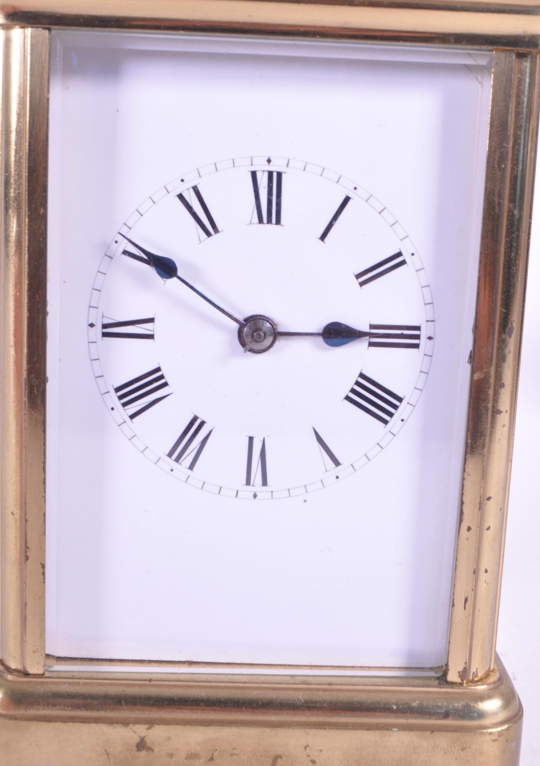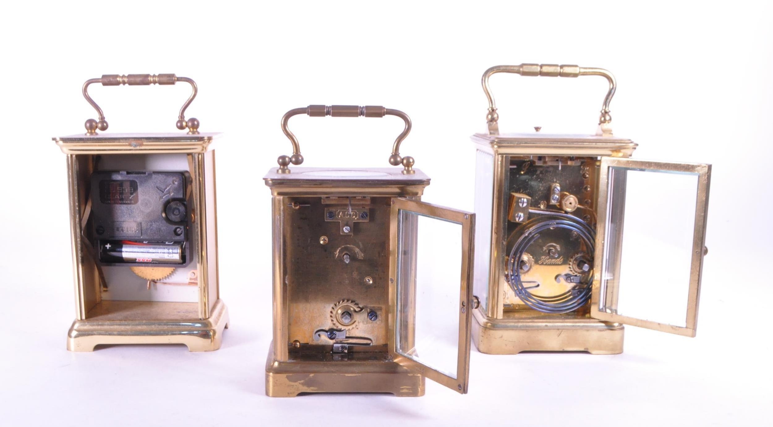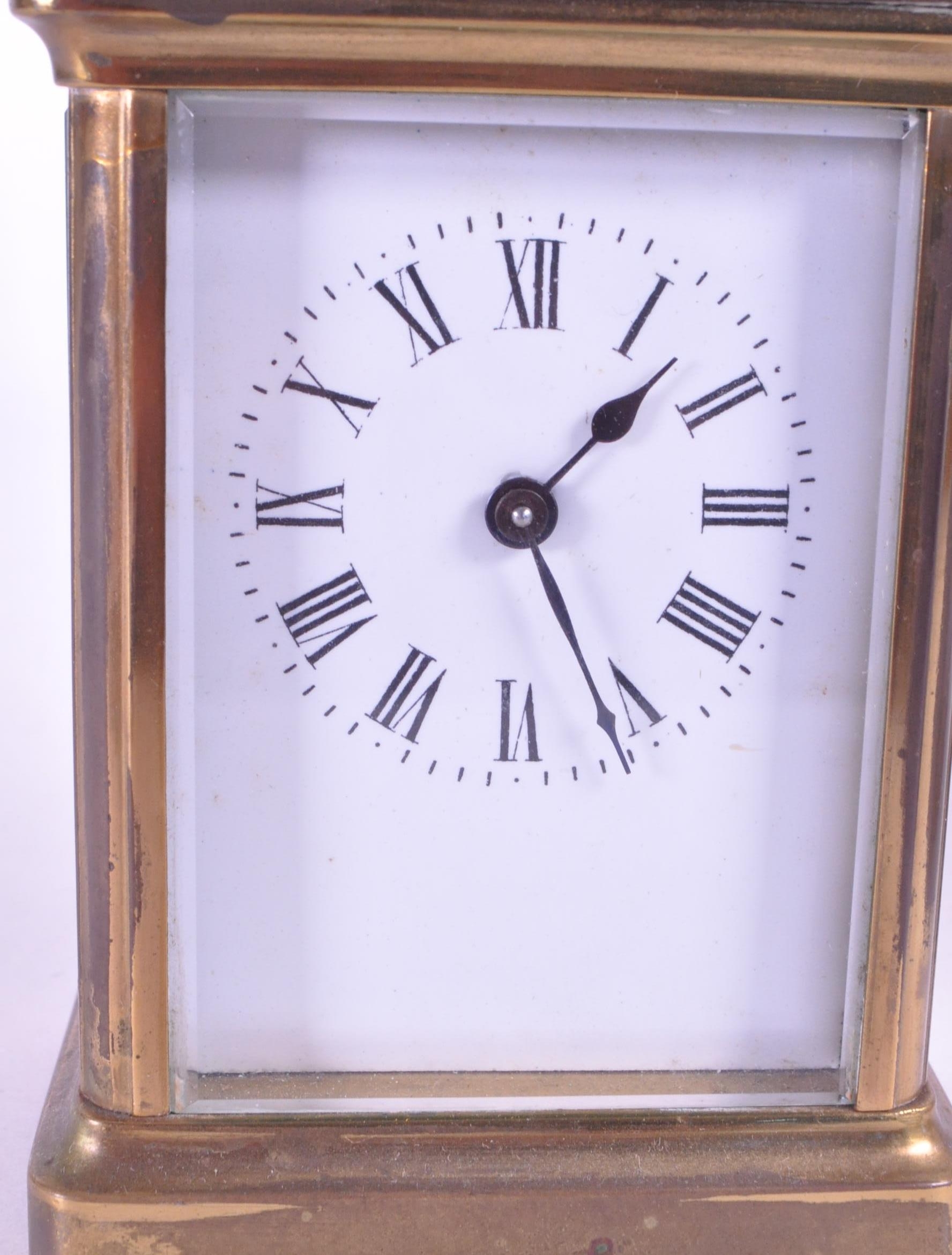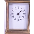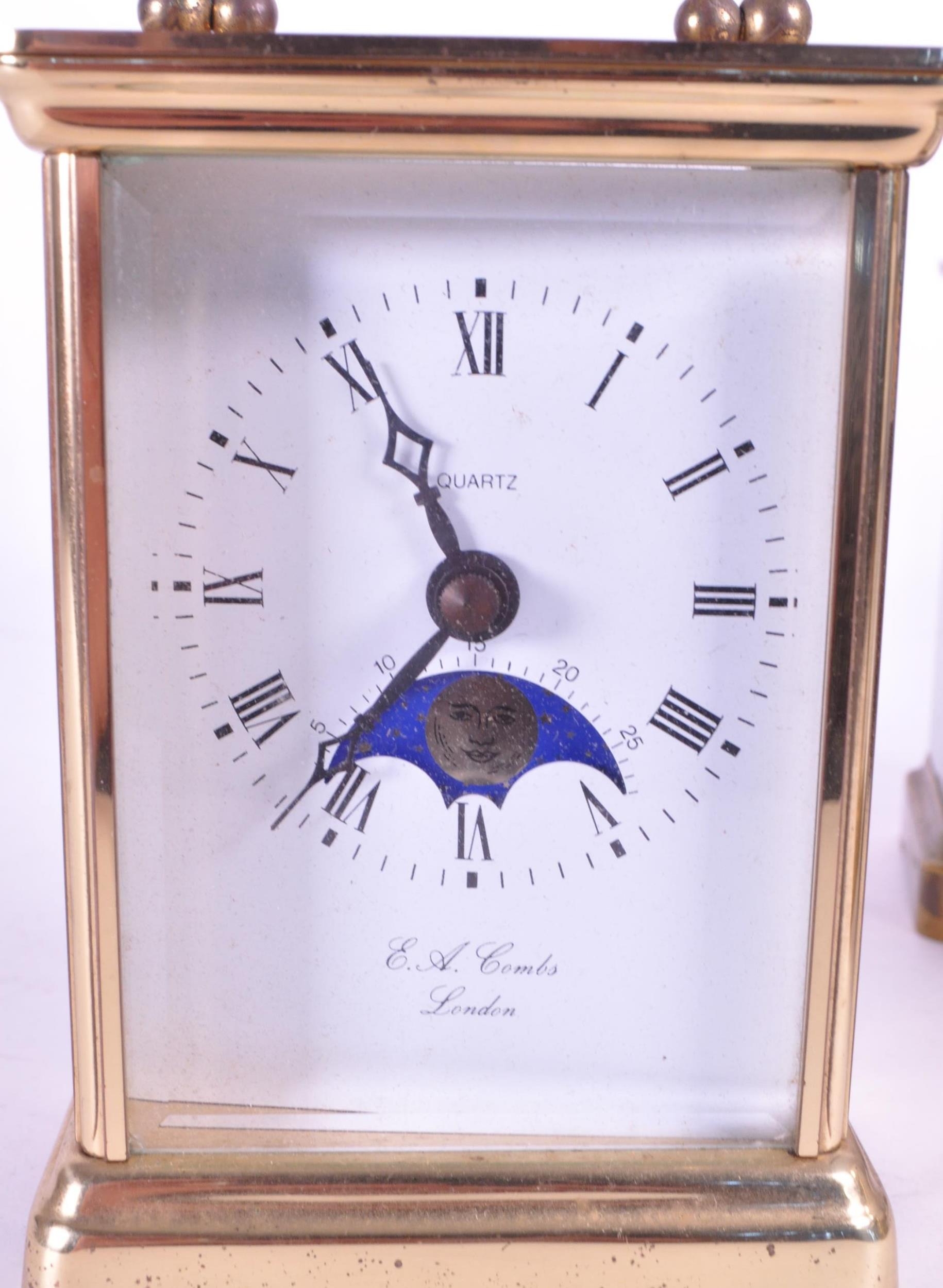 Three 20th century brass carriage clocks. Comprised of an E. A. Combs London Quartz carriage clock, a French A.C.C carriage clock, and an early 20th century carriage clock. All with bevel glazed fronts, handle atop, white clock faces and Roman numeral chapter rings. Largest measuring approx. 13cm x 6.5cm x 9cm.