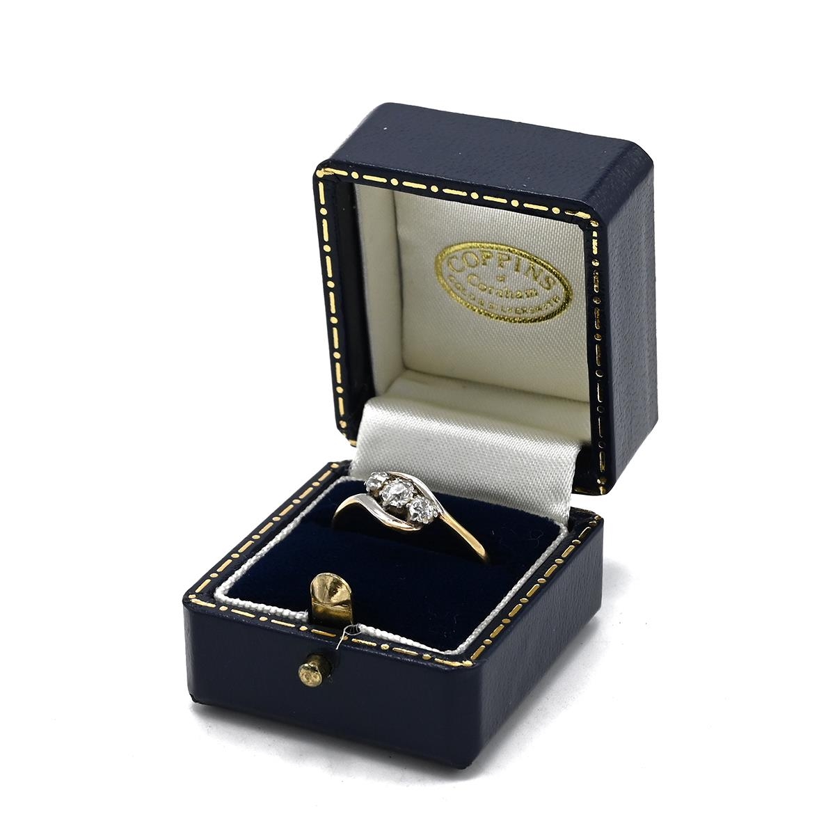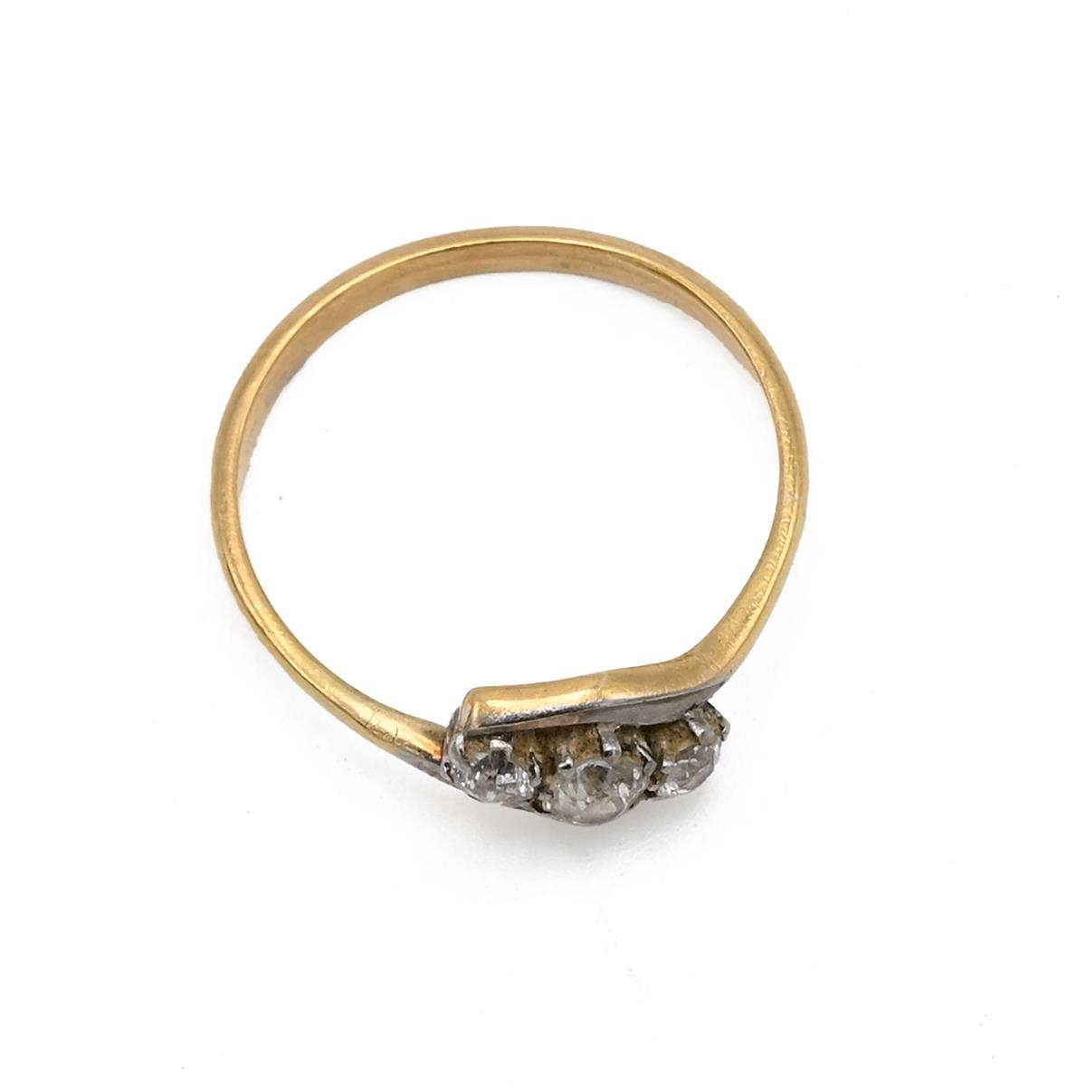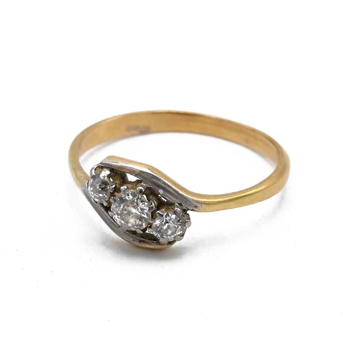 An 18ct gold and three stone diamond crossover ring, the brilliant cut stones weighing approximately 0.45 carats, finger size O, 2.14 grams. (J)