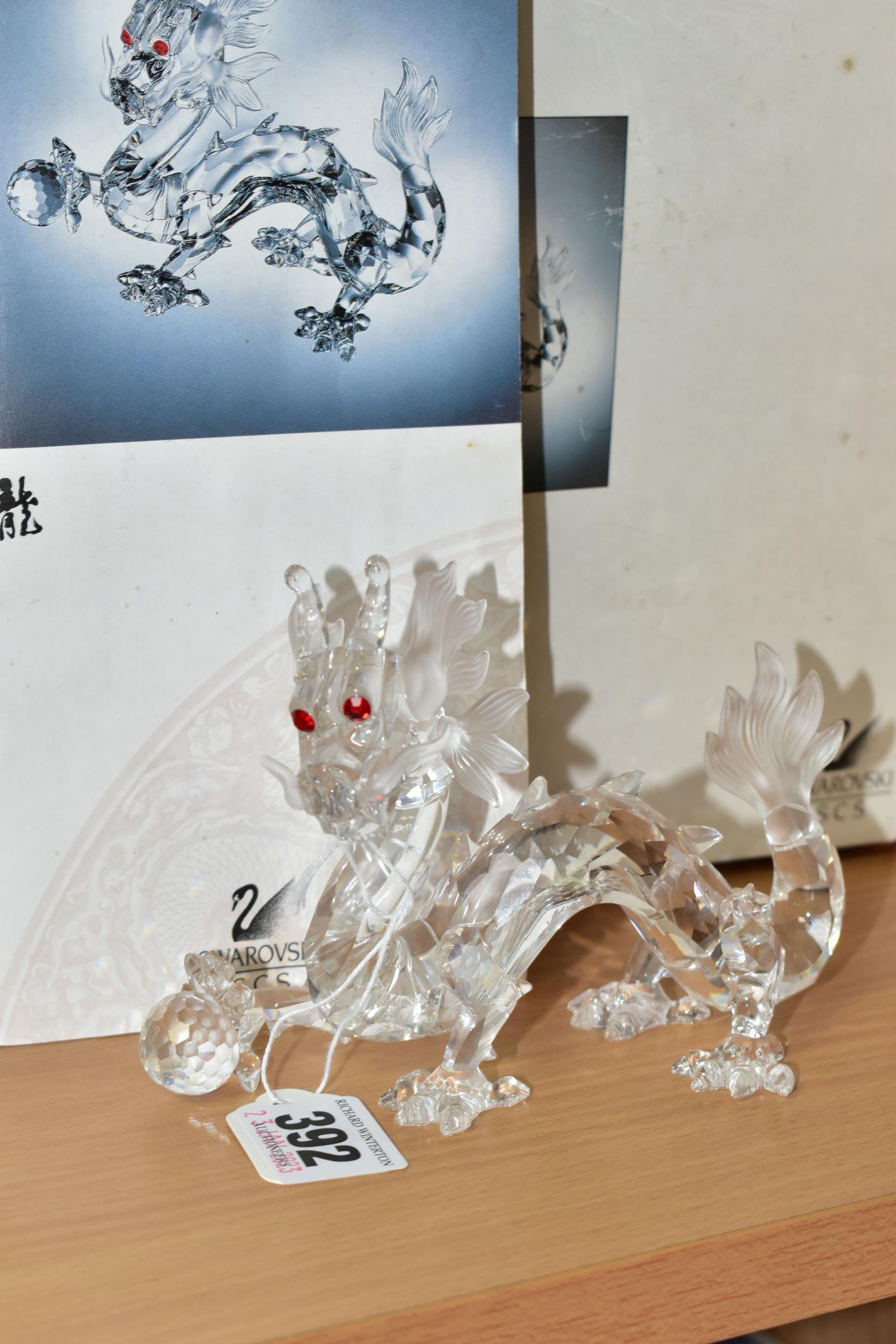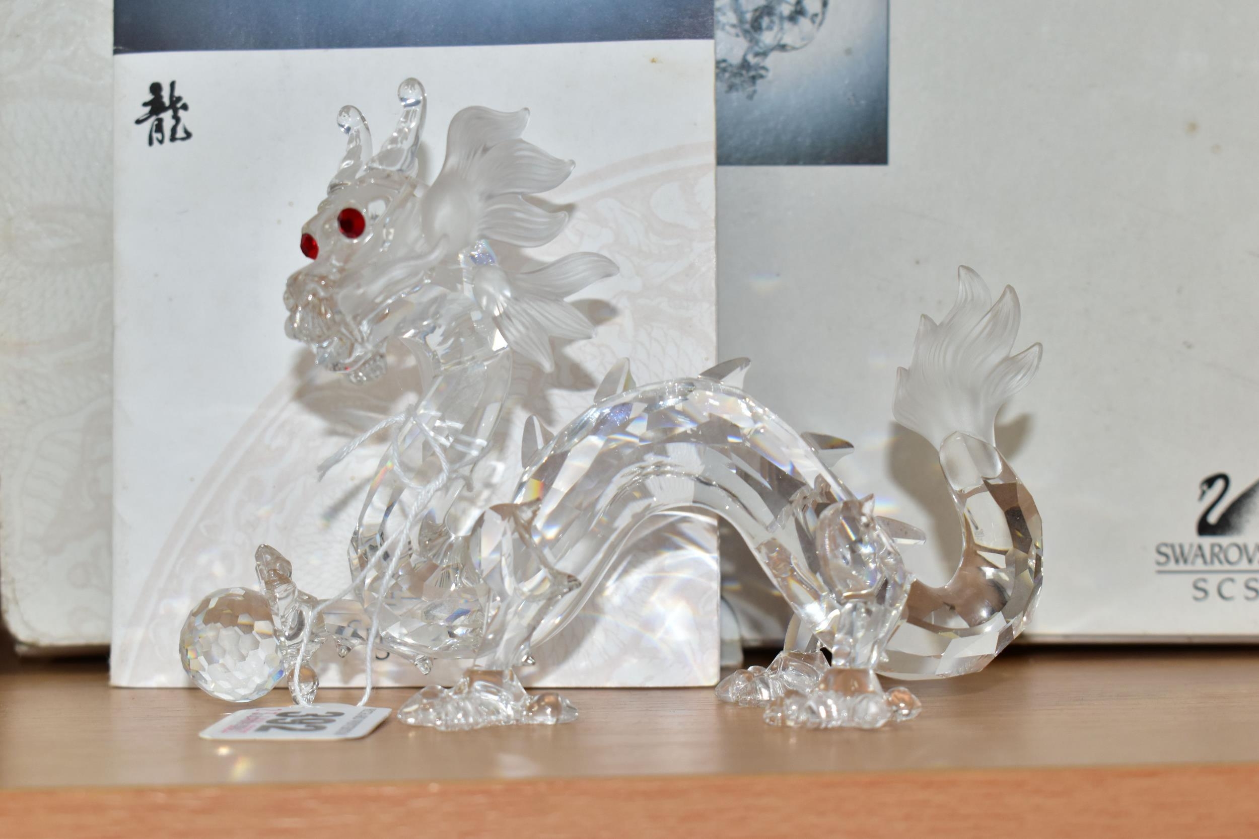A BOXED SWAROVSKI COLLECTORS SOCIETY ANNUAL FIGURE FROM FABULOUS CREATURES TRILOGY - THE DRAGON 1997 (208398), designed by Gabriele Stamey, height 9.5cm x length 13cm, with certificate leaflet (1 + box + leaflet) (Condition Report: figure appears in good condition with no obvious damage, some wear to box, box a little dirty)