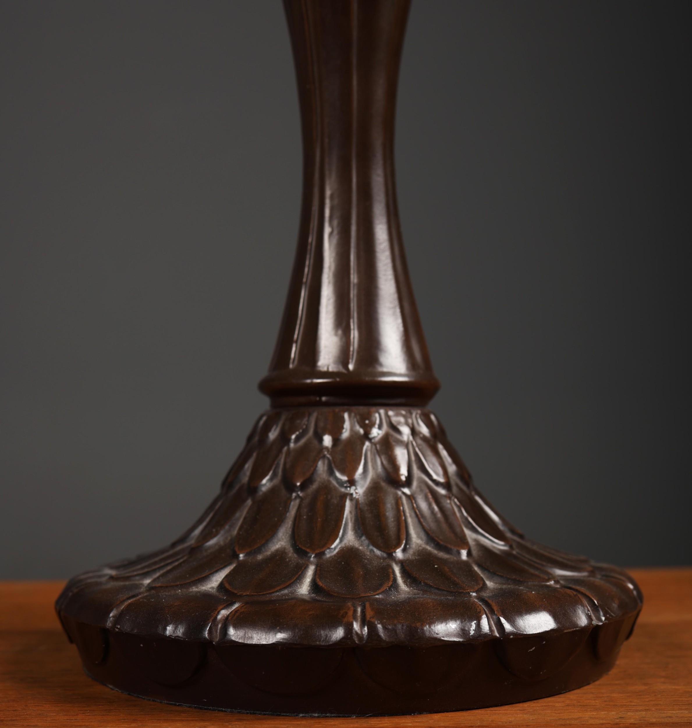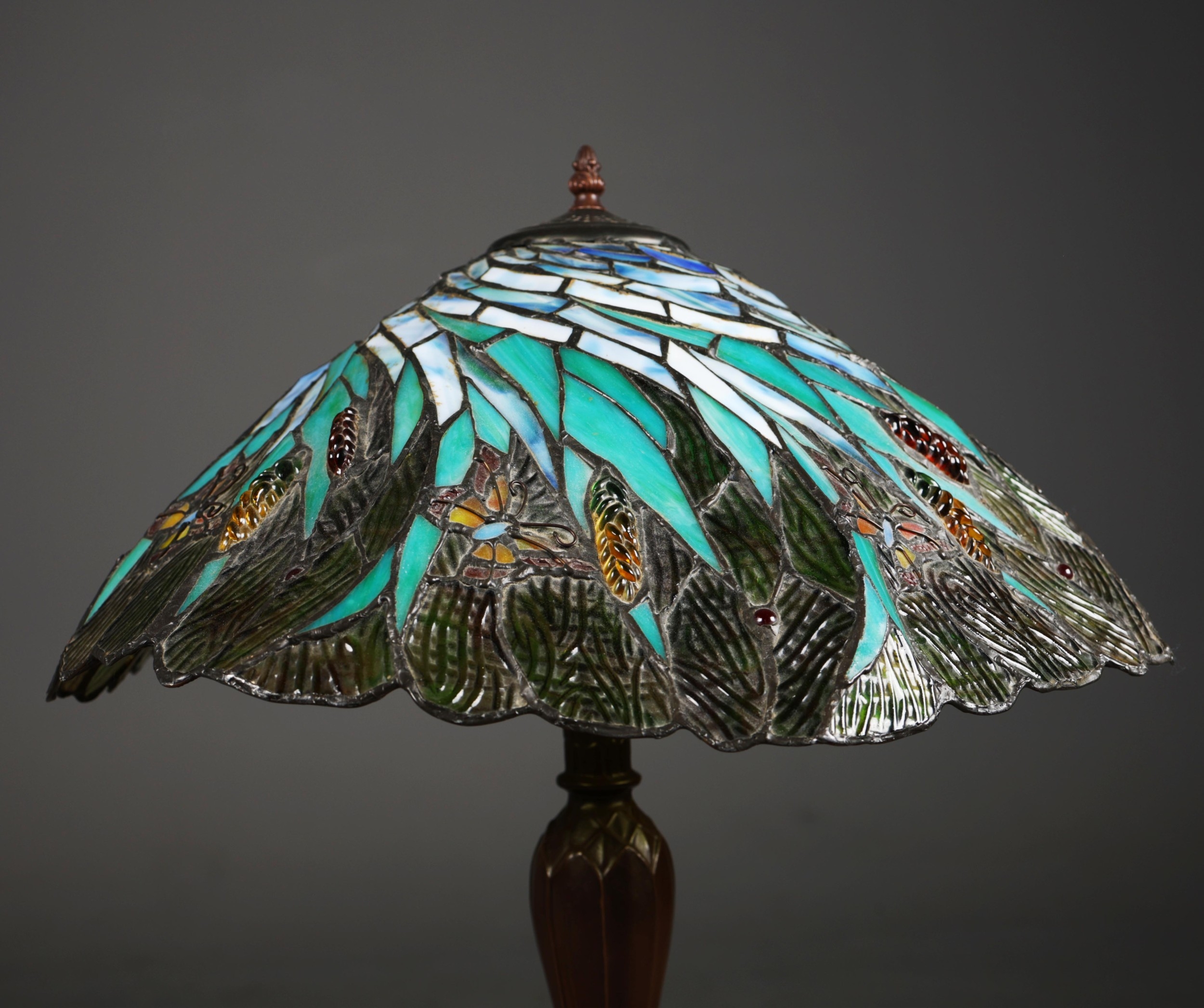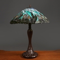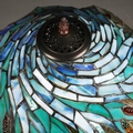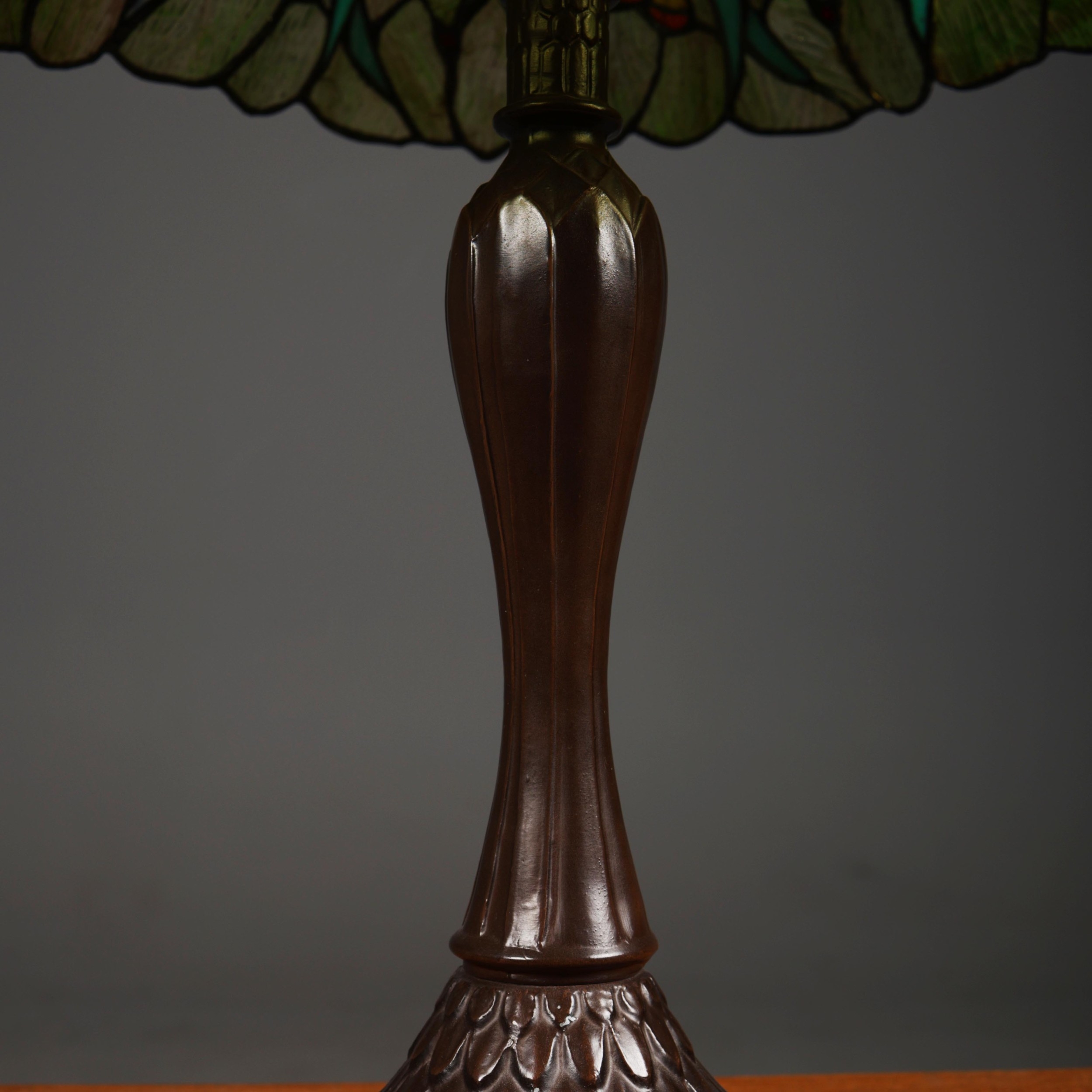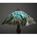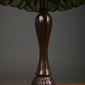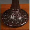 TIFFANY STYLE TABLE LAMP. the shade with a swirling stylised foliage design, bronzed base, raised on a spreading foot in the form of a pineapple, 64cm high.