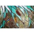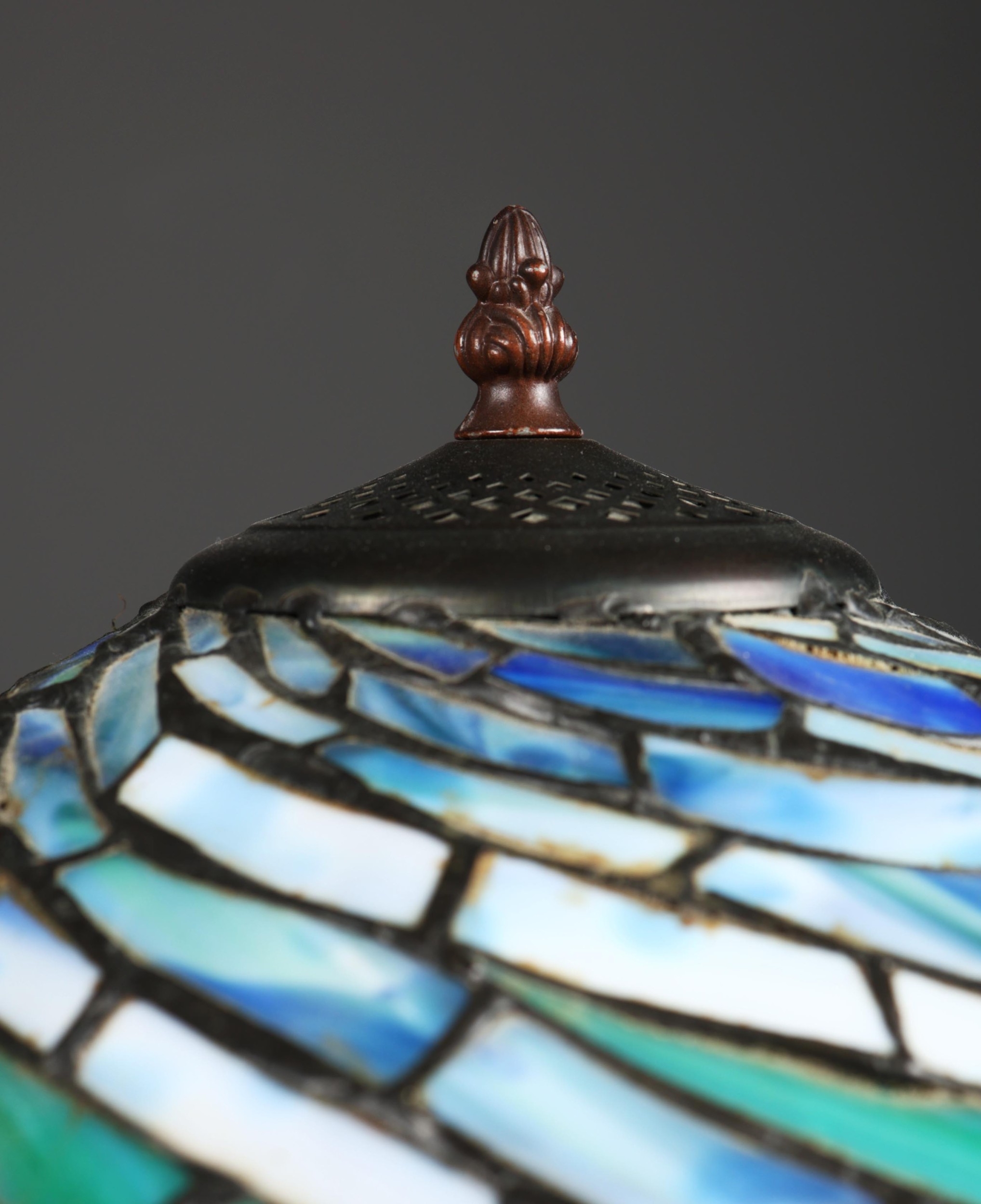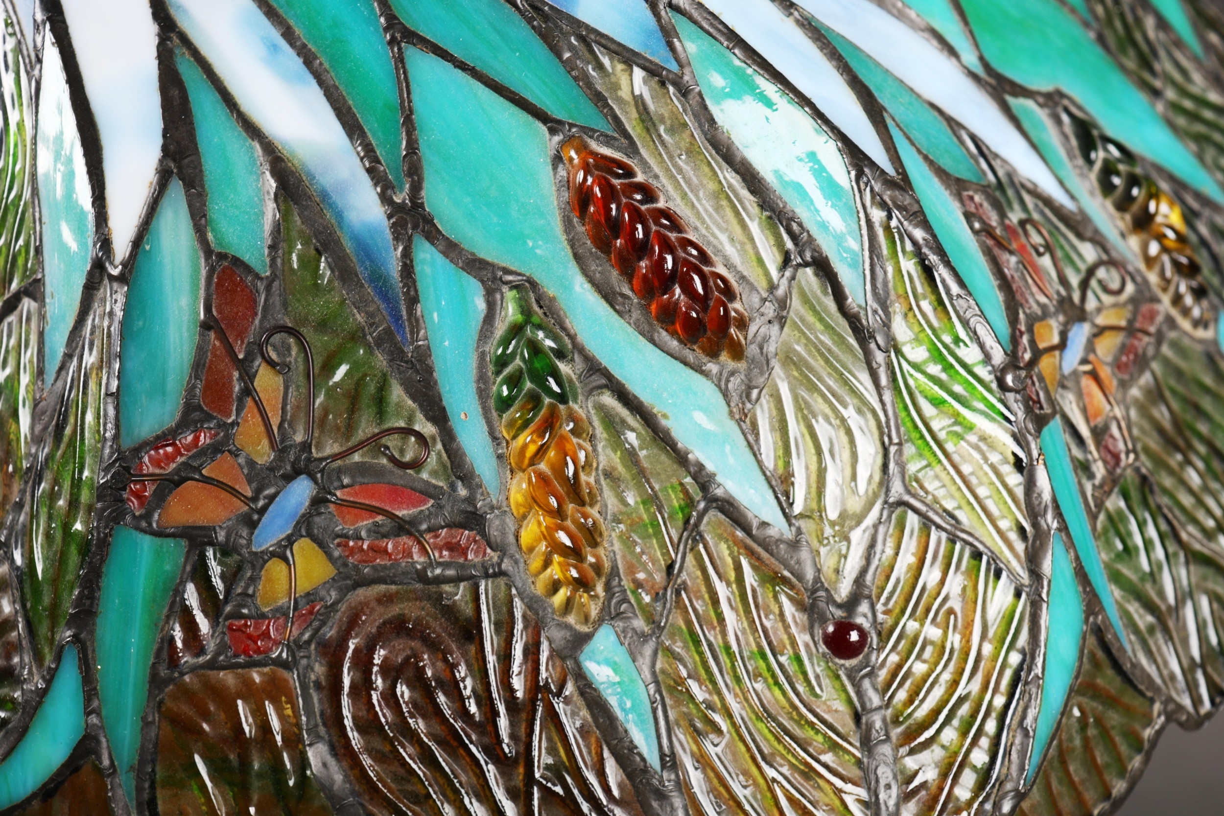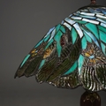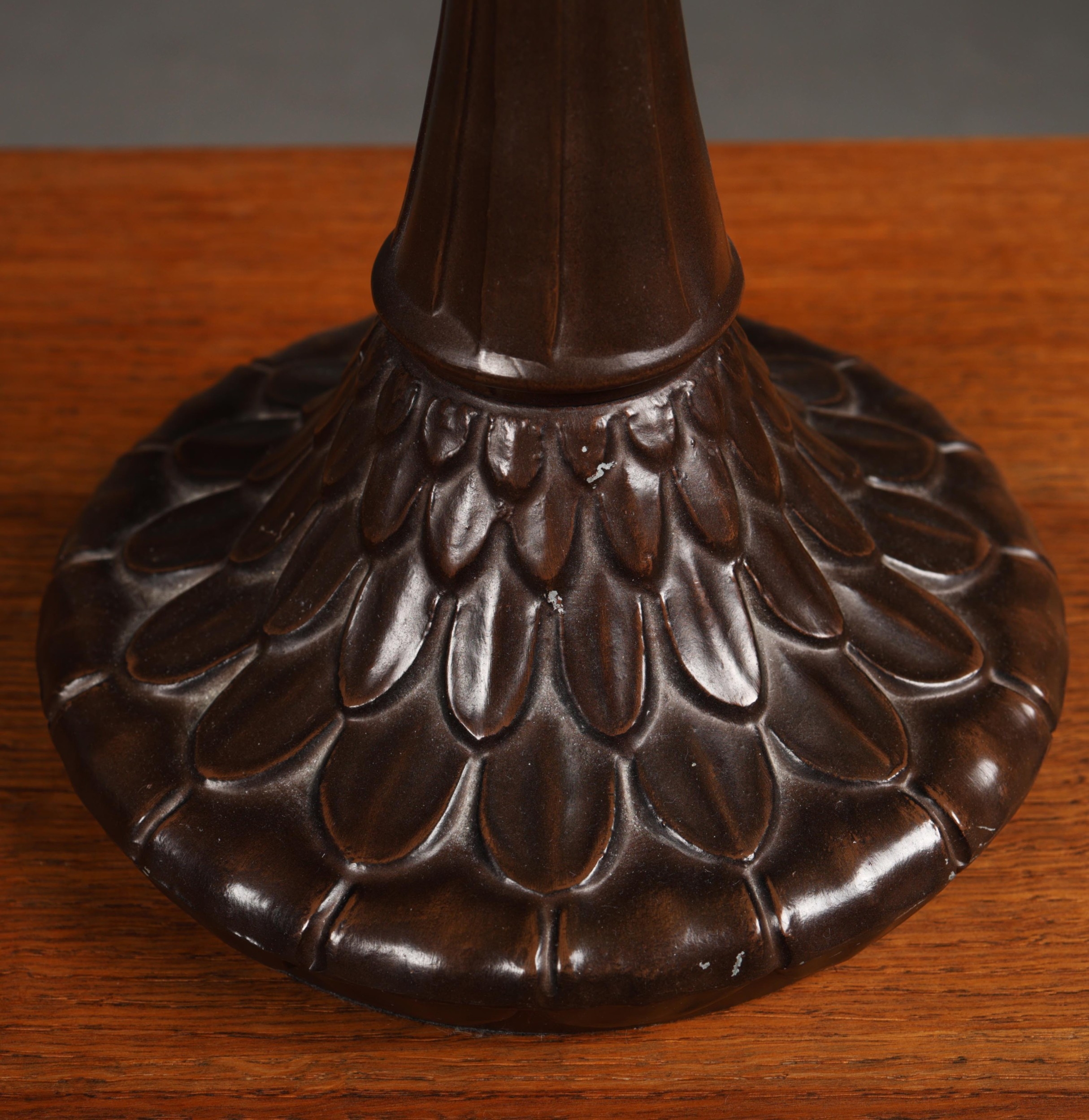 TIFFANY STYLE TABLE LAMP. the shade with a swirling stylised foliage design, bronzed base, raised on a spreading foot in the form of a pineapple, 64cm high.