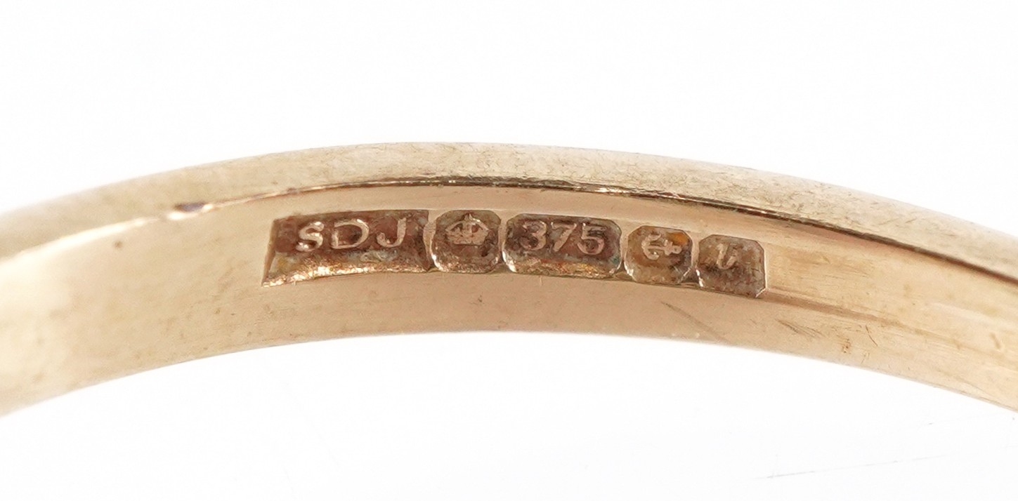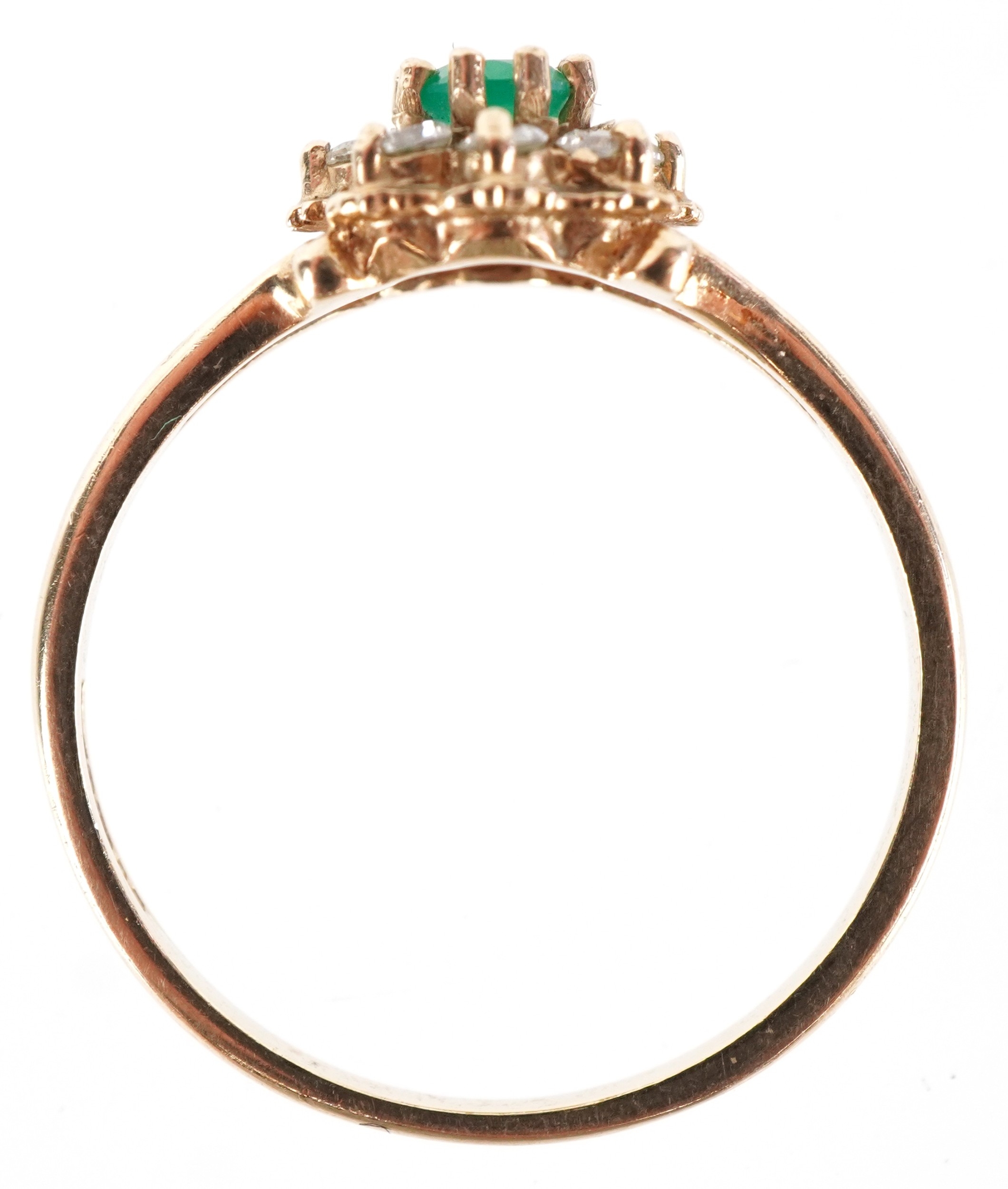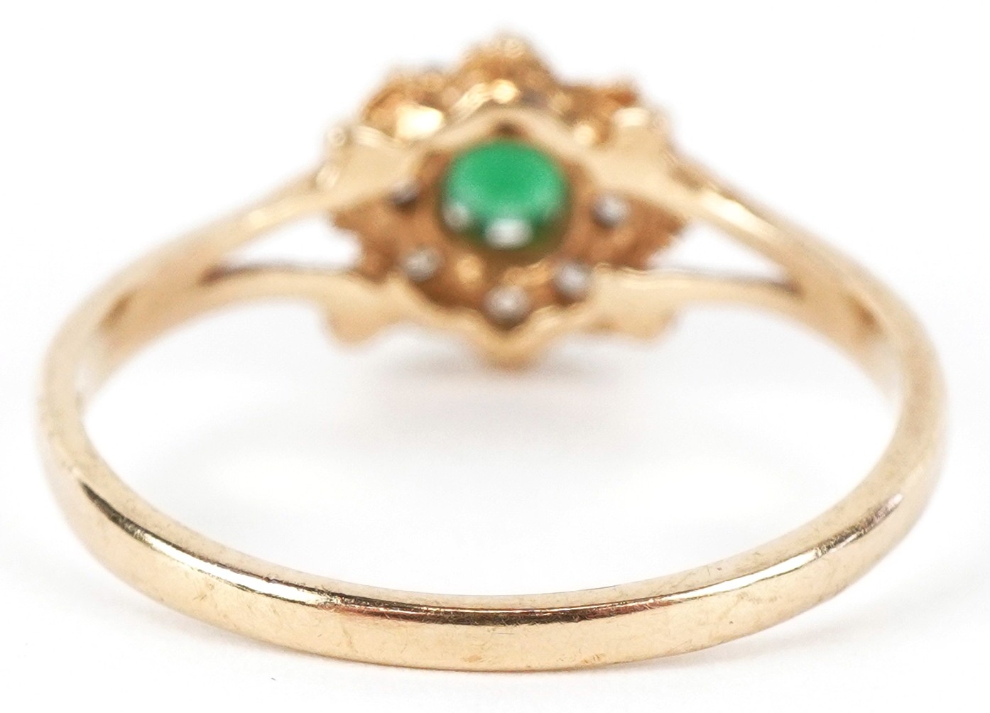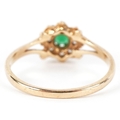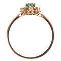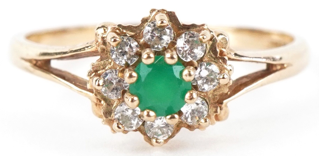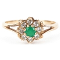 A 9ct gold green stone and clear stone flower head ring with split shoulders, size M, 1.6g.