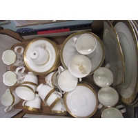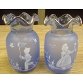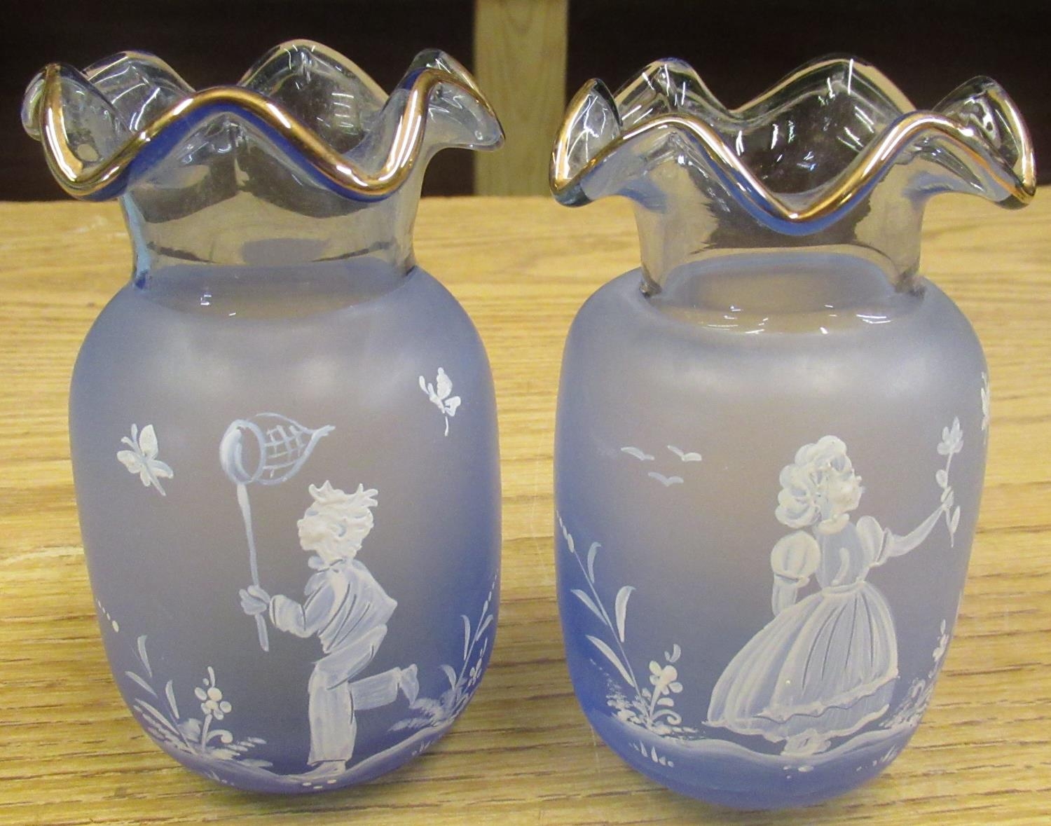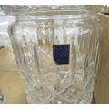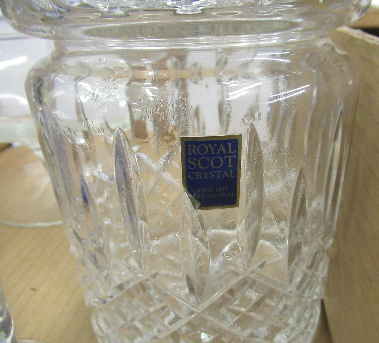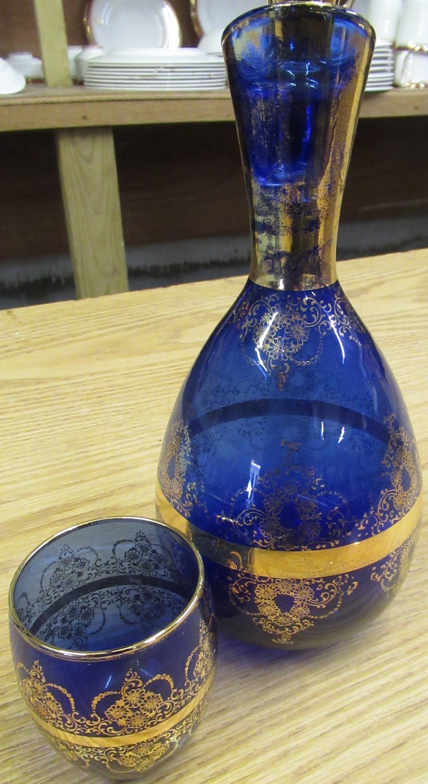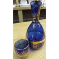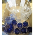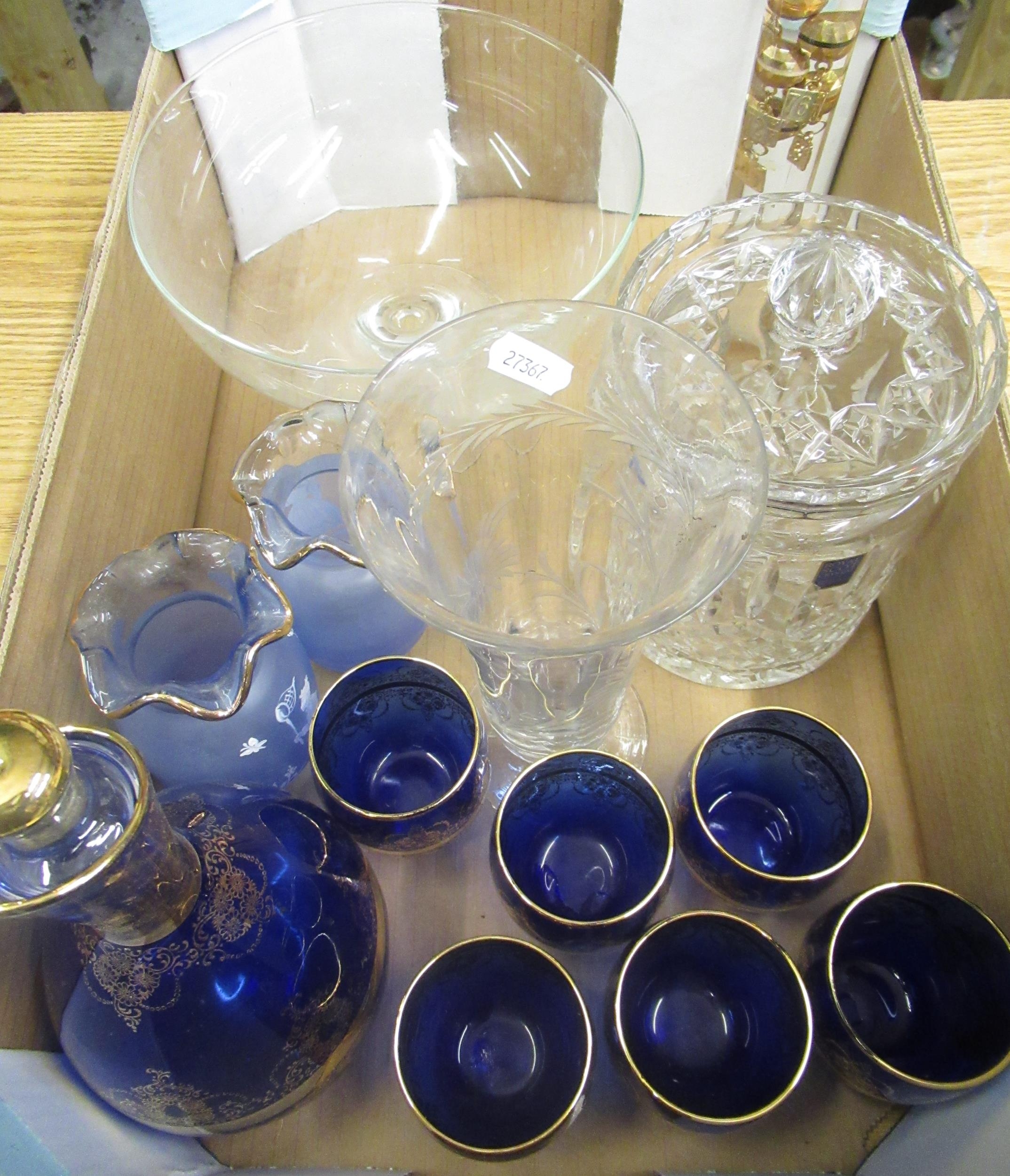 Blue and gilt glass decanter with six matching glasses, two small blue glass vases with painted children detail, Royal Scot crystal storage jar, etc