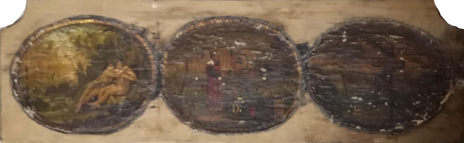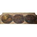 A 17TH CENTURY ENGLISH PANEL OF THREE VIEWS OF THE GARDEN OF EDENTo include Adam and Eve under a tree and a Serpent around a cross. (w 73cm x h 23cm)