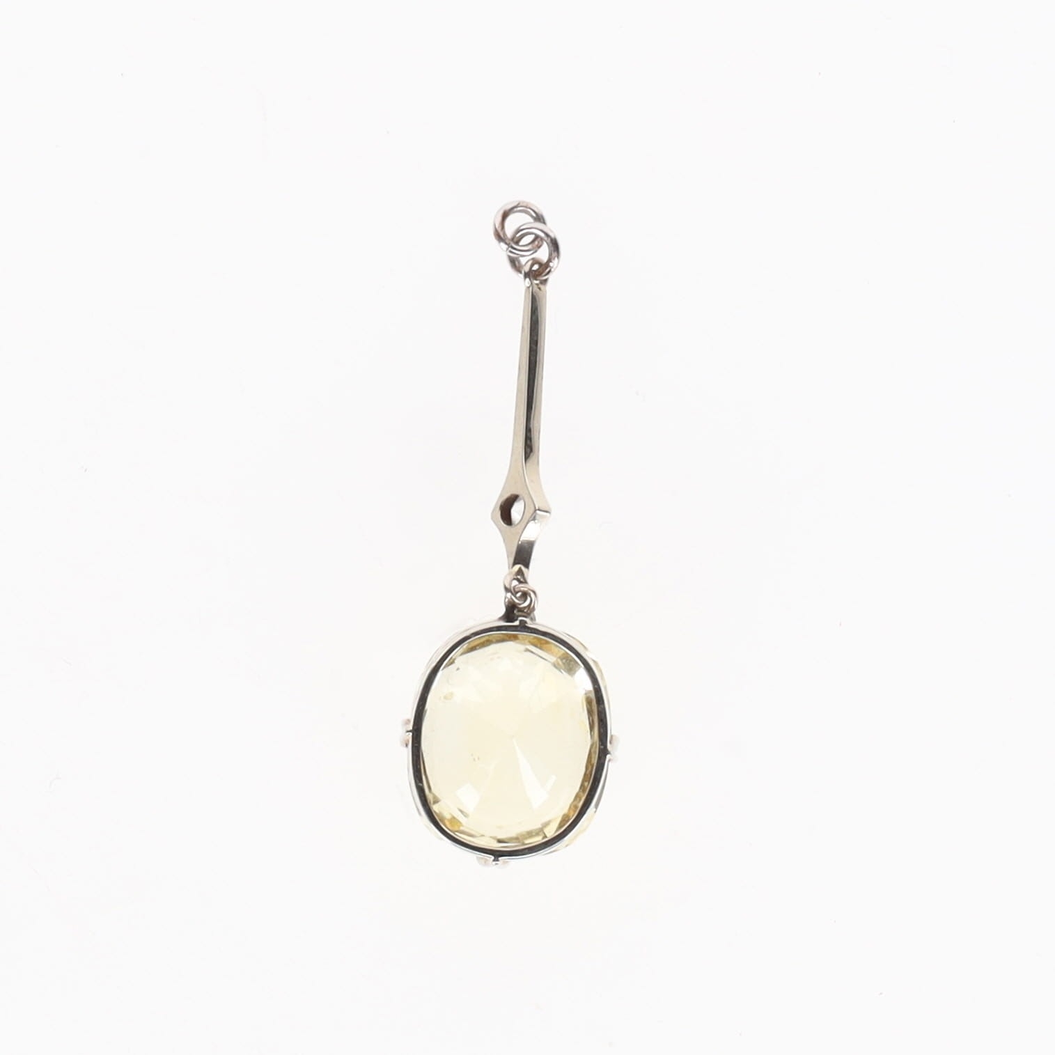 Yellow Sapphire and Diamond Gold Pendant with replacement 18ct gold chain. This piece has been tested as 18ct gold and the chain is stamped 750 on the clasp. The pendant itself measures 3.7cm in length and the replacement chain is 39cm. The approximate dimensions of the sapphire are 1.5 x 1.3cm and a depth of 8mm.