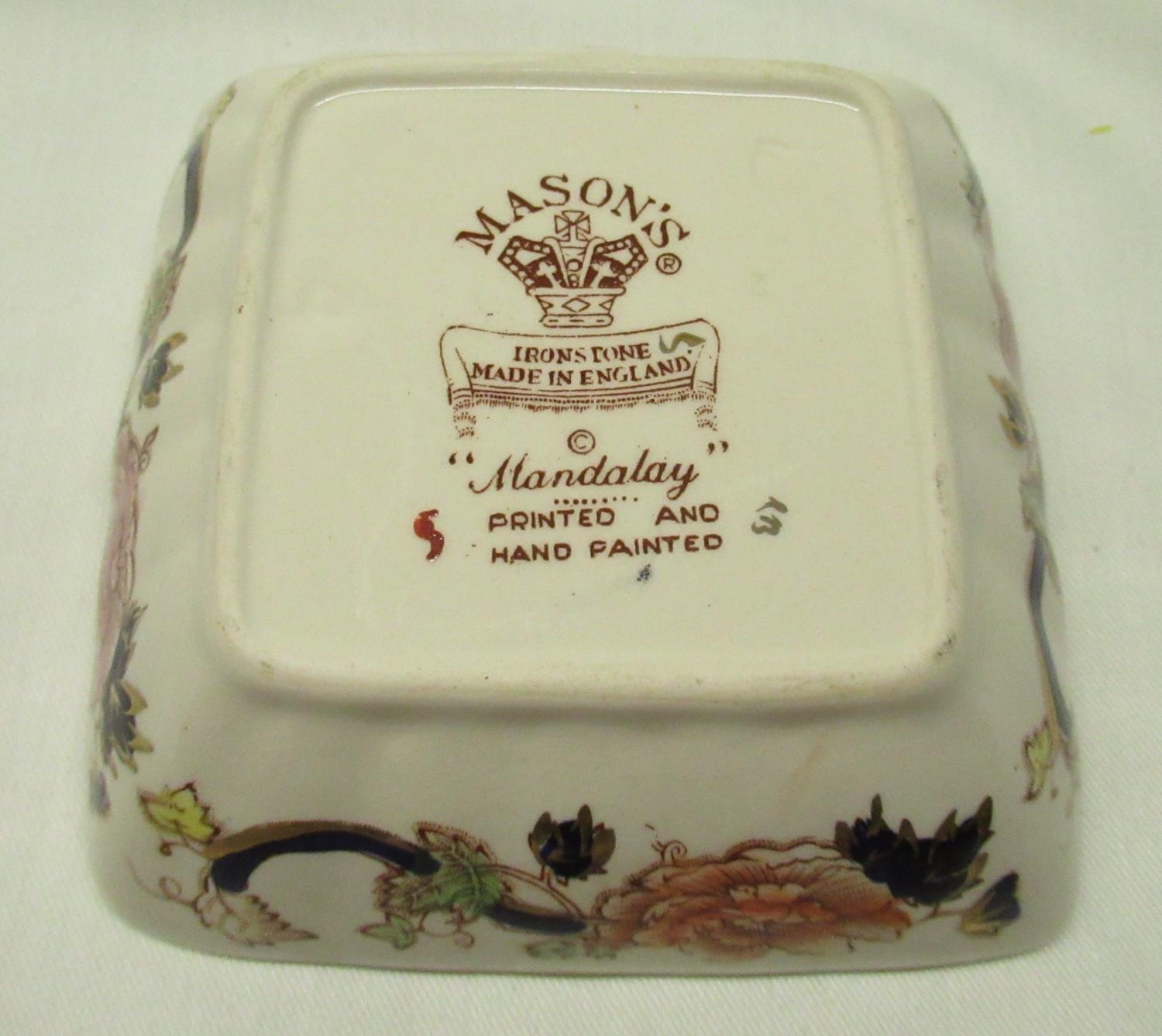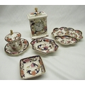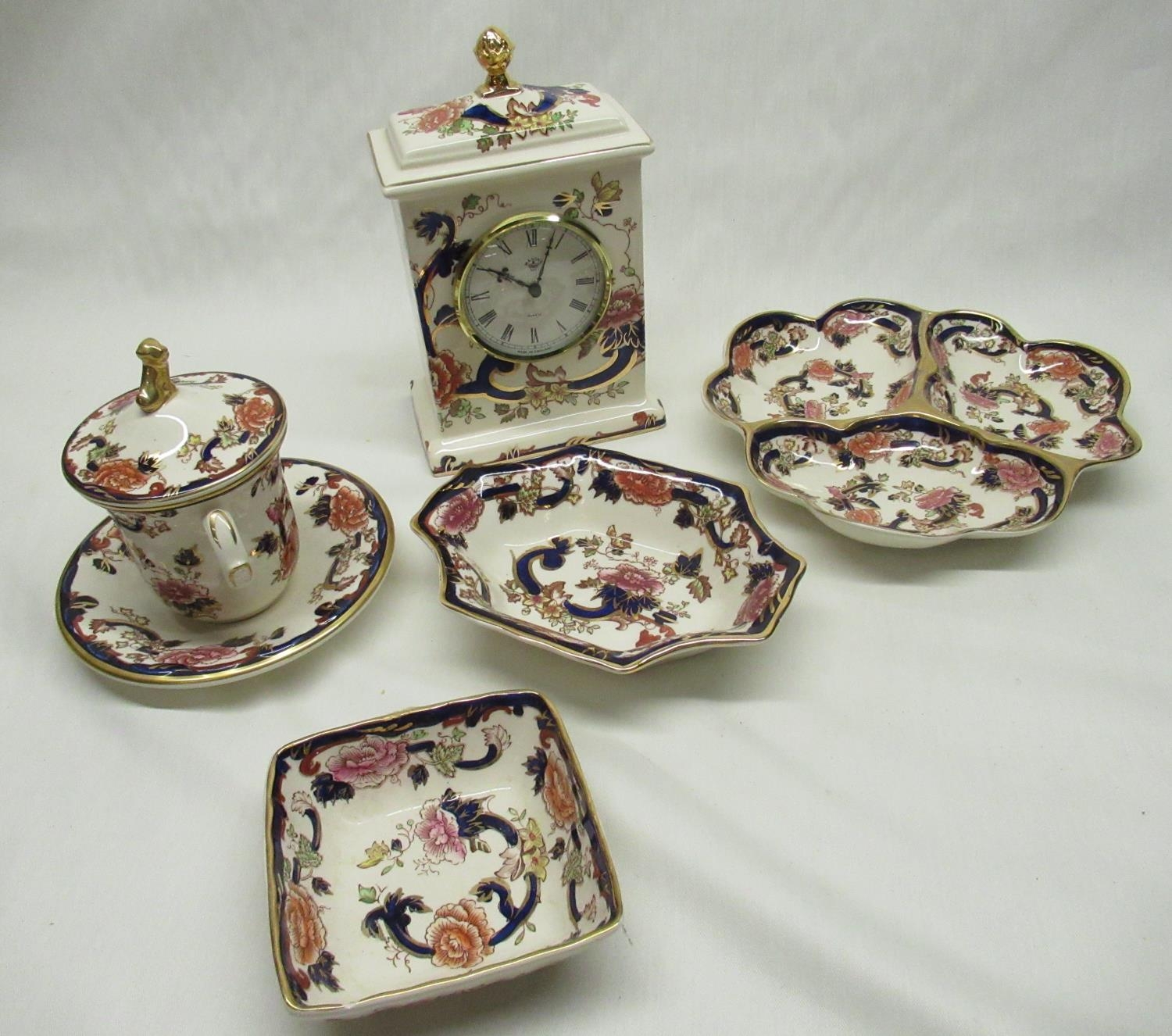 Mason's Mandalay pattern mantle clock with quartz movement and gilt finial H21cm, three section dish D20, two other dishes a chocolate cup and cover with lion finial on stand H15cm (5)