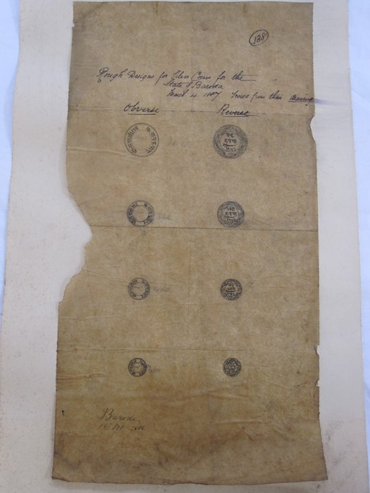 'Rough Designs for Silver Coins for the State of Baroda, March 4th 1887', with obverse and reverse drawings on paper