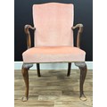 A George l style mahogany library chair, reupholstered in pink velvet fabric, nicely carved Shepard’s crook arms, cabriole front legs with out-swept back legs, 95cm high, 62cm wide, 37cm seat depth