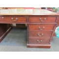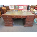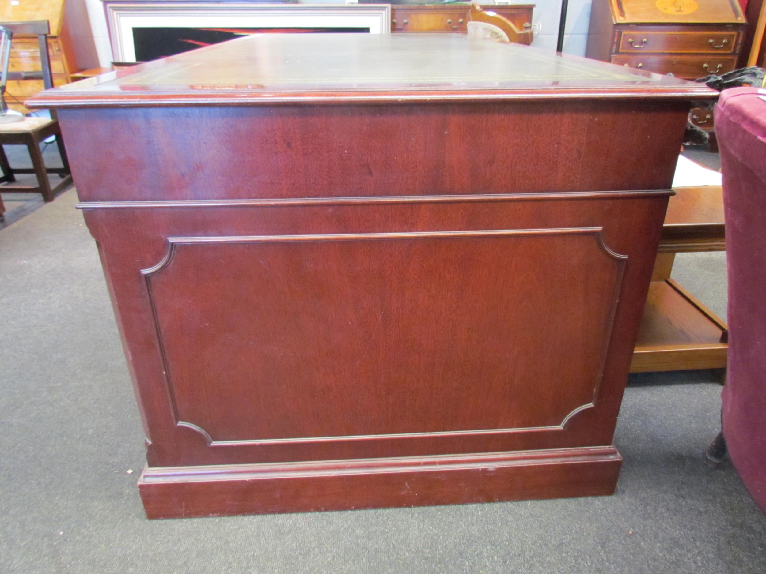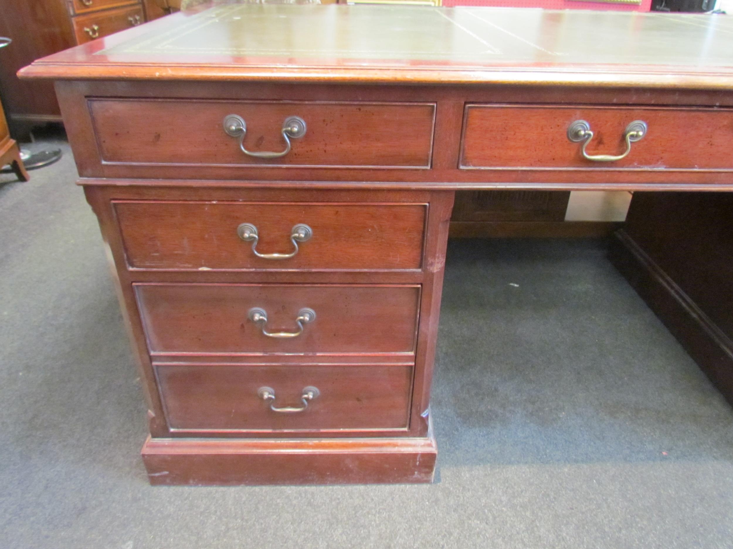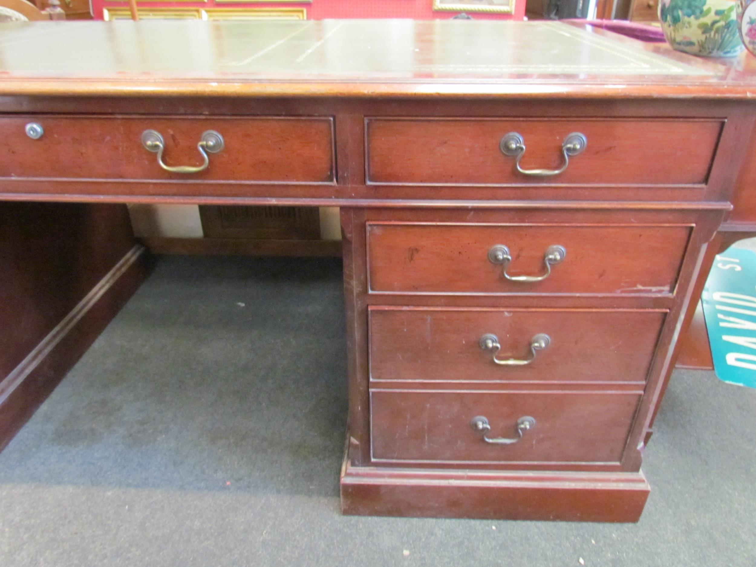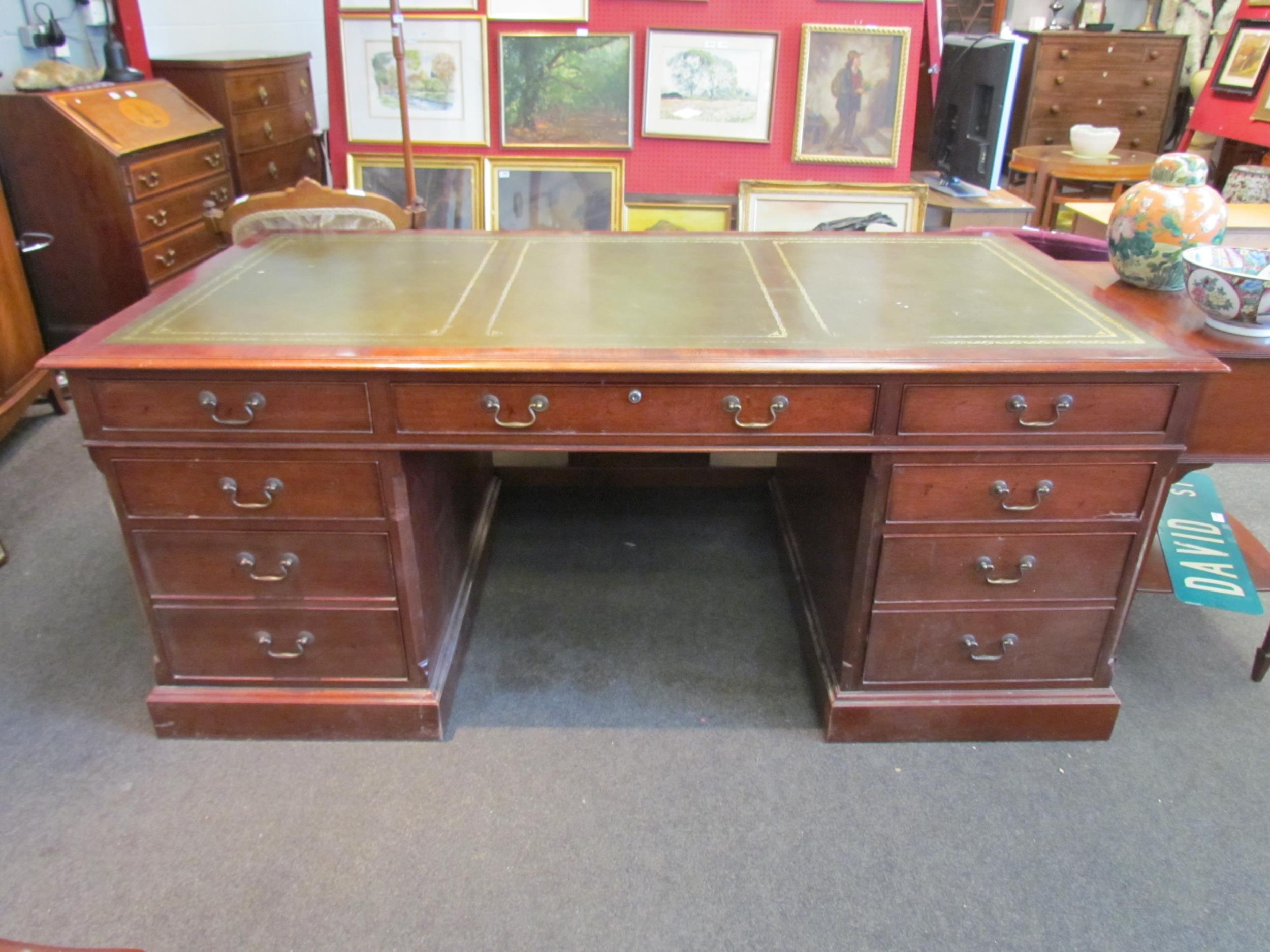 A Norfolk Manor twin pedestal mahogany desk, seven drawers, gilt tooled green leather insert, 77cm high x 182cm wide x 90cm deep (E) £150-200