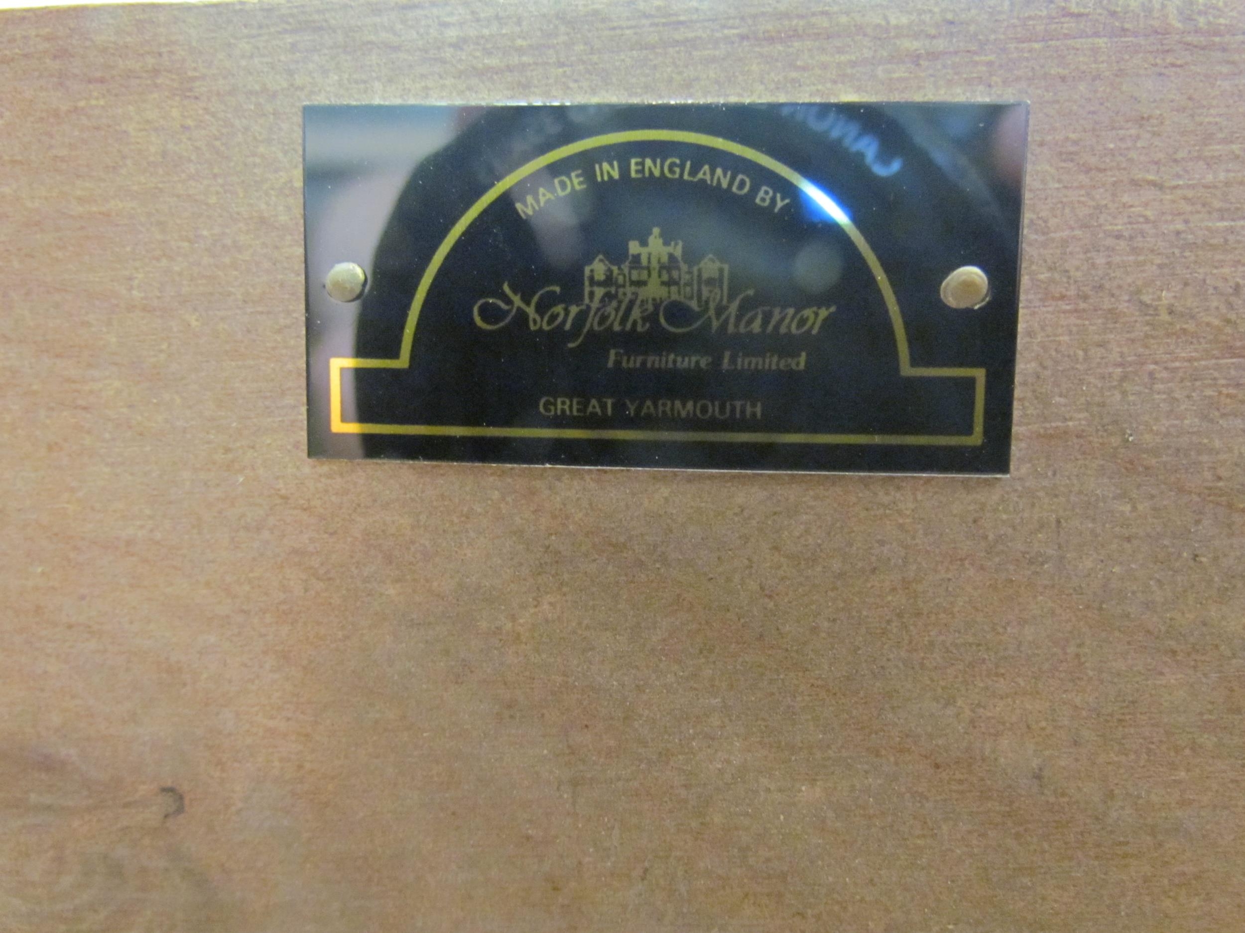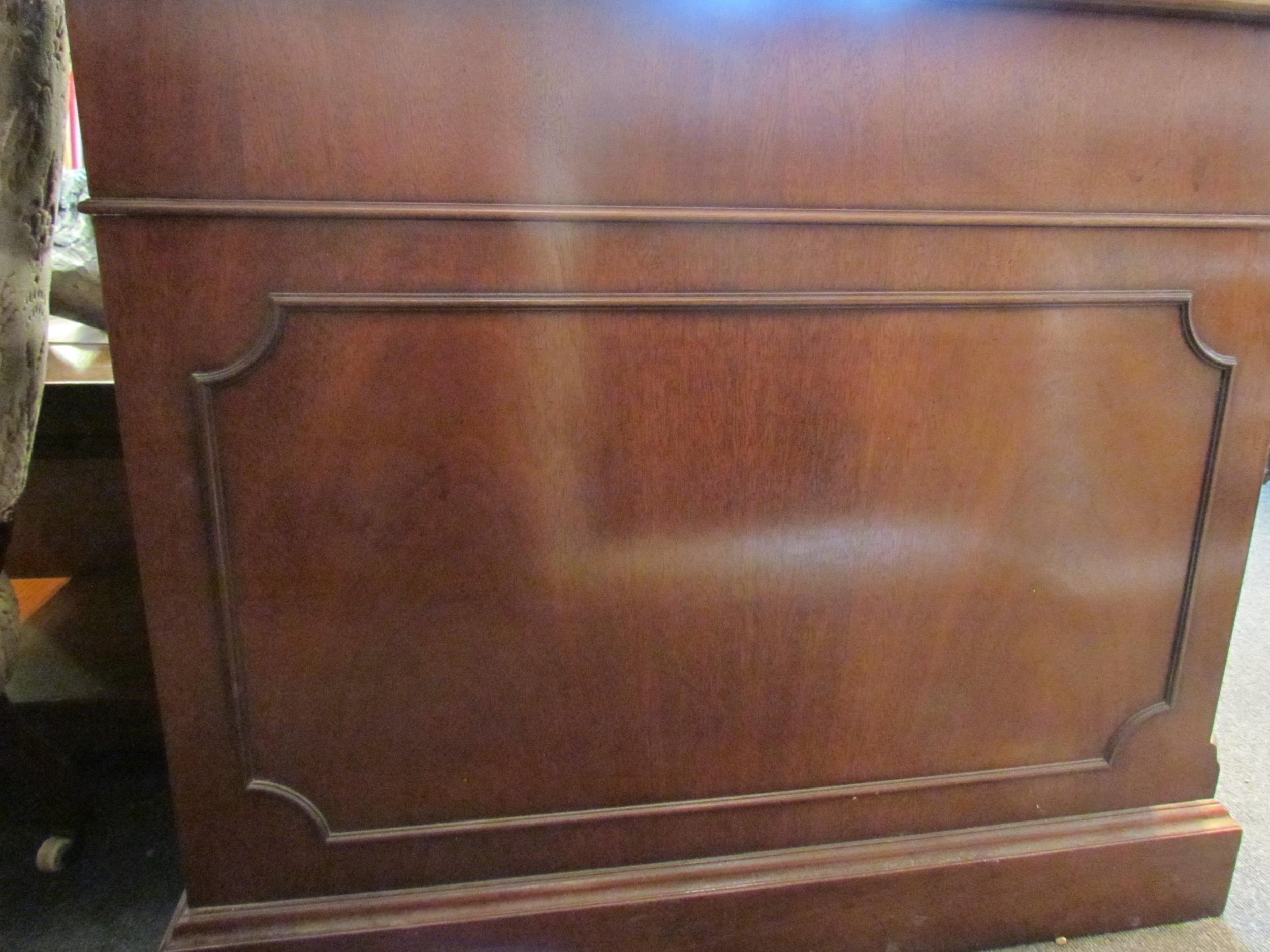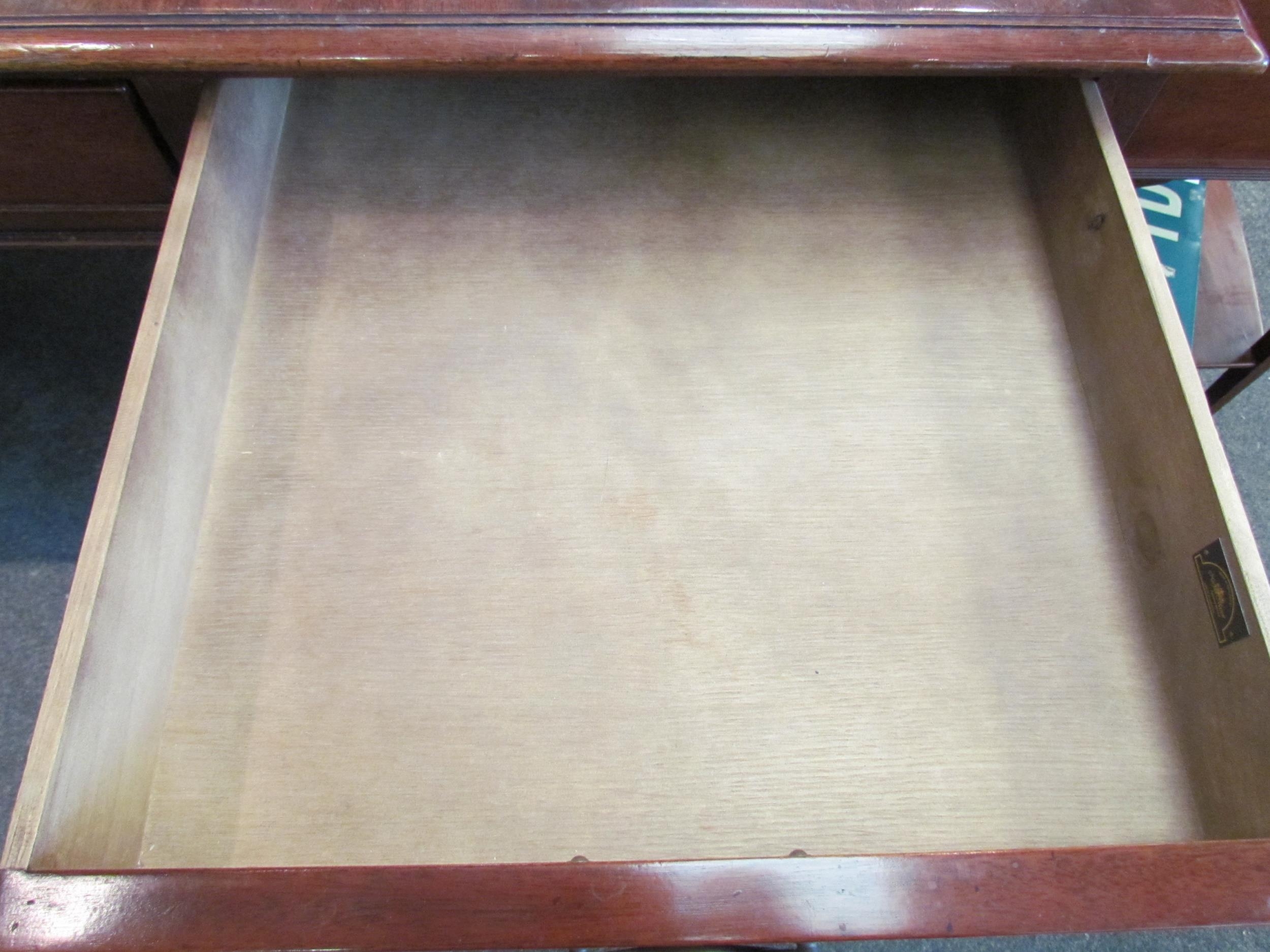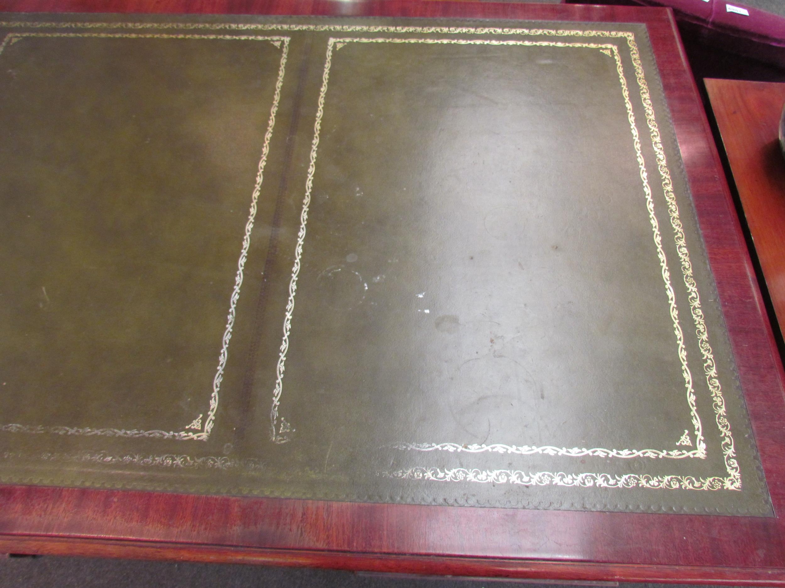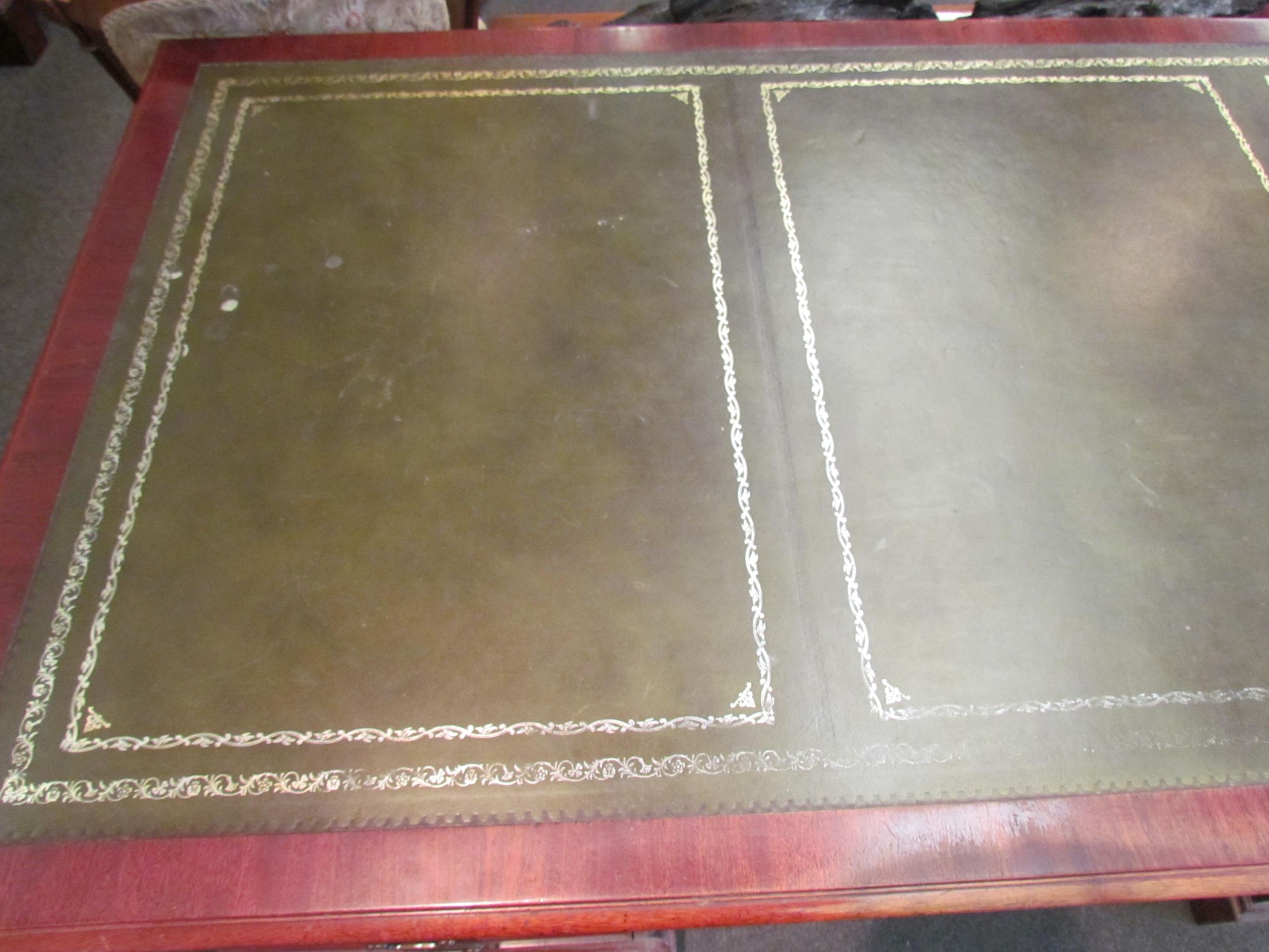 A Norfolk Manor twin pedestal mahogany desk, seven drawers, gilt tooled green leather insert, 77cm high x 182cm wide x 90cm deep (E) £150-200