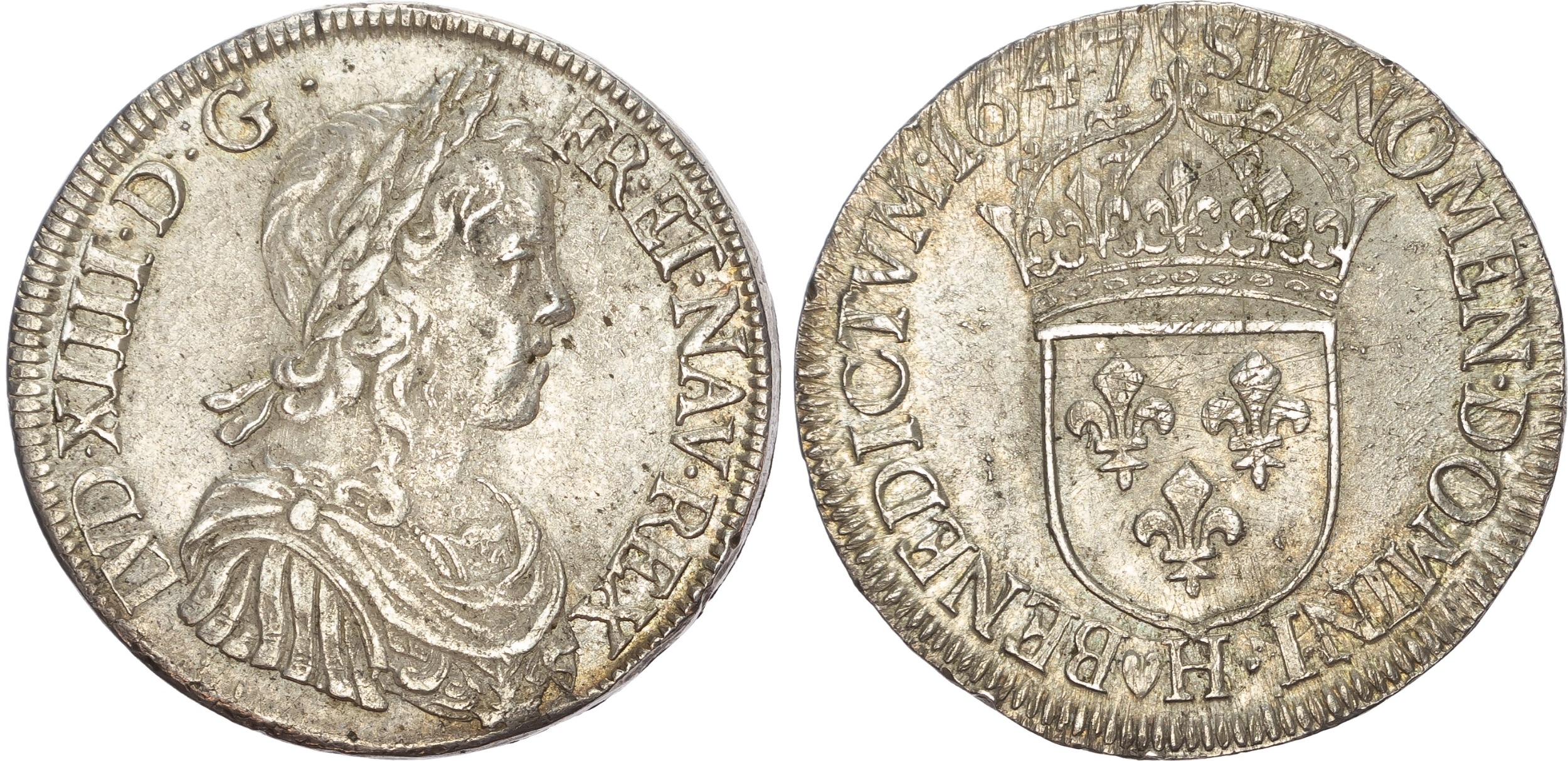 France, Louis XIV (1643-1715), silver Écu à la mèche longue, 1647 H, La Rochelle, 27.32g (Dupl. 1469; Gad. 202). Extremely Fine, adjustment marks to reverse.