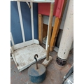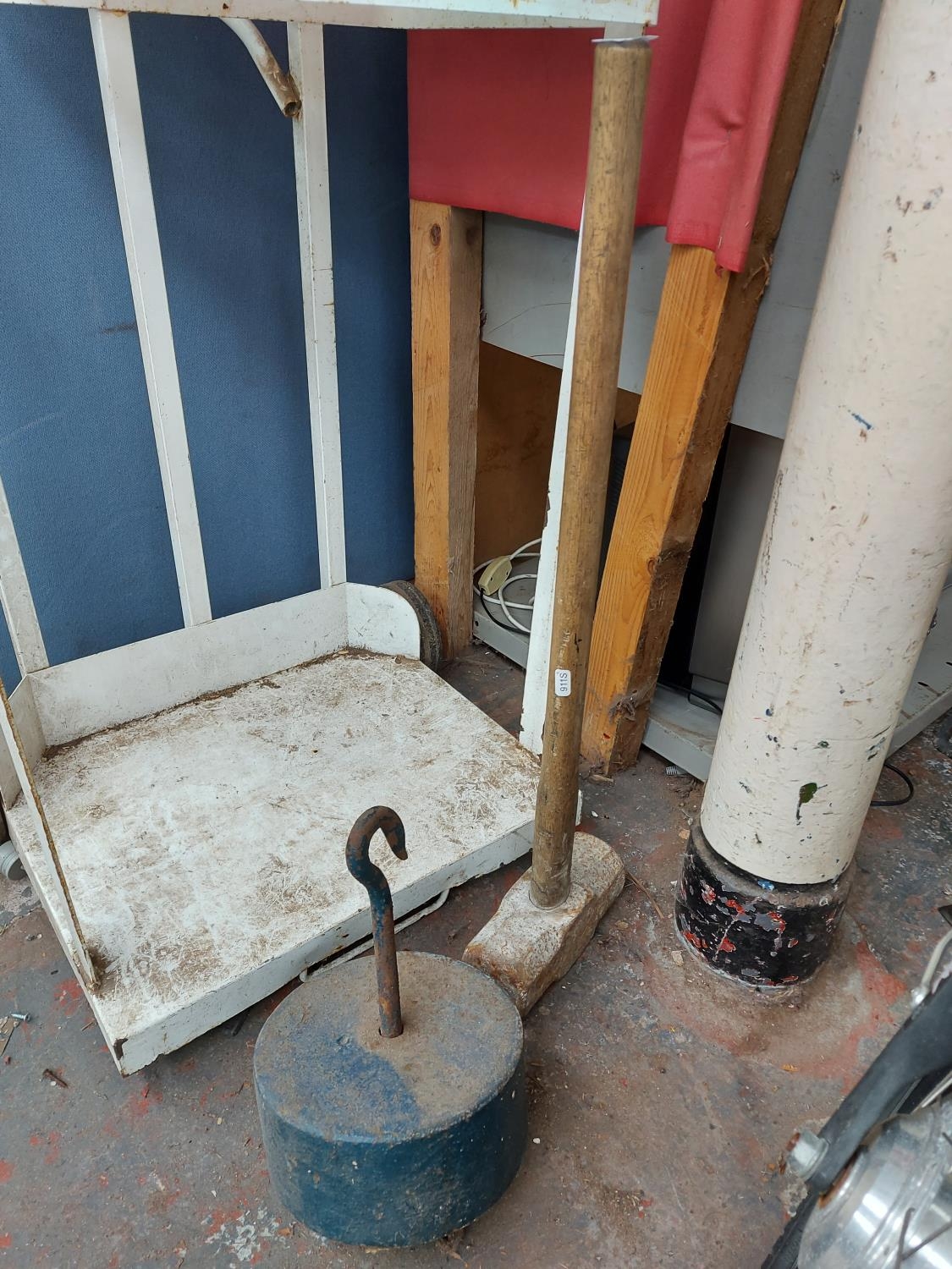 Two items to include a heavy wooden shafted sledge hammer and a cast iron scale weight
