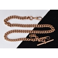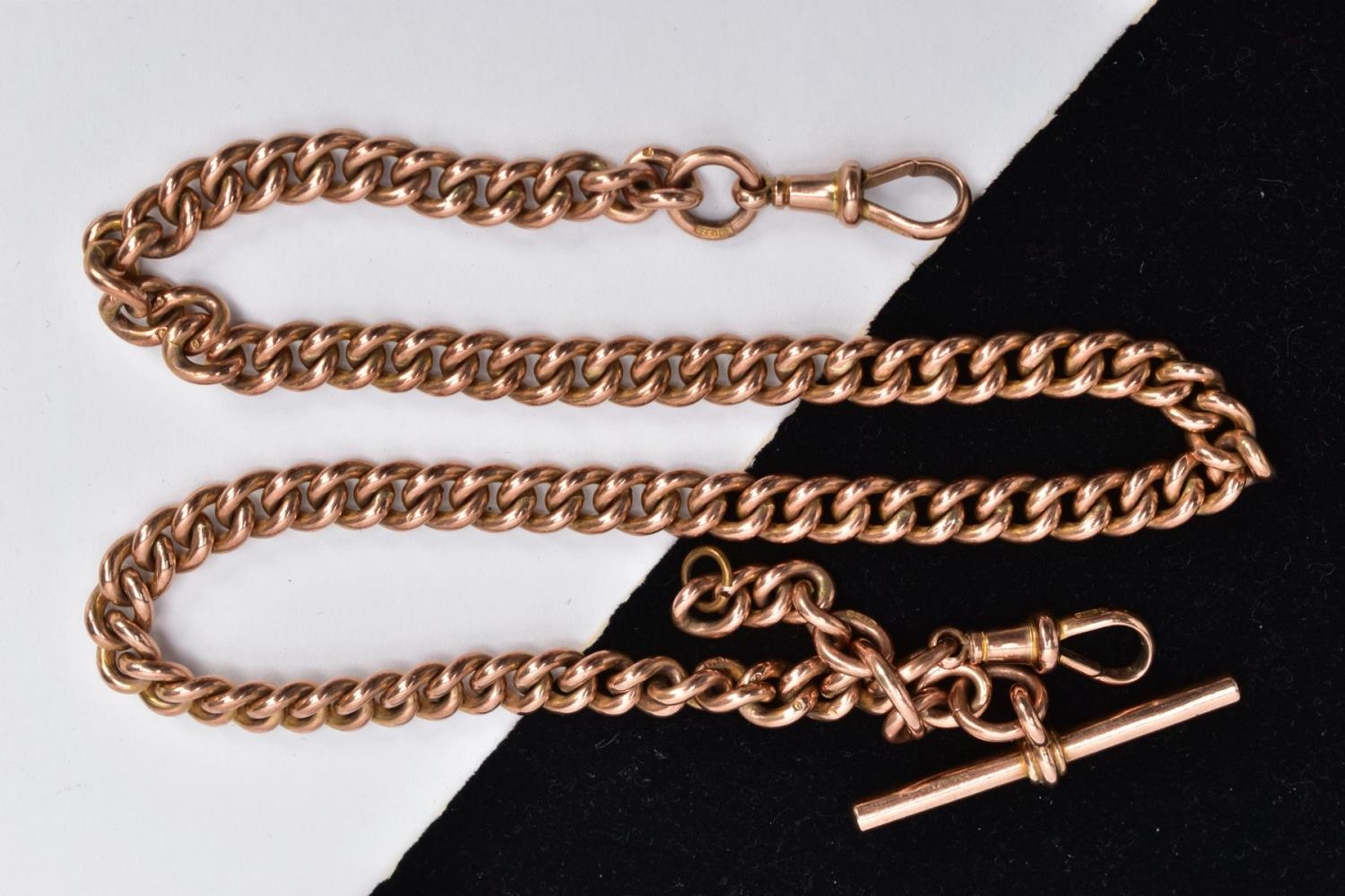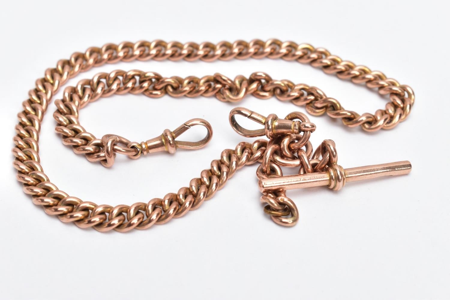 A 9CT GOLD WATCH CHAIN, curb link chain fitted with two swivel clasps, also suspending a T-bar, each link, clasp and T-bar stamped '9.375', length 410mm, approximate gross weight 56.5 grams (condition report: general light wear, clasps in working condition, overall condition good)