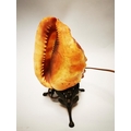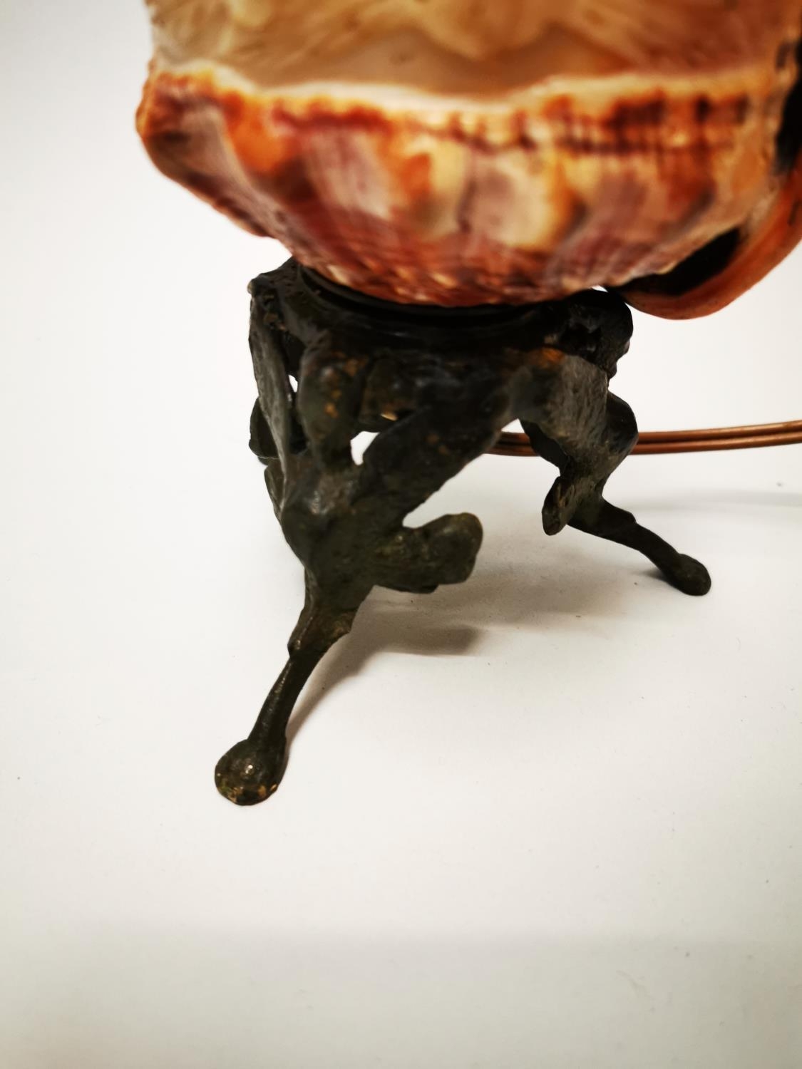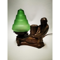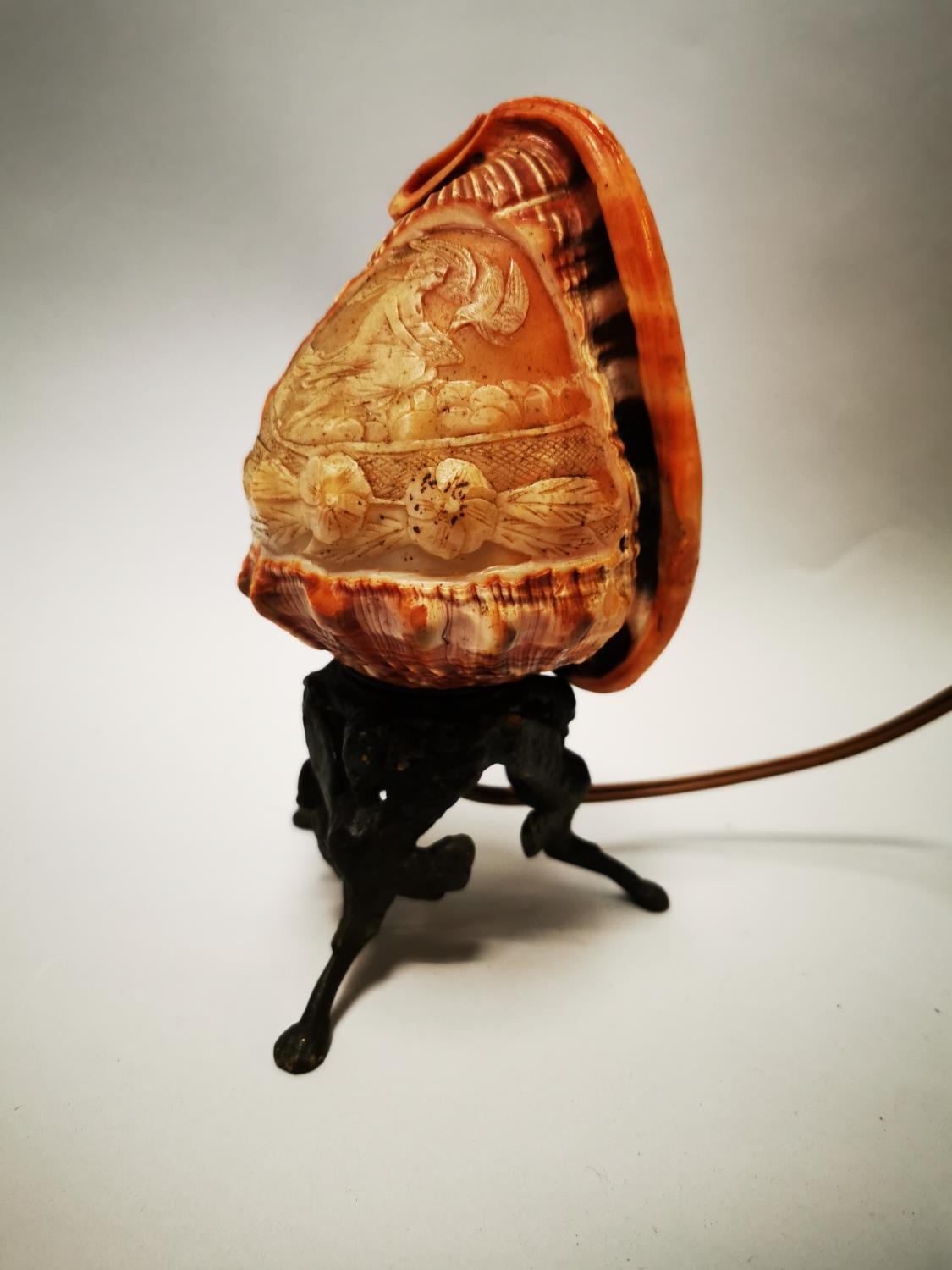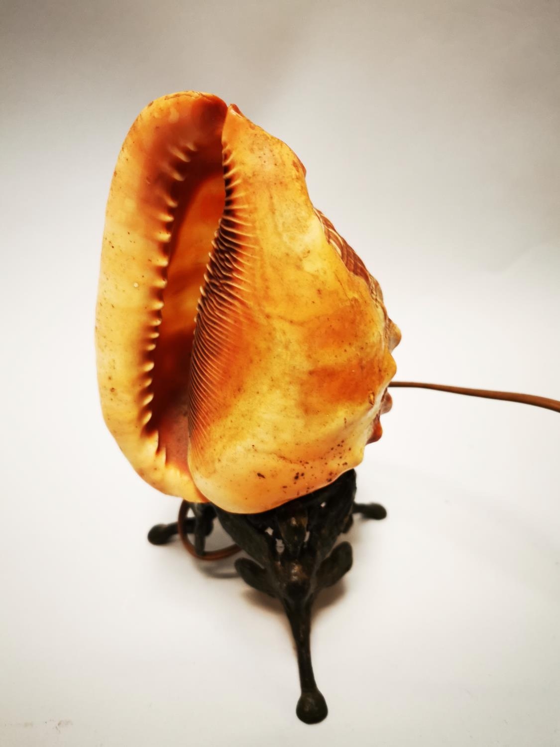 Gilded metal lamp with carved shell shade in the Art Deco style {20 cm H x 11 cm W x 11 cm D}.