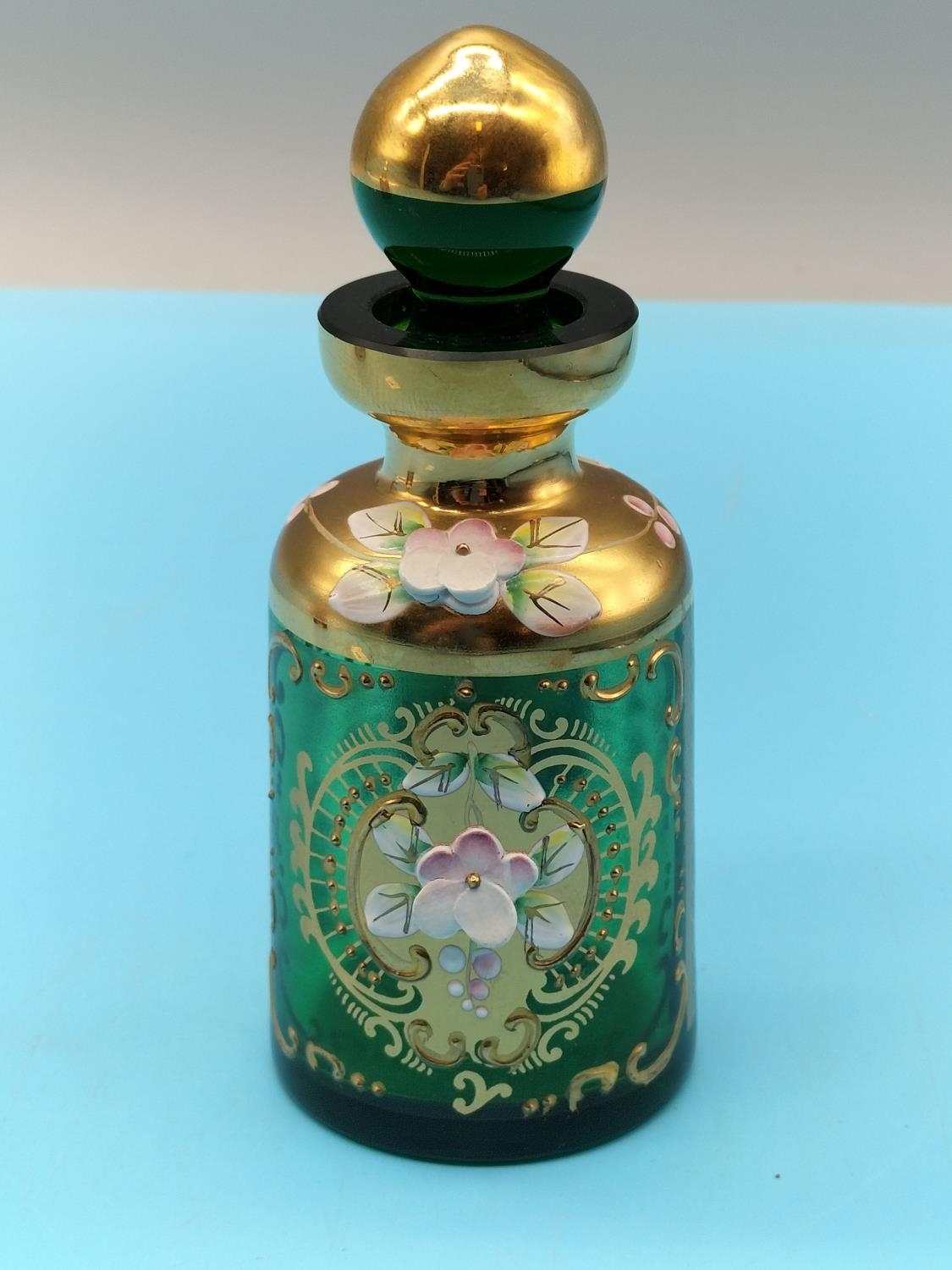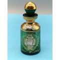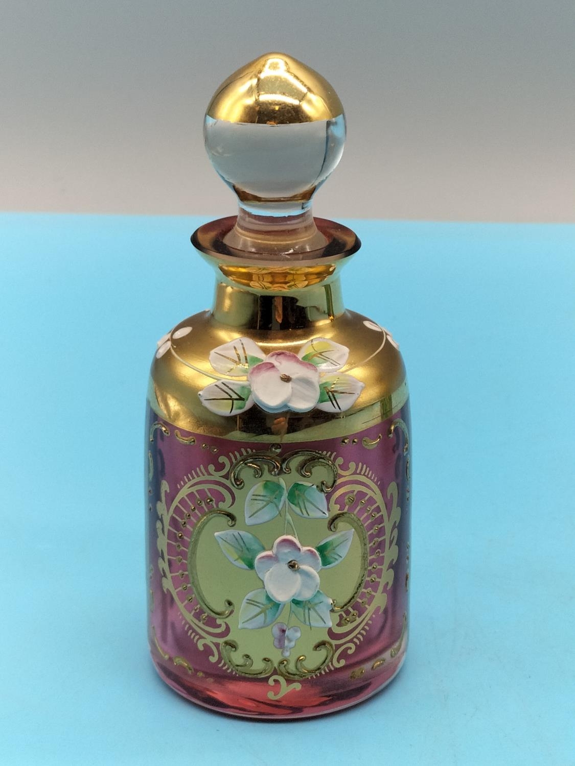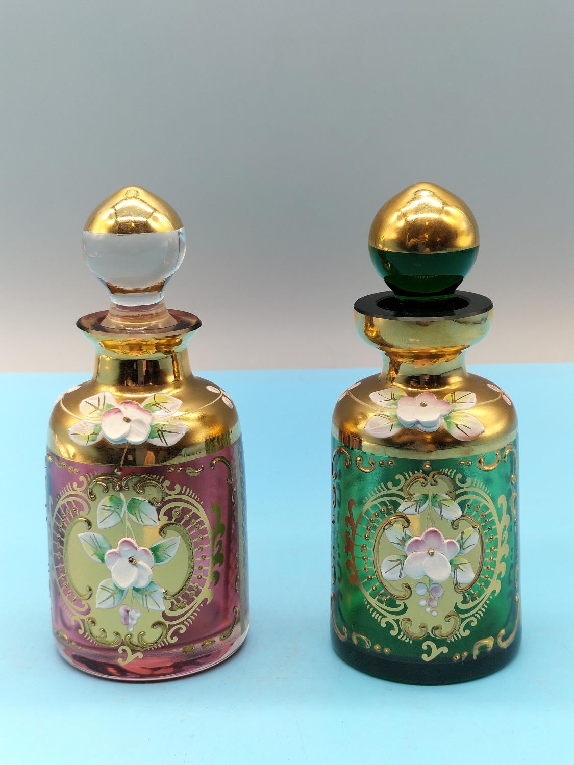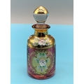 Bohemian Coloured Glass 11.5cm Dressing Table Bottles (2) Decorated with Flowers.