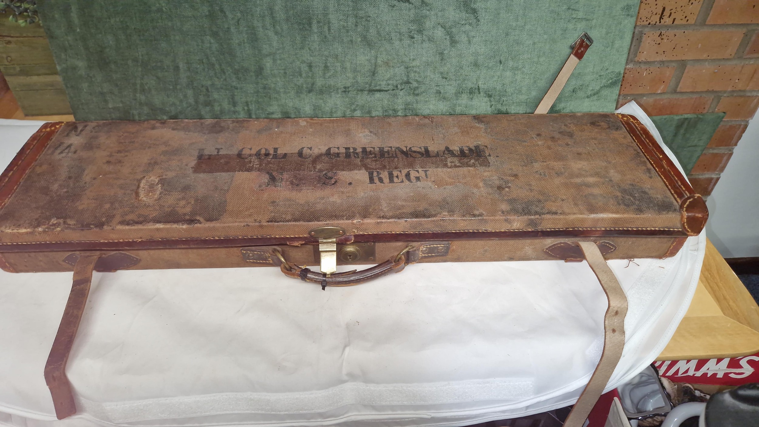 VINTAGE LEATHER FITTED GUN CASE BY CG EDWARDS & SONS, GUN & RIFLE MAKERS, PLYMOUTH - MARKED LT COL C GREENSLADE N & S REGIMENT - 82CMS X 24CMS X 9CMS H
