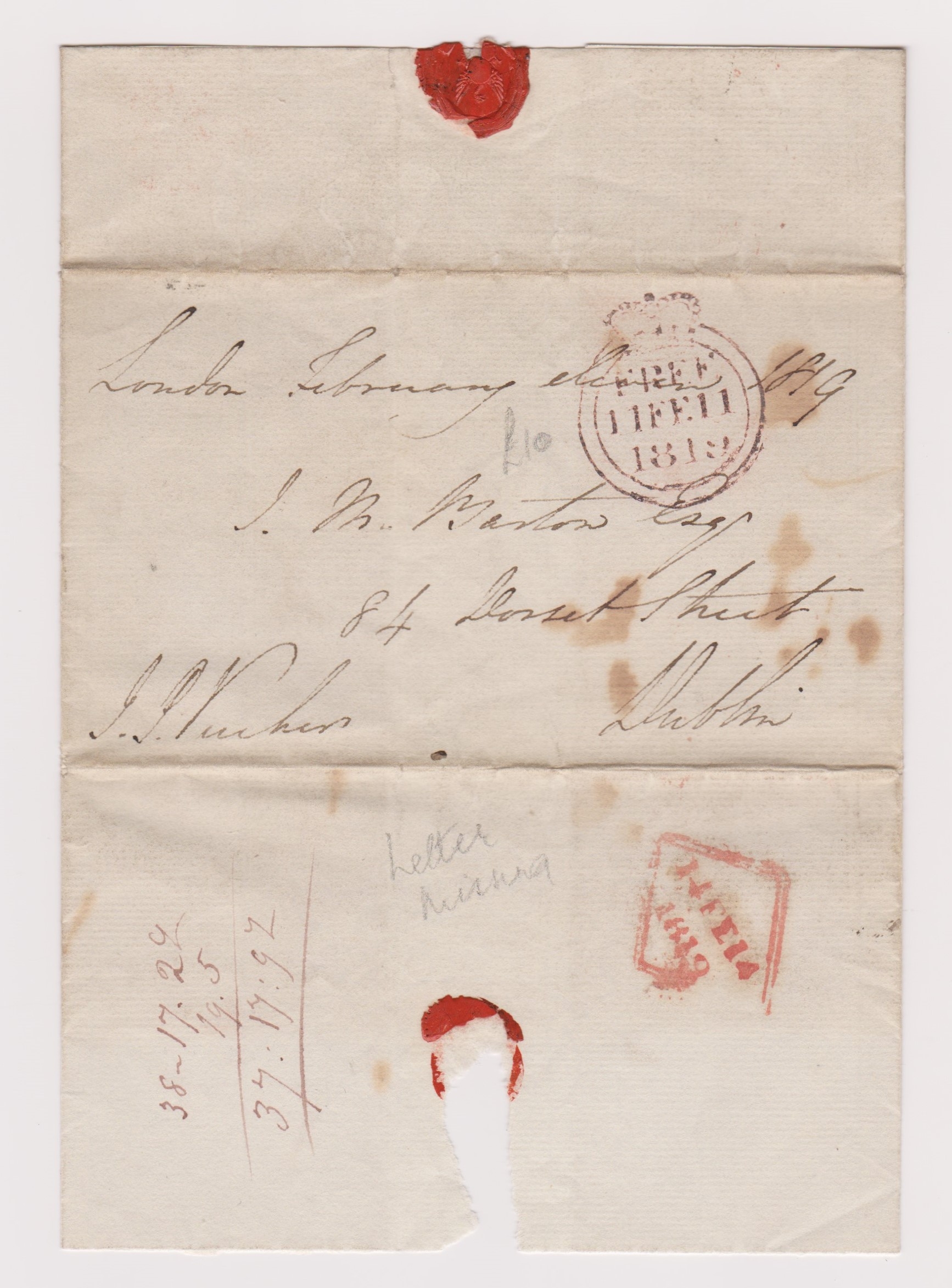 Great Britain 1819-Ireland wrapper posted to Dublin-crown free double circle Free/11FE11/1819 cancel red double border diamond 14FE14/1819 cancel