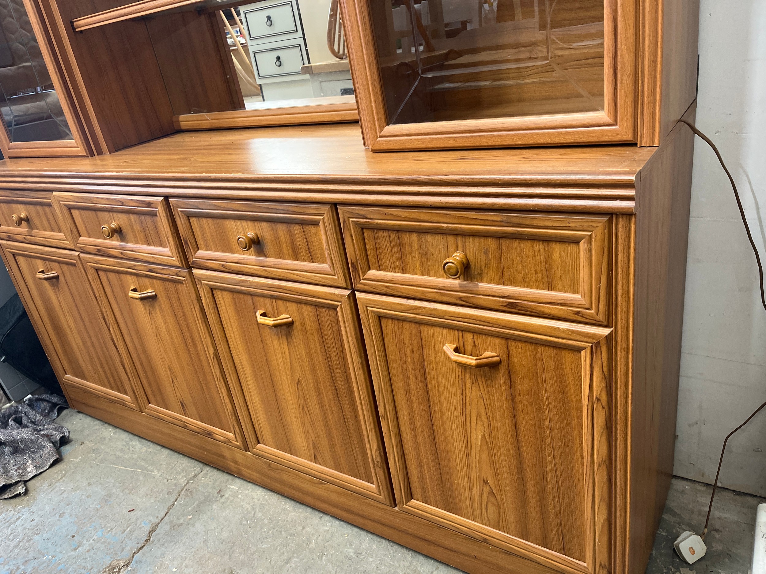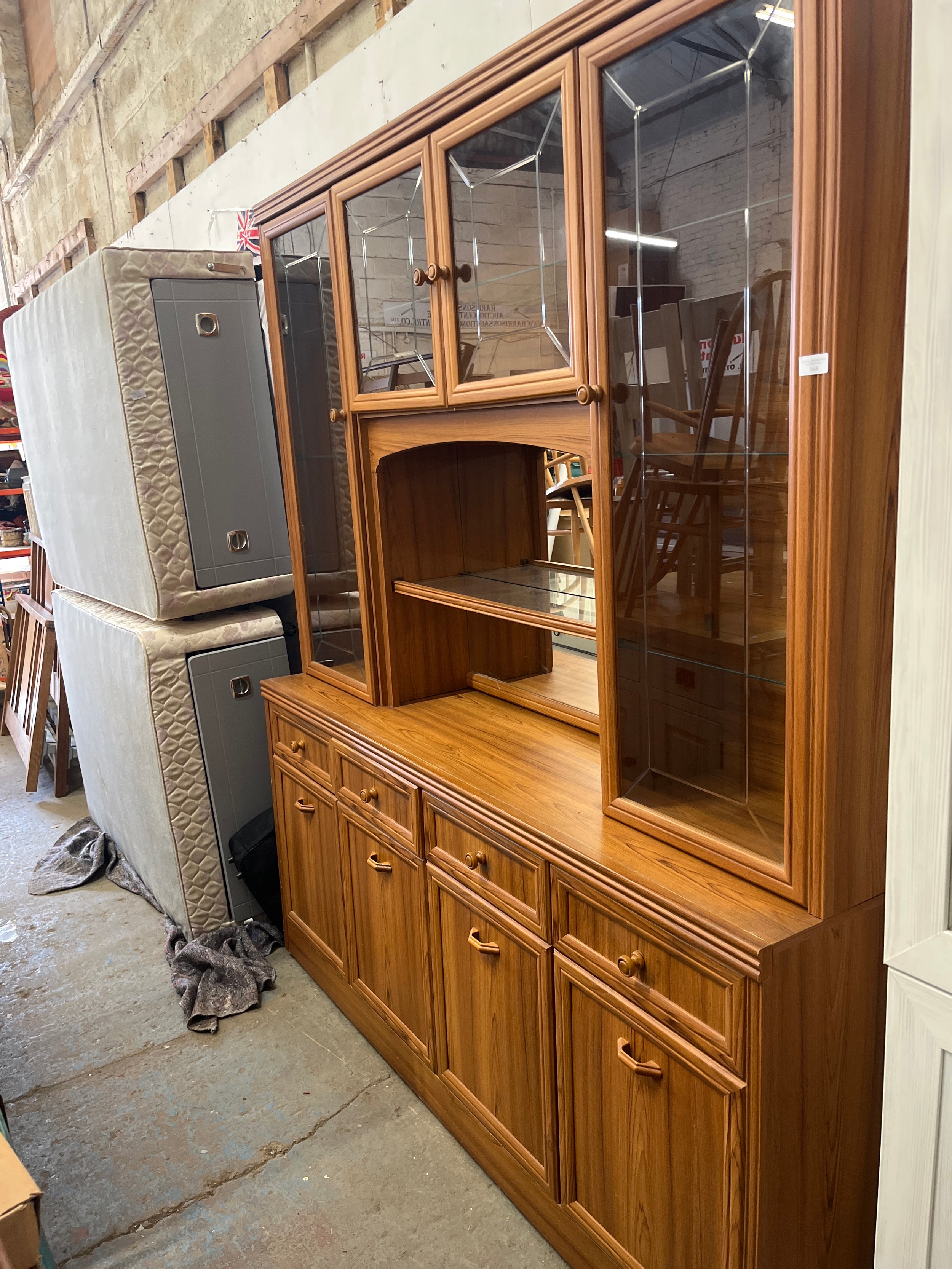 VERY LARGE DISPLAY CABINET WITH GLAZED DOORS TO TOP AND CUPBOARDS AND DRAWERS BELOW