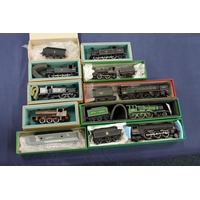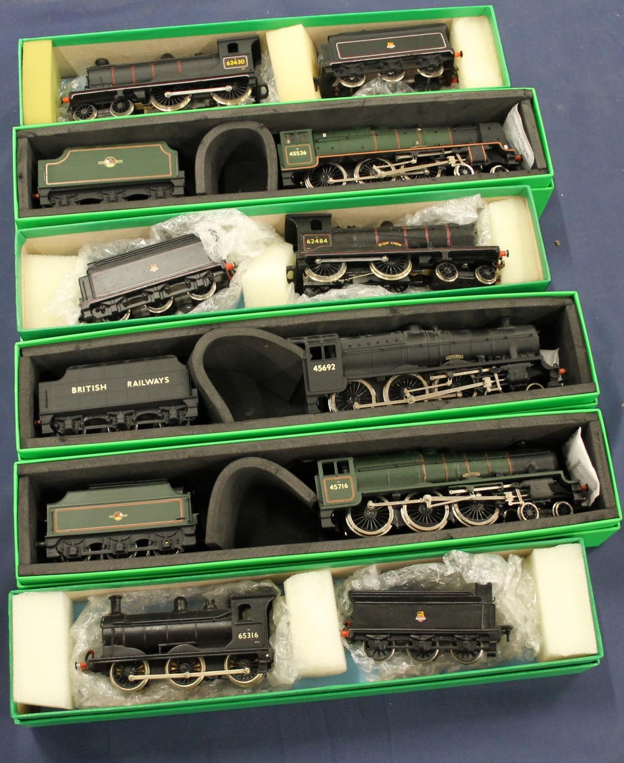 Kit built and other OO gauge model railway locomotives to include 4-4-0 tender locomotive 62430 BR black, 4-6-0 Glen Lyon tender locomotive 62484 BR black, 0-6-0 tender locomotive 65316 BR black, Mainline 4-6-0 Cyclops tender locomotive 45692 BR black, Mainline 4-6-0 Morecambe and Heysham tender locomotive 45526BR green, and Mainline 4-6-0 Swiftsure tender locomotive 45716 BR green, each in green cardboard boxes. (6)