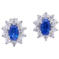 PAIR OF SAPPHIRE AND DIAMOND CLUSTER STUD EARRINGS, set with a central blue sapphire totalling approx. 0.50 ct. surrounded with diamonds totalling approx. 0.40 ct. L. 0.9 cm. 2 grams.