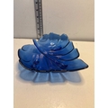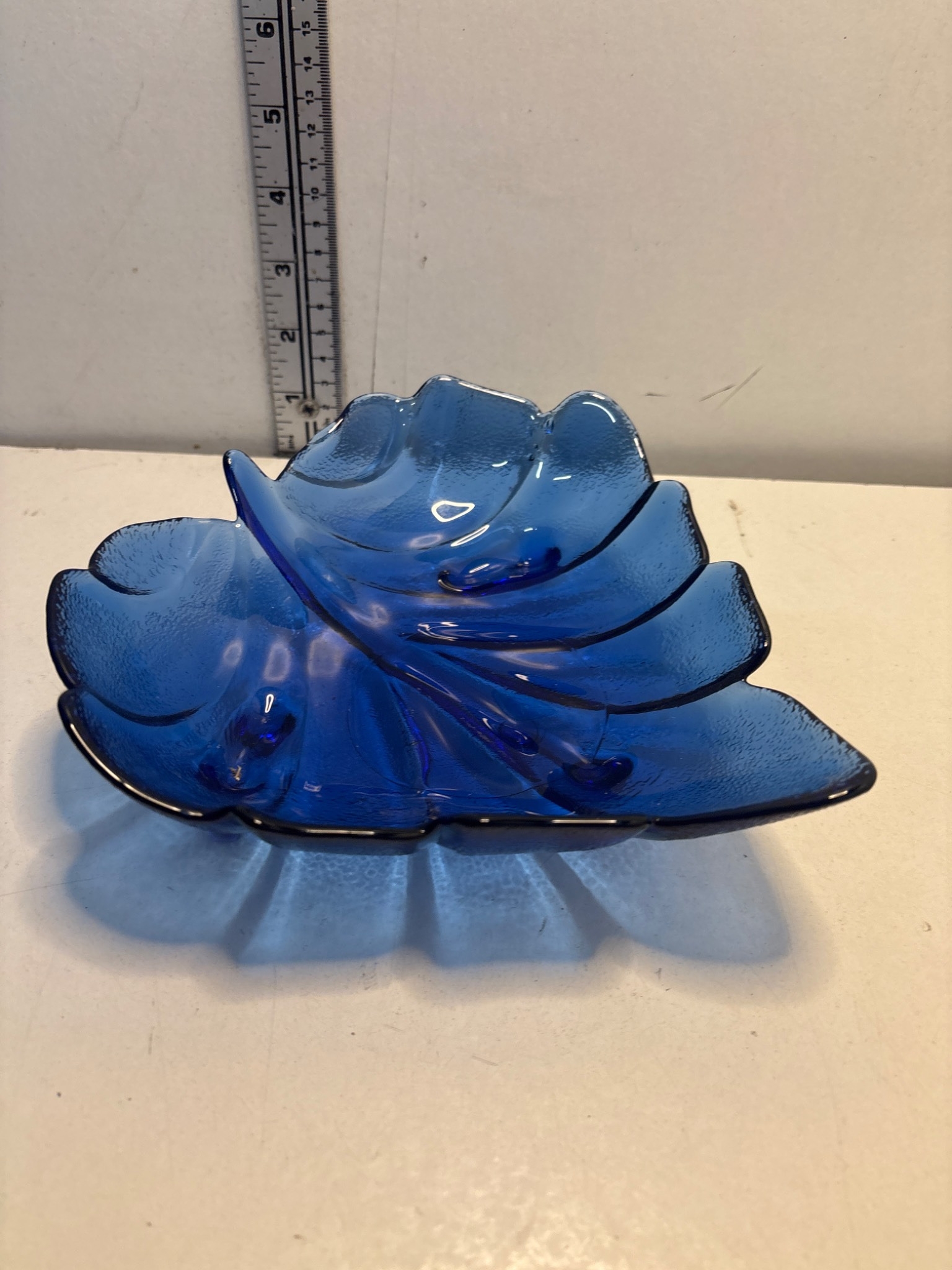 Blue glass dish shaped like a leaf, about 8 inches long.