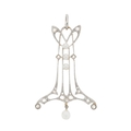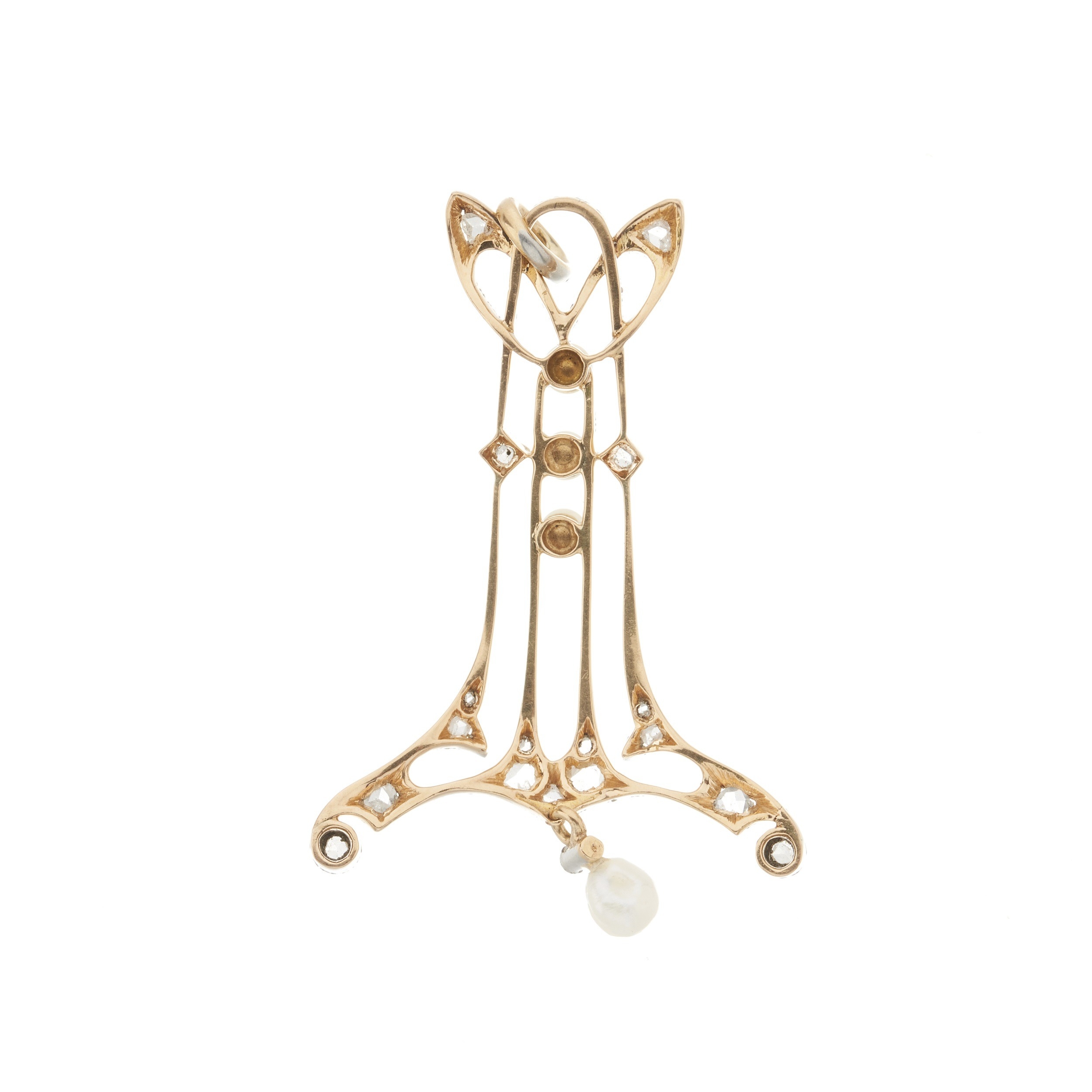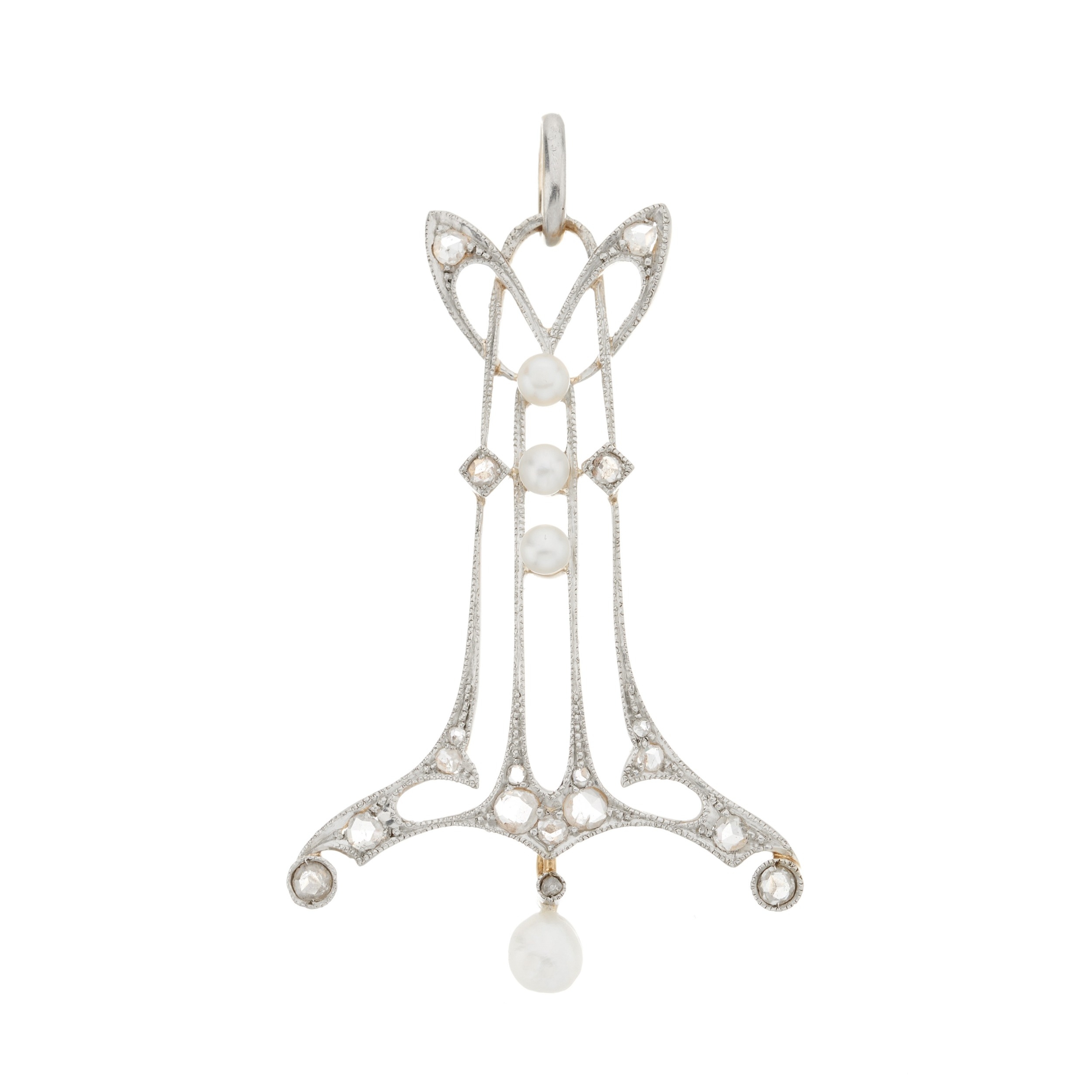 An Art Nouveau rose-cut diamond and seed pearl openwork pendant, suspending a rose-cut diamond and pearl drop, length 5.1cm, 5.3g