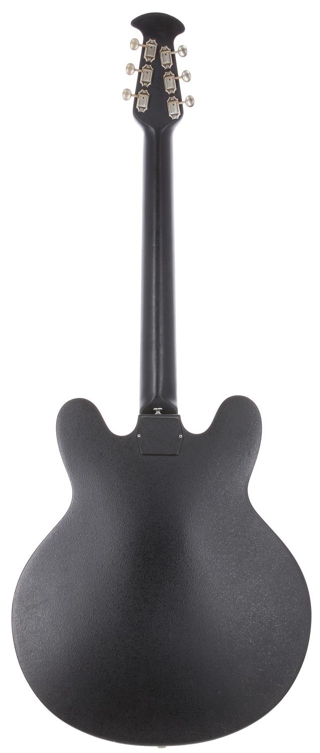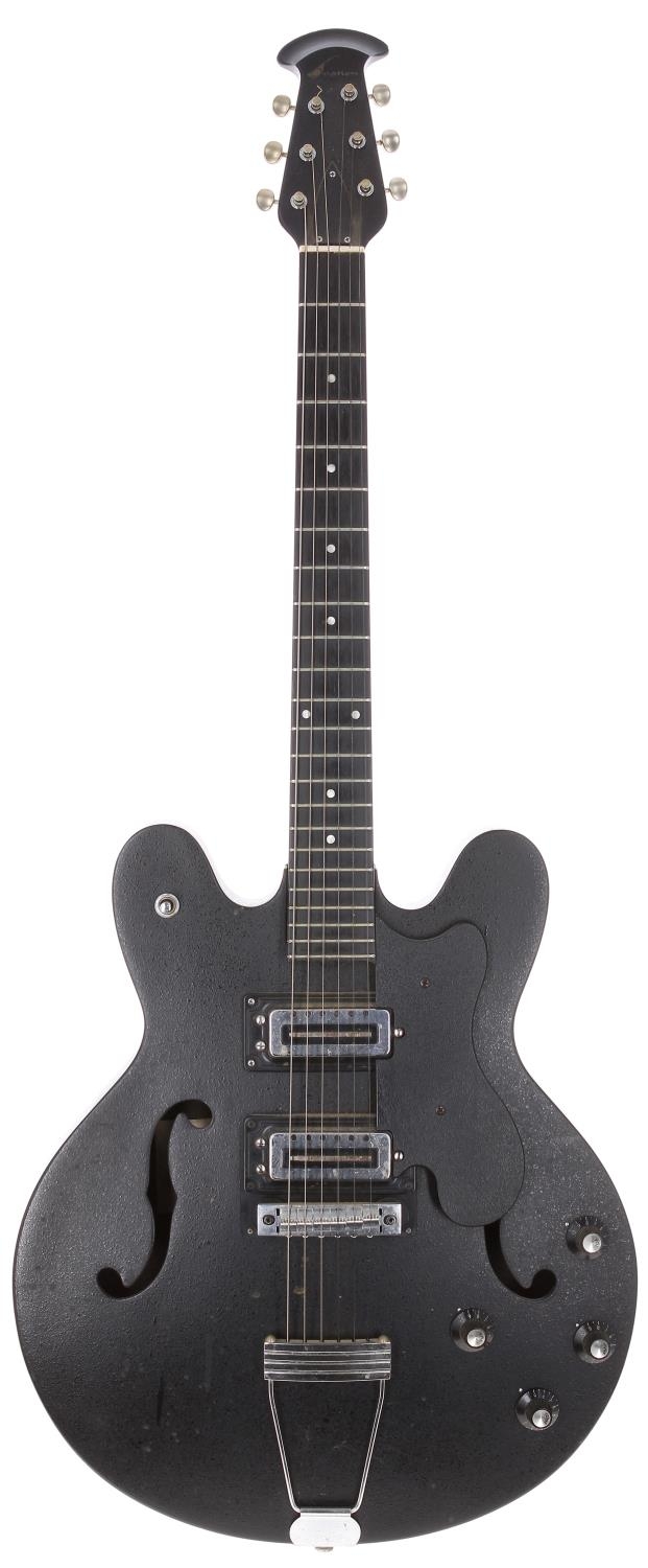 Early 1970s Ovation Eclipse 1235-5 semi-hollow body electric guitar, made in USA; Body: black Lyrachord body, a few small dings and marks; Neck: Lyrachord, a few small impact dings to back; Frets: light wear; Electrics: working, light crackle to pots; Hardware: generally good, some rusting to smaller metal parts; Weight: 3.22kg; Overall condition: good for age