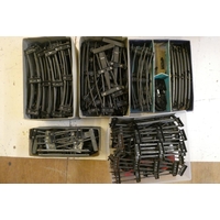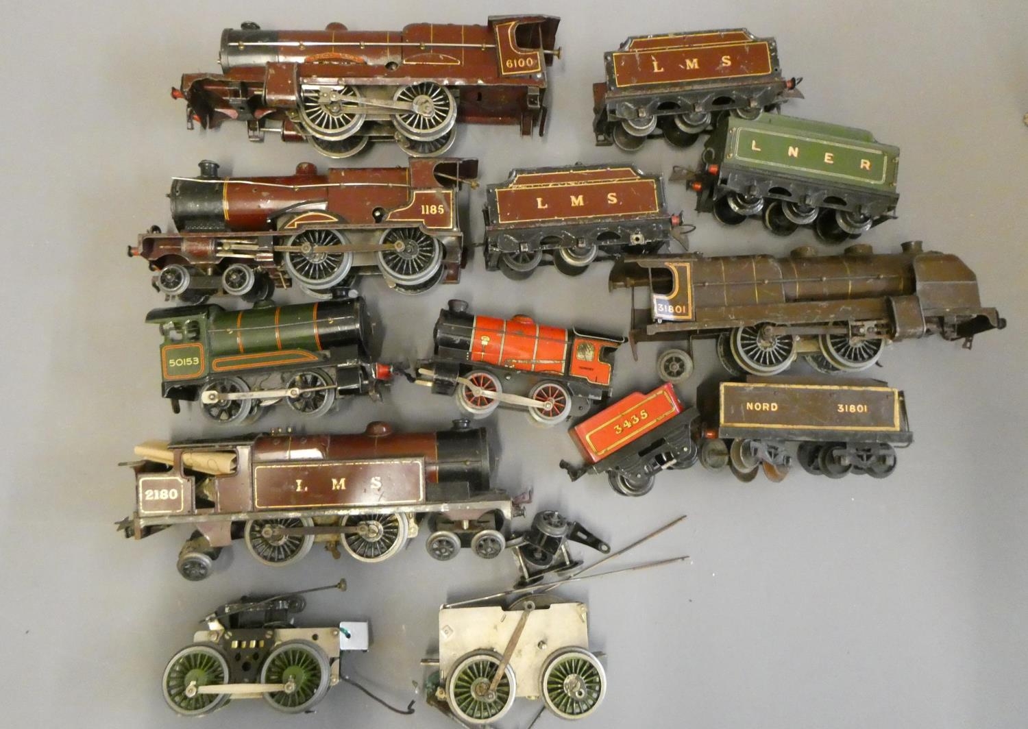Playworn Hornby O-gauge trains including clockwork tender and tank locomotive and 0-4-0 electric mechanisms. Most items have paint damage or parts missing, fair to poor
