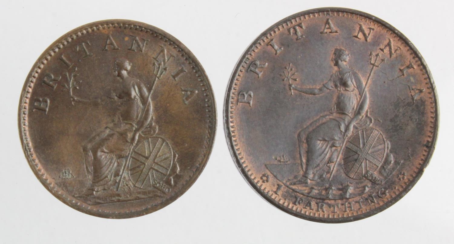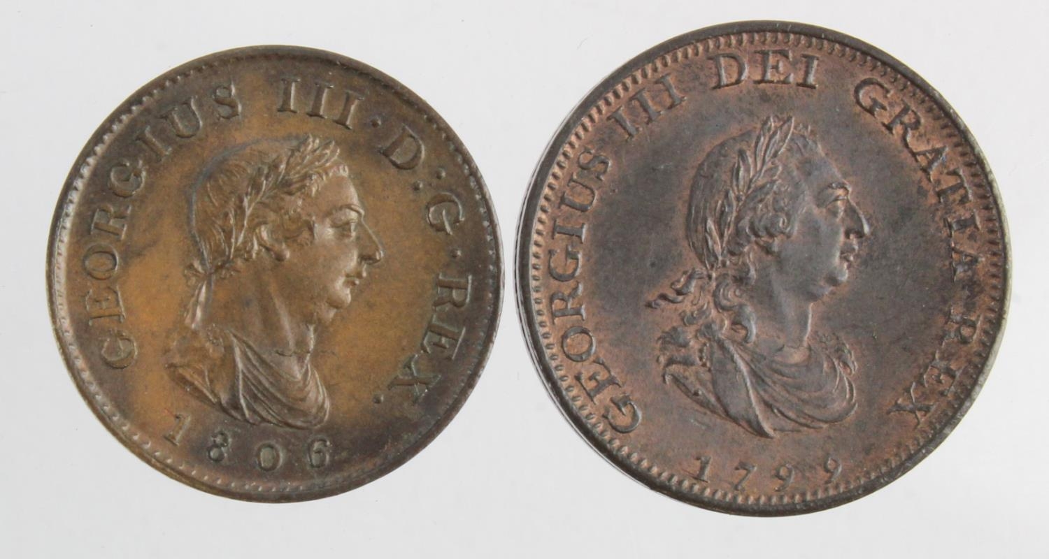 Farthings (2): 1799 3 berries EF trace lustre, and 1806 K on trunc. EF trace lustre.