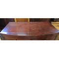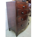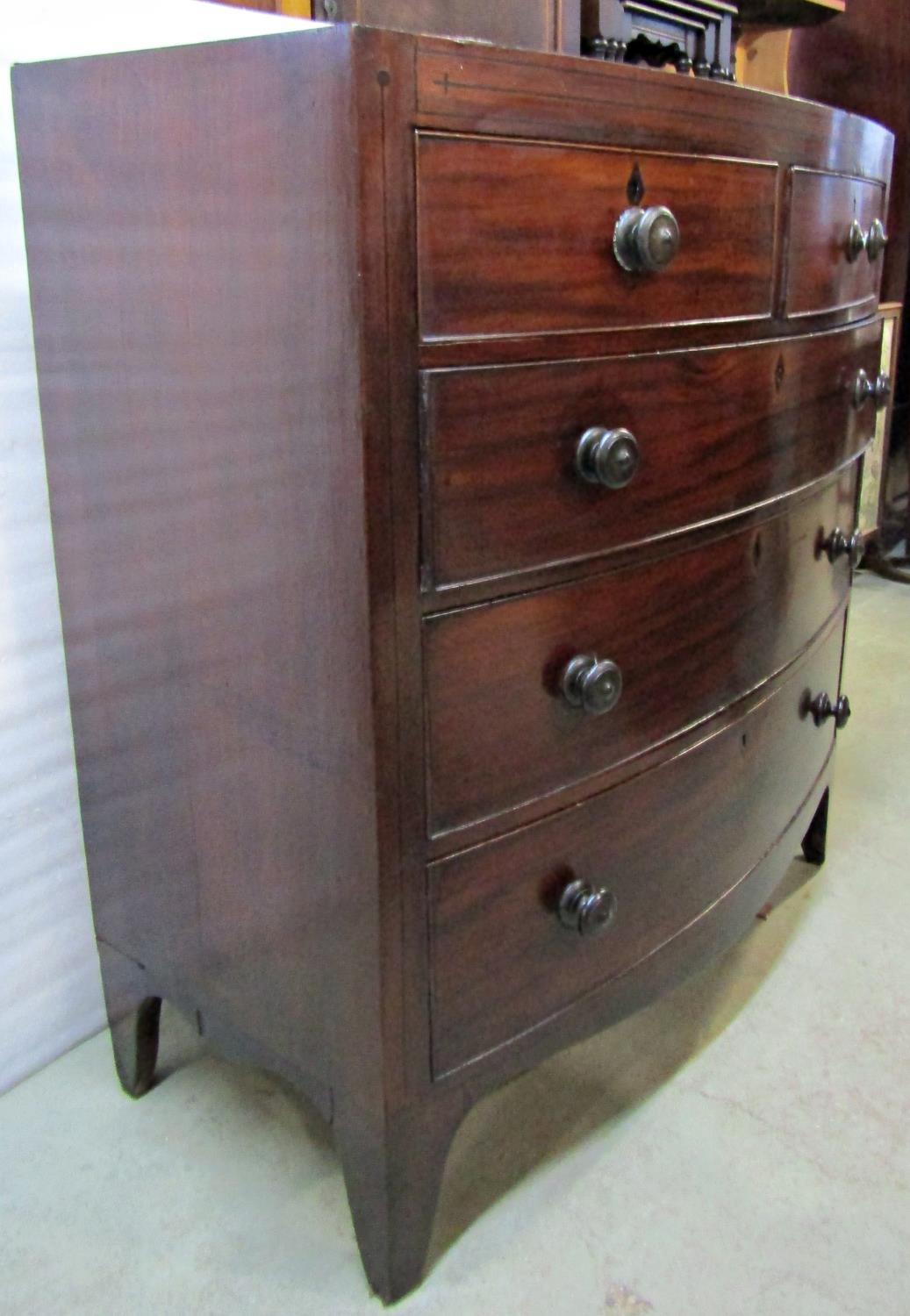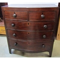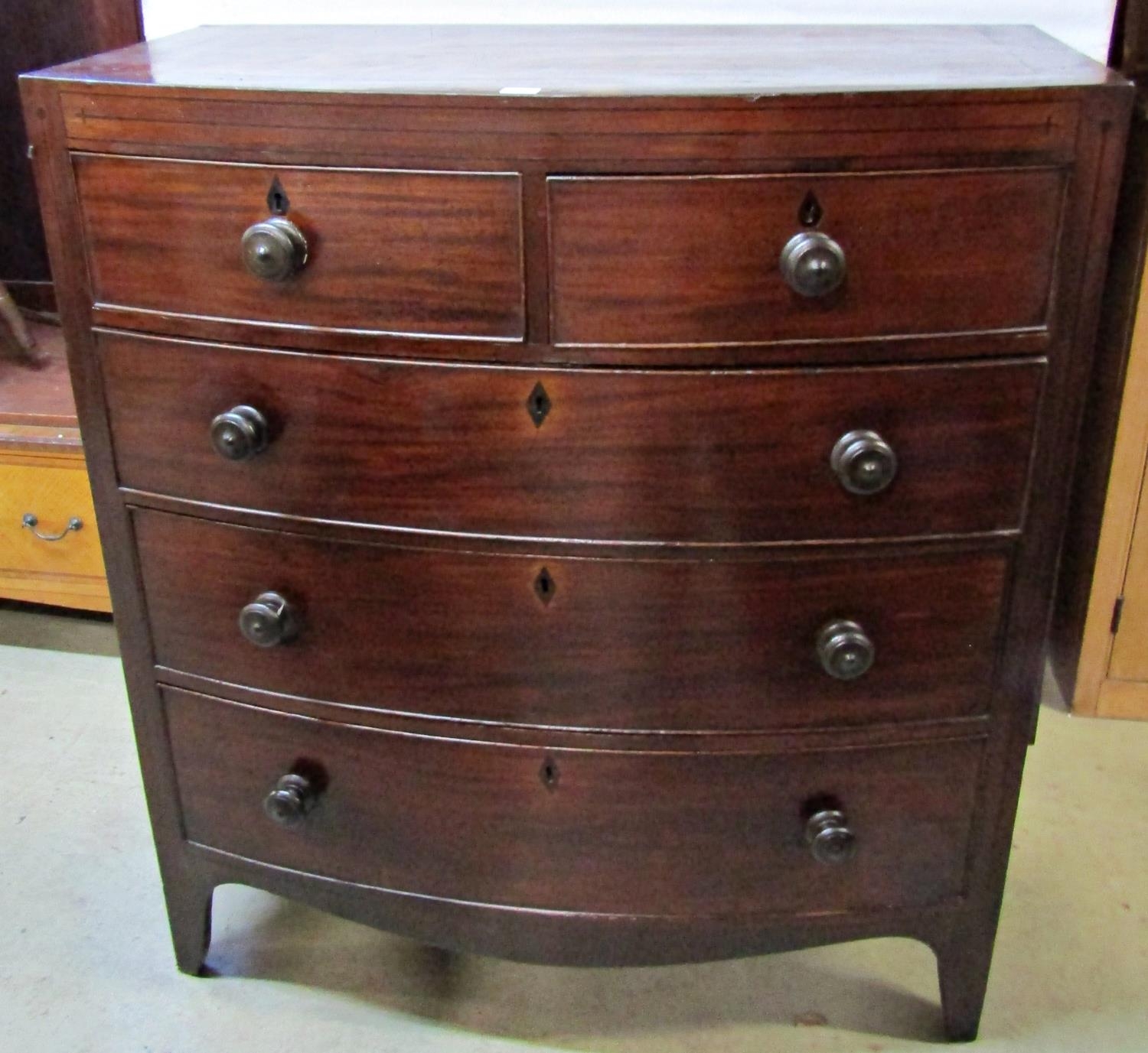 A regency mahogany bowfronted chest of three long and two short drawers on splayed supports, the caddy top with ebony inlaid detail, 100cm wide