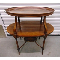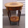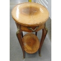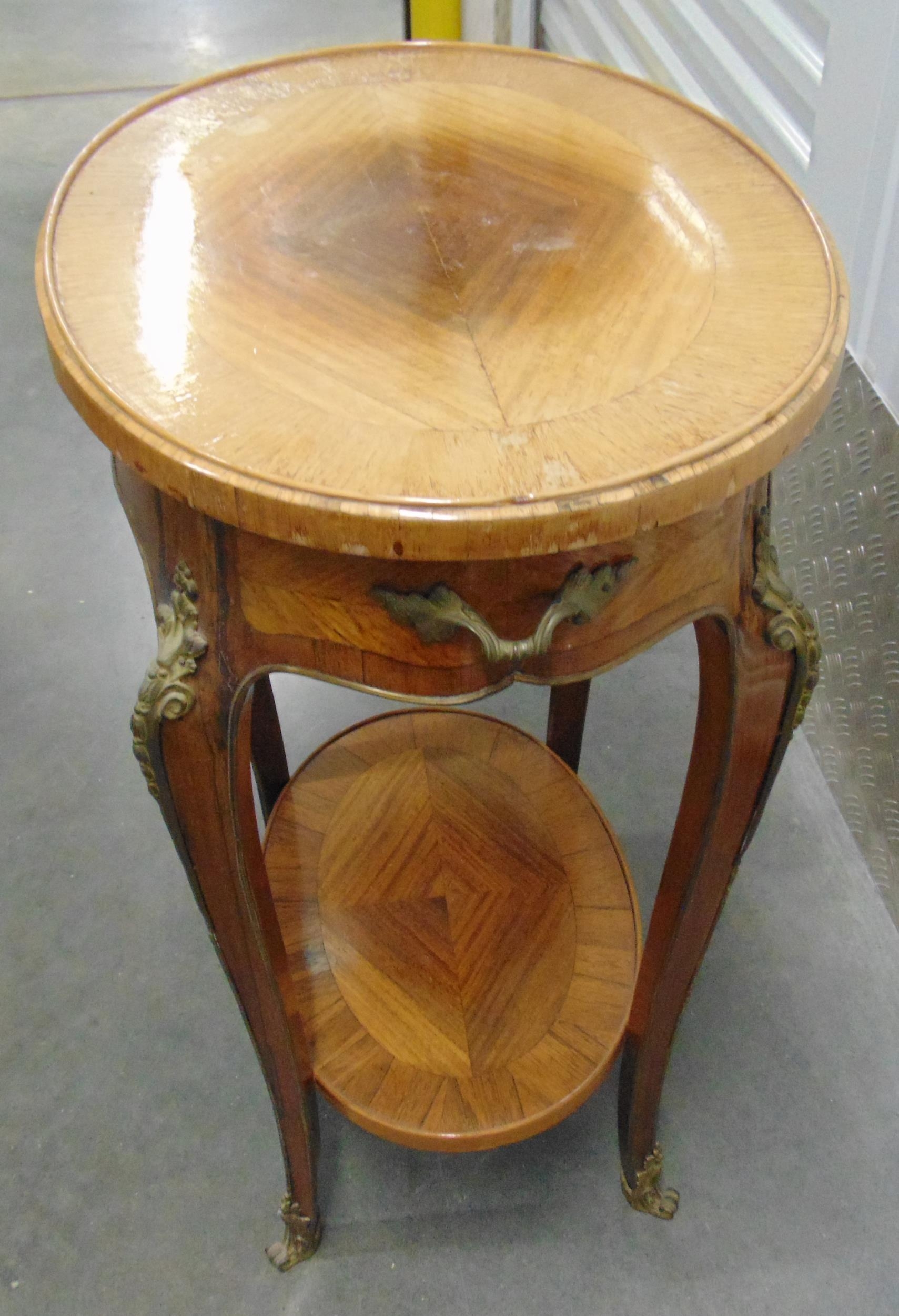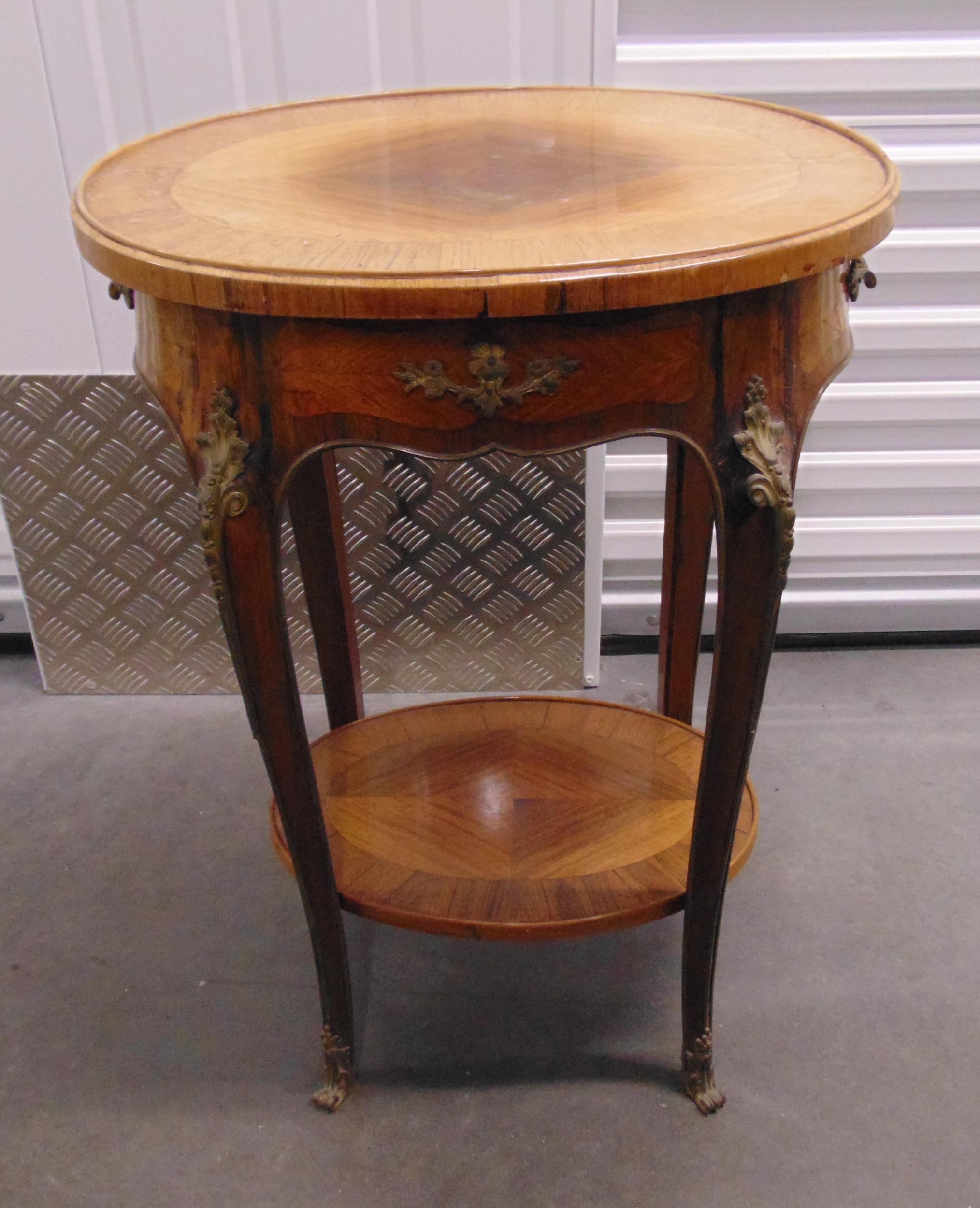 A French early 20th century shaped oval side table with gilt mounts on four scroll legs, 73 x 51 x 39cm