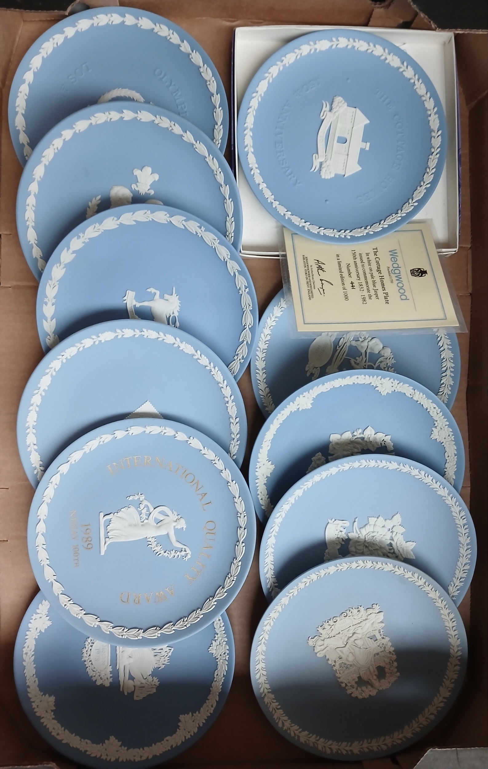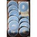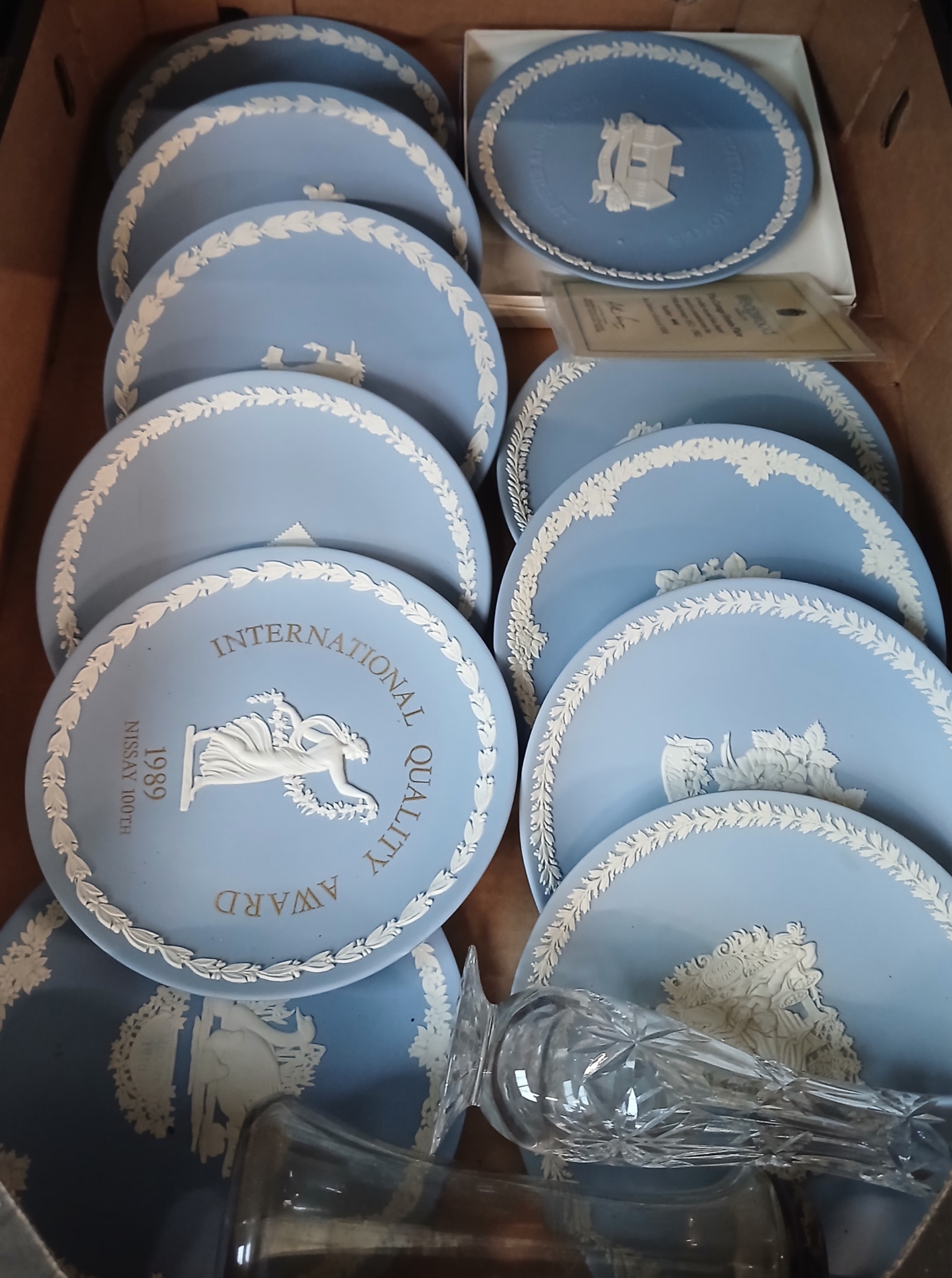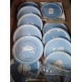 A box of assorted blue Wedgwood Jasperware collector plates.