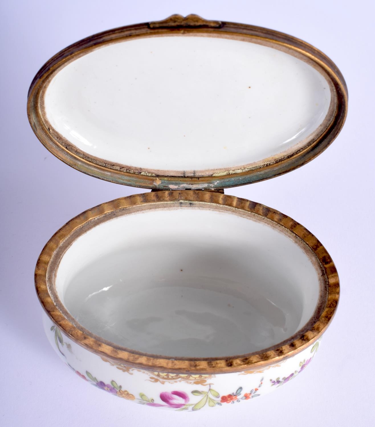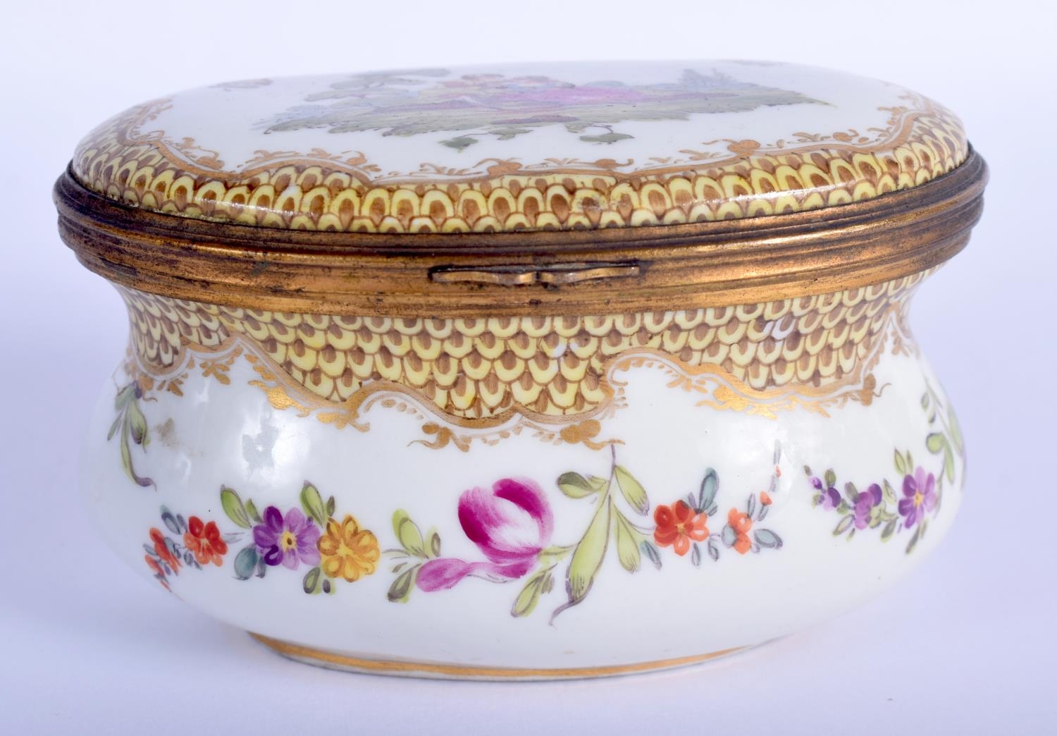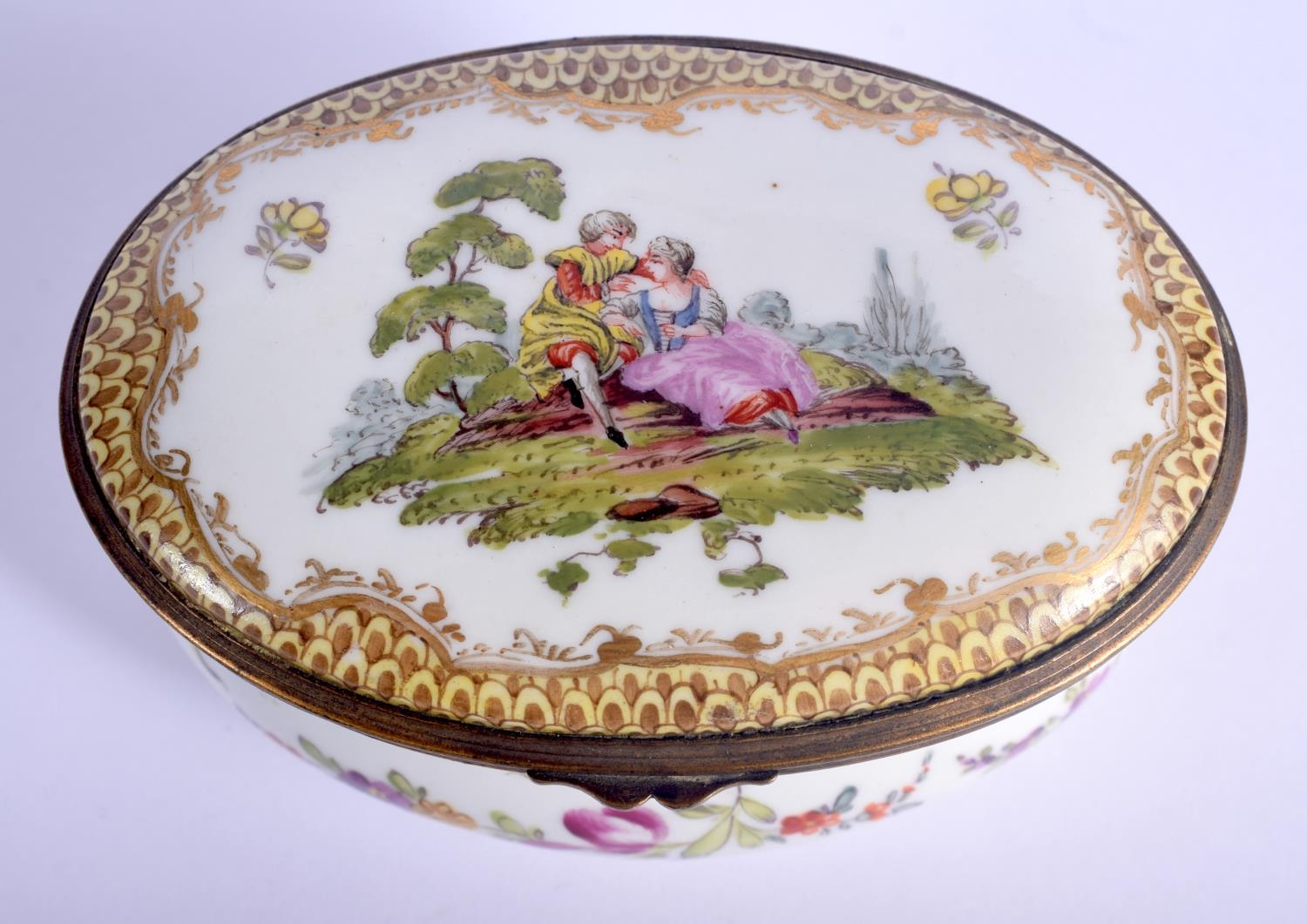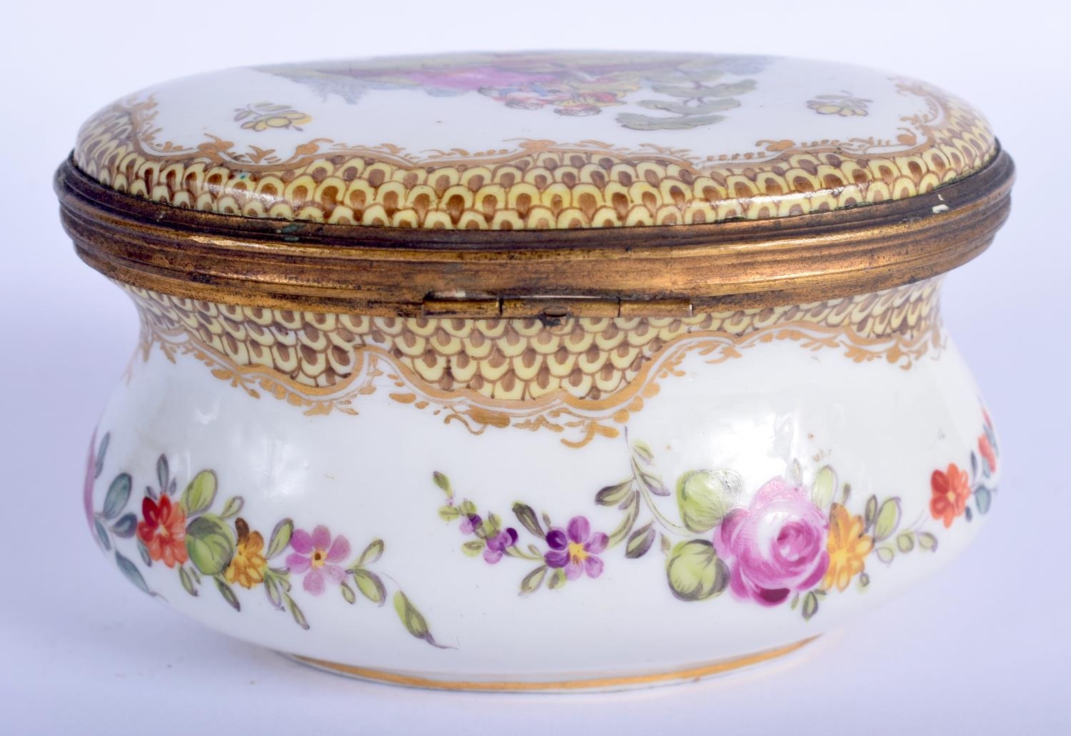A 19TH CENTURY GERMAN HOSCHT PORCELAIN ENAMELLED BOX painted with figures within landscapes. 10 cm x 6 cm.