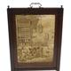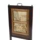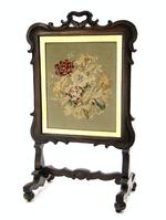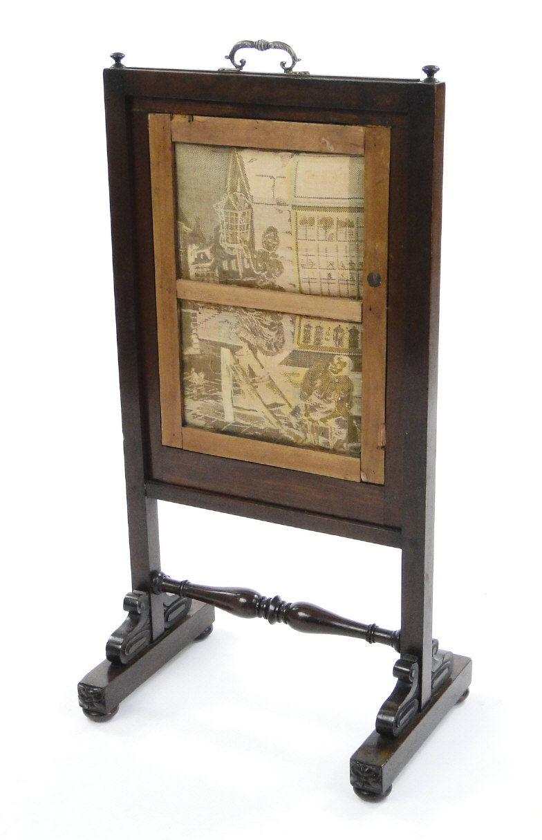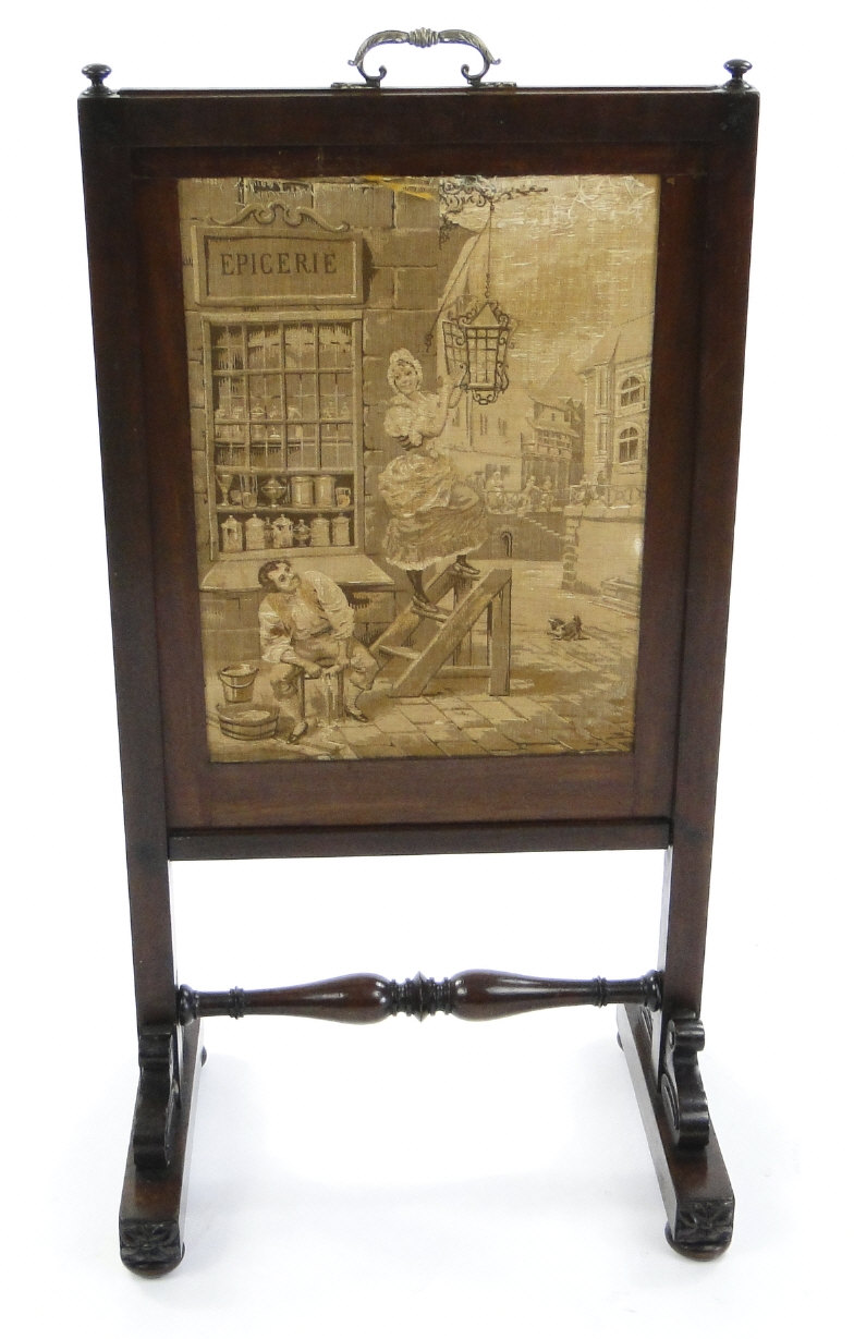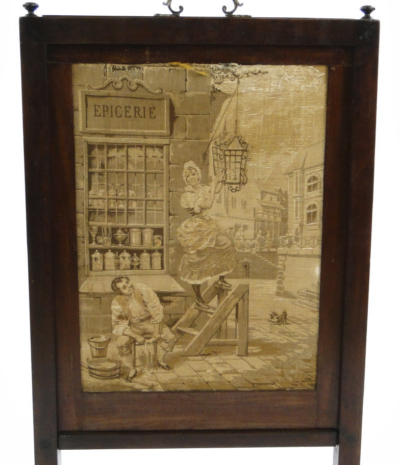 Victorian mahogany rise and fall firescreen with brass handle and central French textile panel, 89cm high x 46cm wide x 31cm deep
