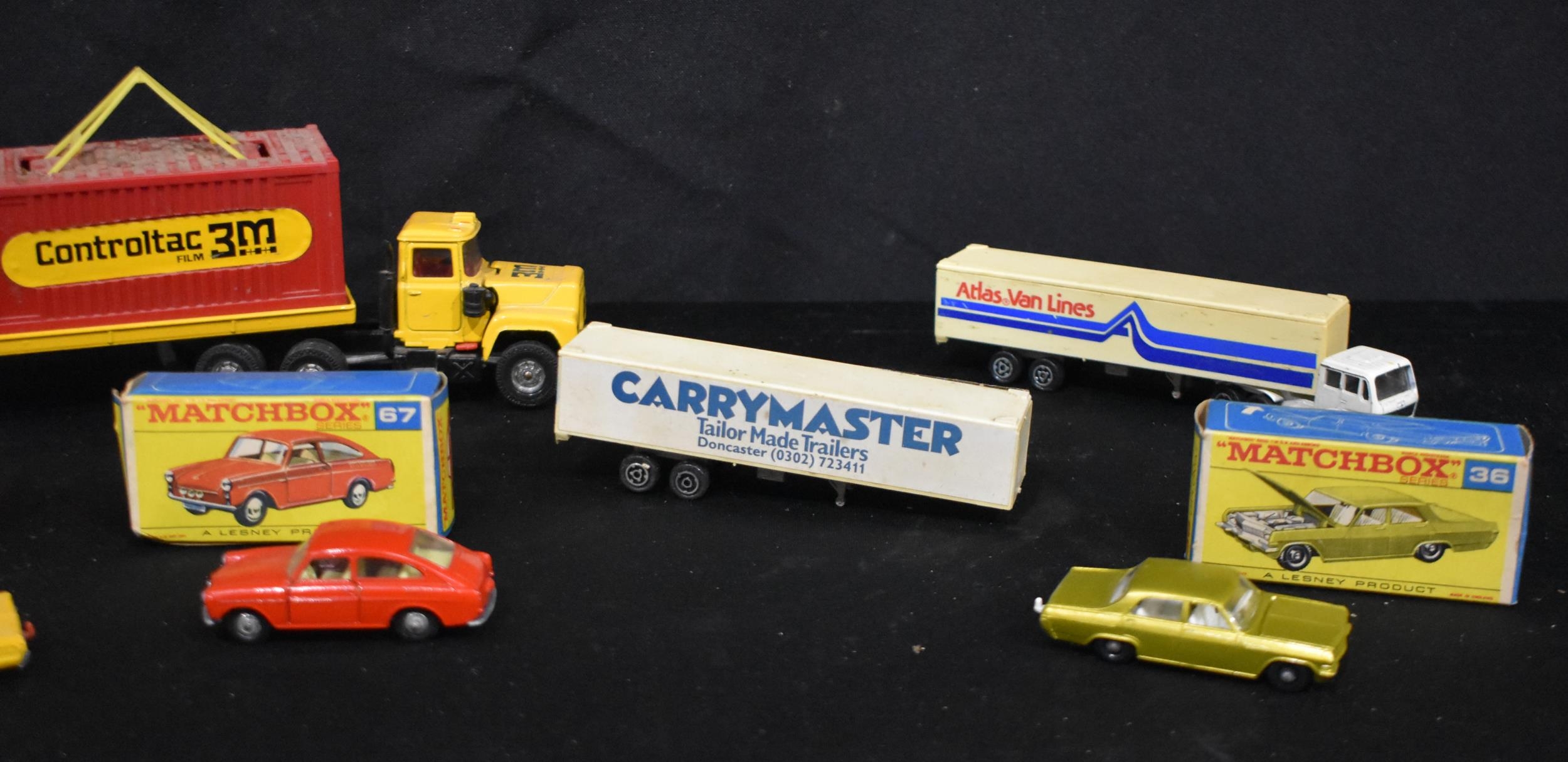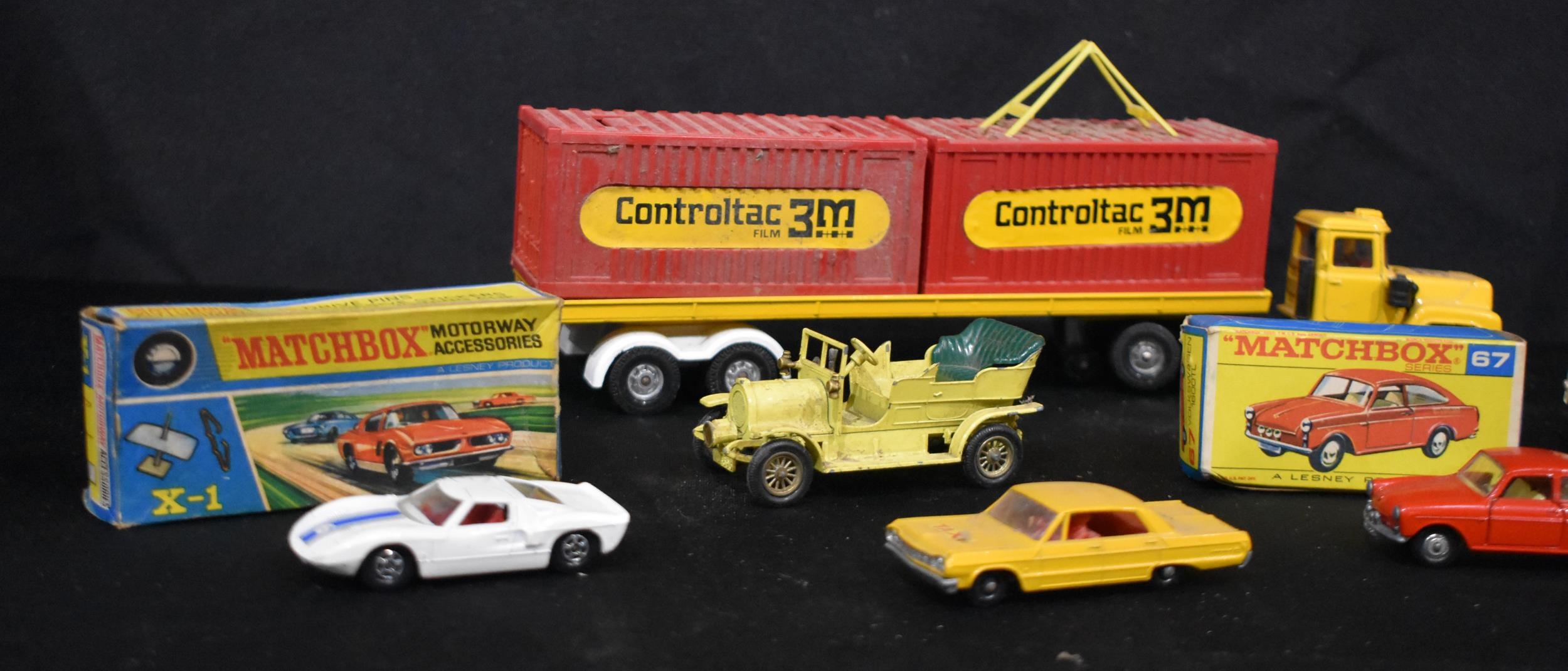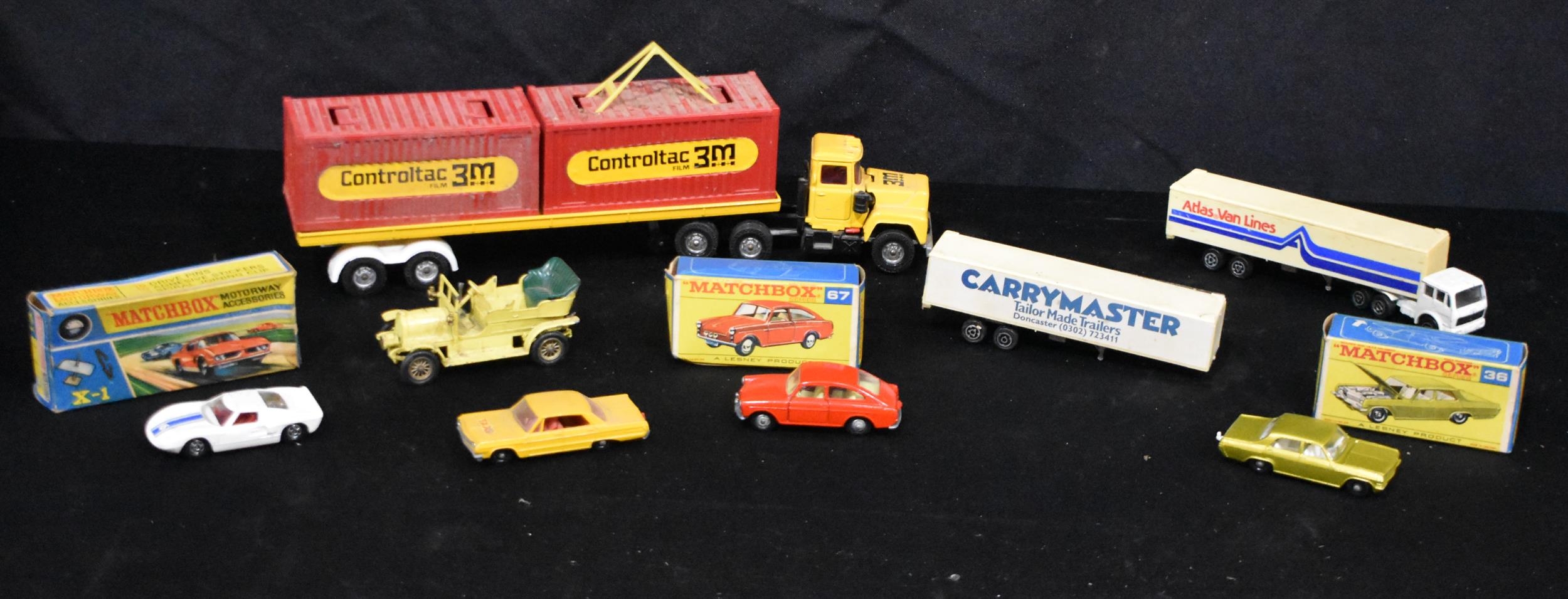 A collection of model cars and lorries some boxed, Matchbox, Corgi etc 30cm (8)