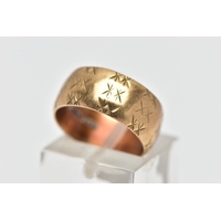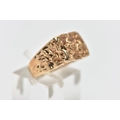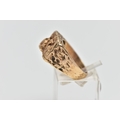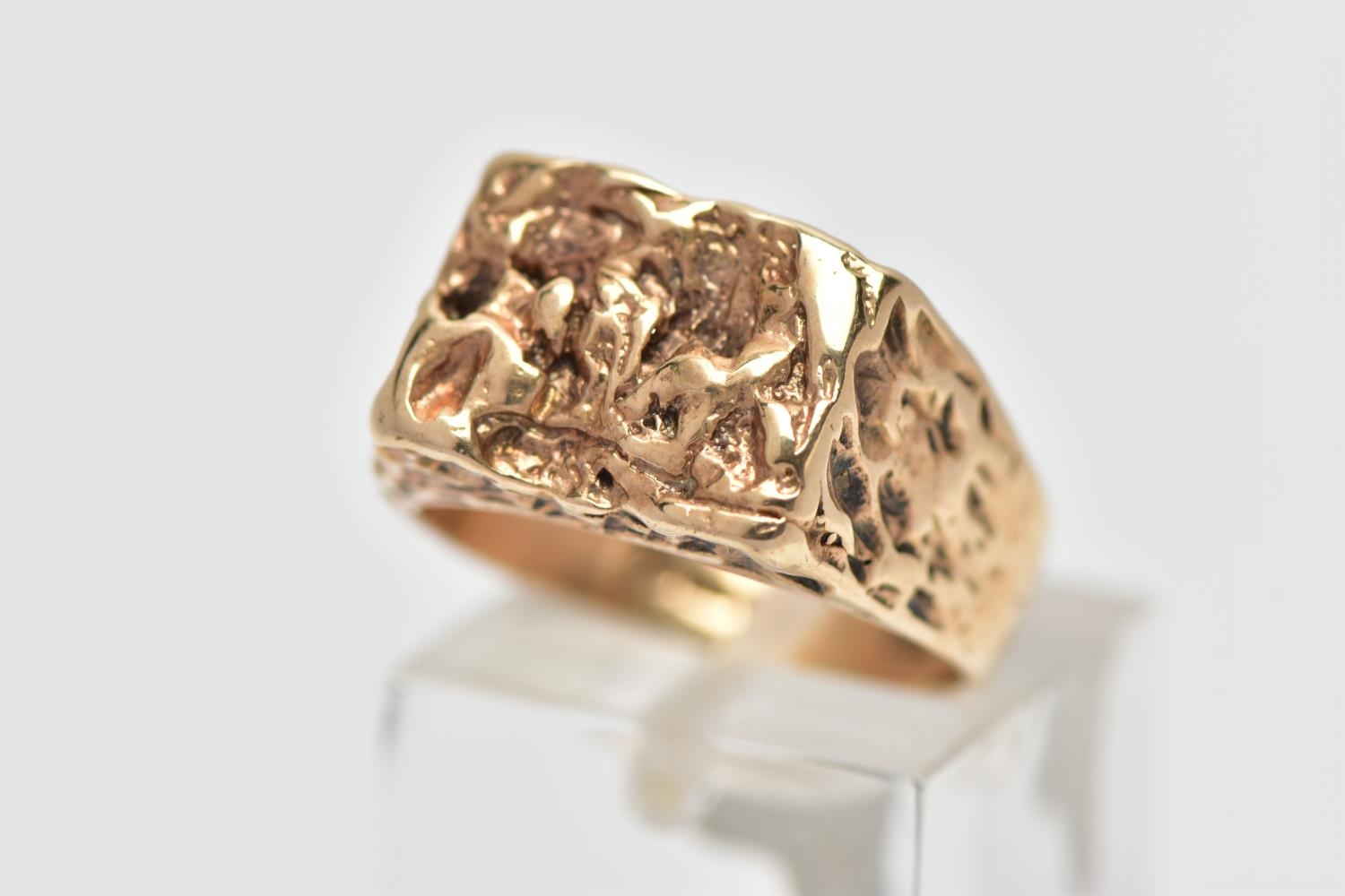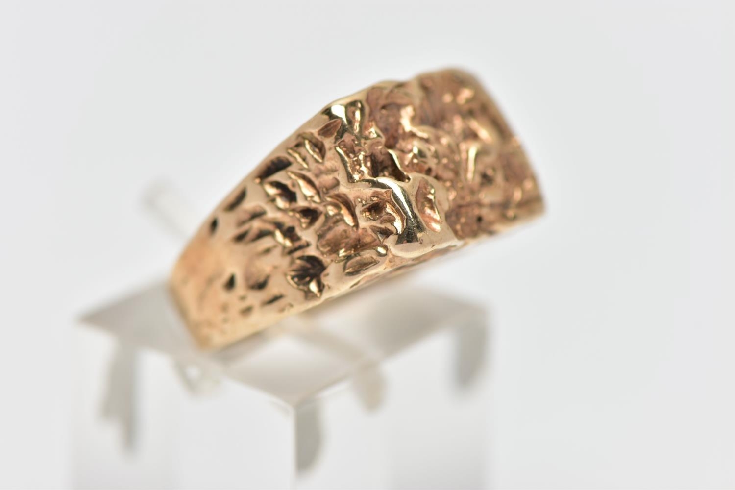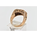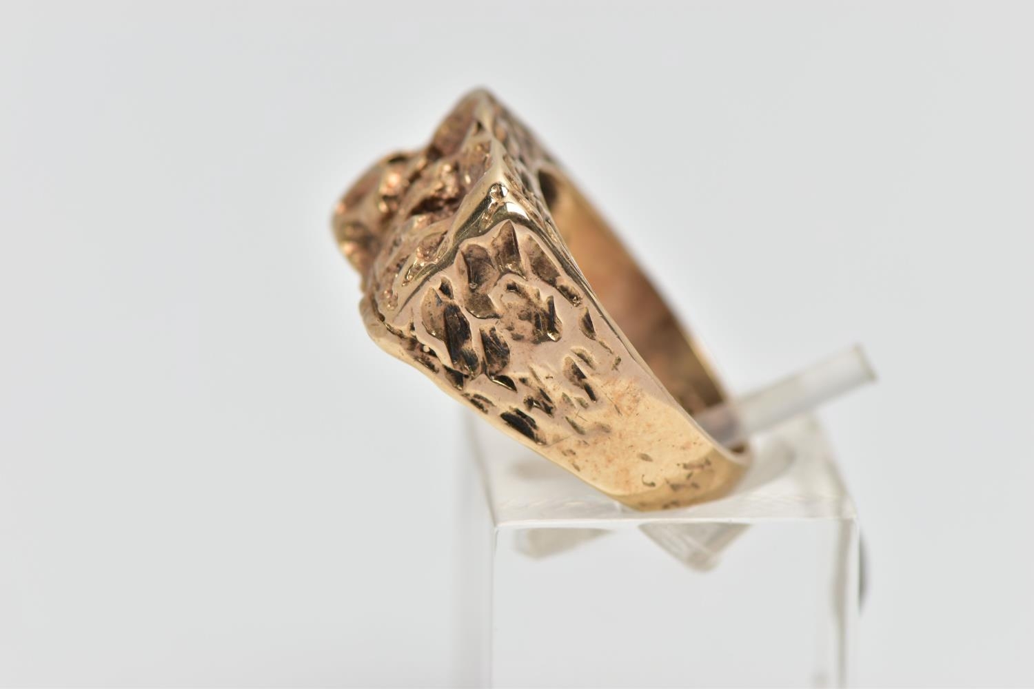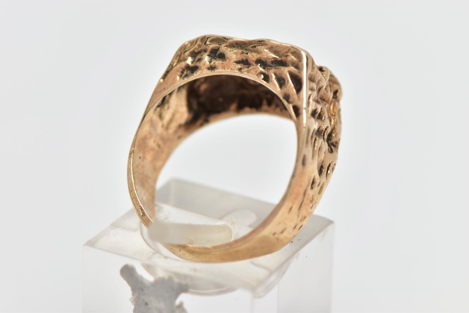 A 9CT GOLD TEXTURED SIGNET RING, yellow gold ring, of a rectangular textured form which cascades down the shoulders to a polished band, hallmarked 9ct London 1975, ring size L, approximate gross weight 5.7 grams (condition report: the pattern to the shoulders is partially worn, overall condition good)