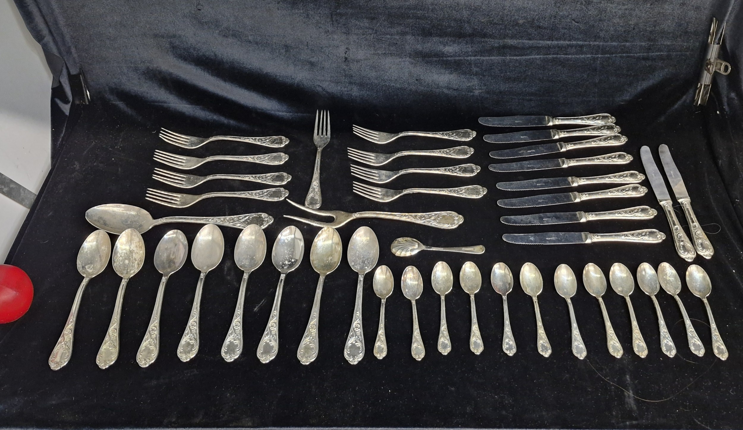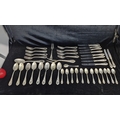 A box of assorted vintage king pattern silverplate cutlery including knives, forks and spoons.