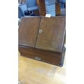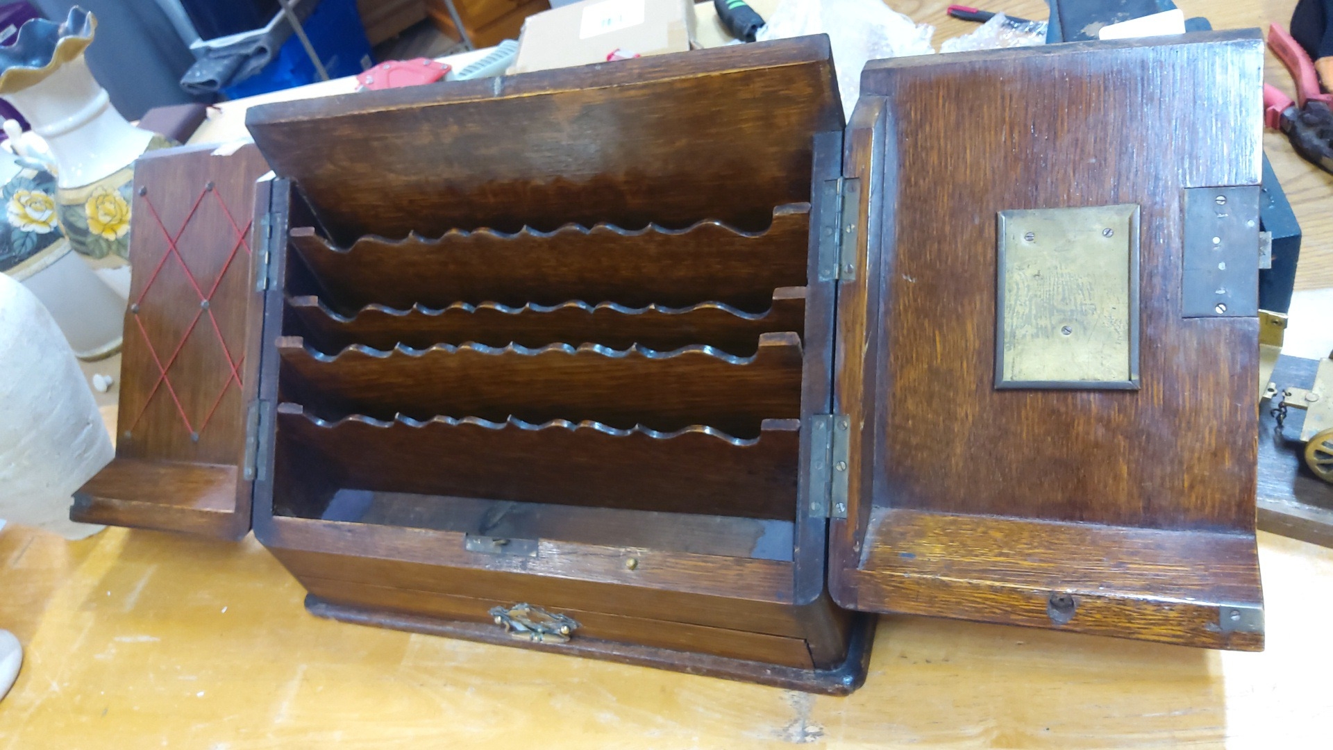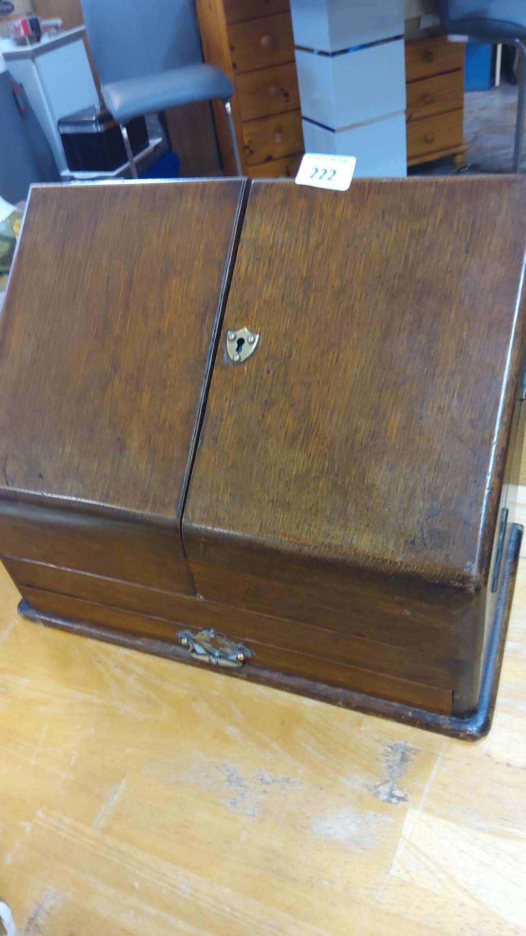 Late 19th/early 20th century oak correspondence box, the sloping hinged lid opening to a fitted interior with tiered wavy-edged letter racks; the side door with brass plate, on a plinth base with front drawer.