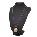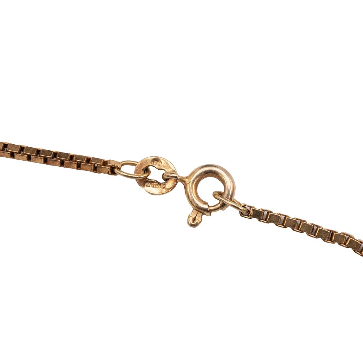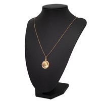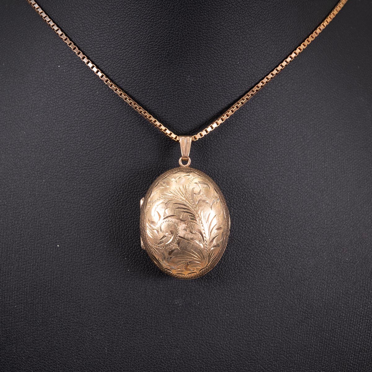 9ct gold oval ball locket with engraved decoration and box link necklace with spring ring clasp, drop 28cm, weight 14.6 grams.