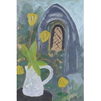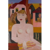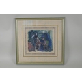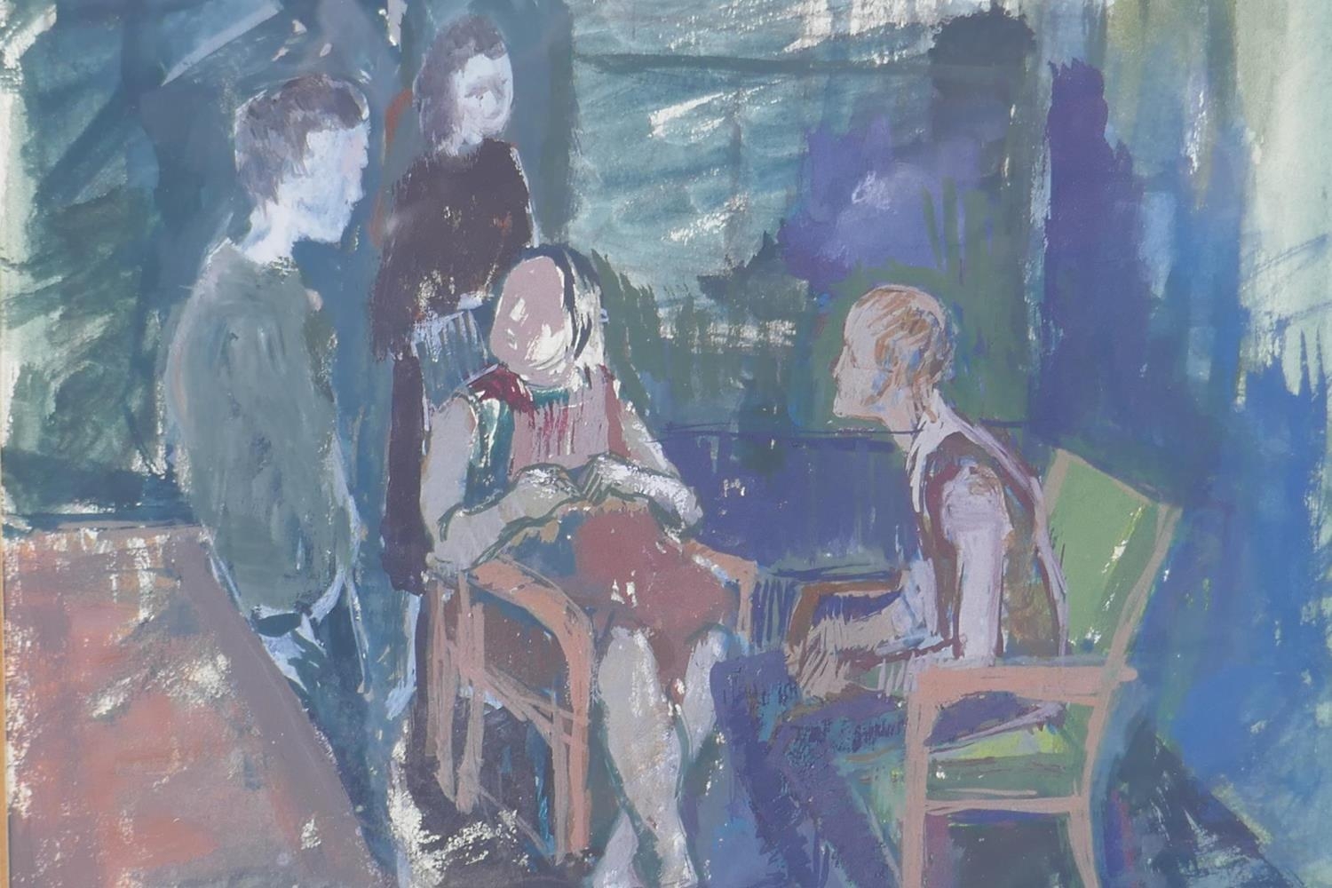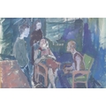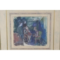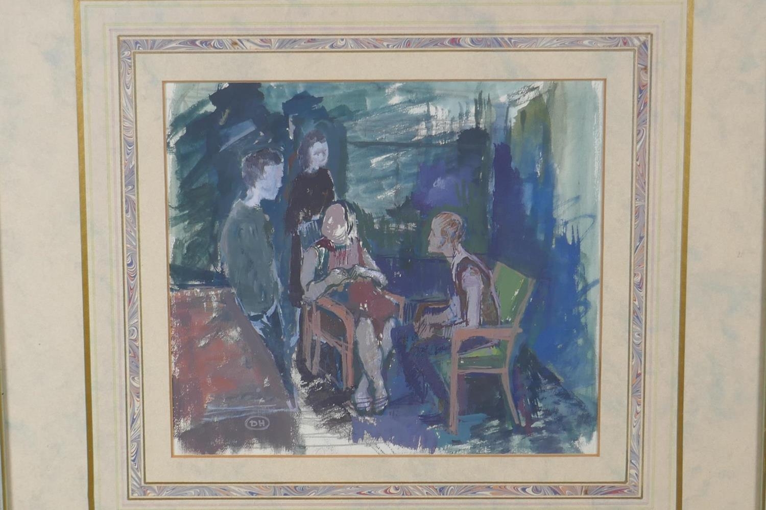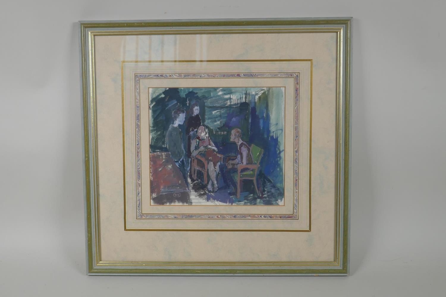 Derek Hill, figures in an interior, monogramed, gouache sketch, 18 x 20cm