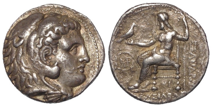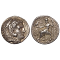 Ancient Greek: Seleucid Empire, Seleukos I Nikator (312-281 BC) silver Tetradrachm of Babylon, in the name and types of Alexander III 'the Great' of Macedon. Obv: Head of Herakles right, wearing lion skin. / Rev: AΛEΞANΔPOY / ΒΑΣΙΛΕΩΣ. Zeus seated left on throne, holding eagle and sceptre; in left field monogram within wreath; MI below throne. 16.64g. VF with some porosity and scratches.