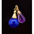 LAPIS LAZULI DROP PENDANT TOGETHER WITH AN AMETHYST DROP PENDANT (2), set with a lapiz lazuli ball of approx. 12.9 mm. L. 2.7 cm. 3.9 grams. AMETHYST DROP PENDANT, set with a pearl shaped amethyst drop. Diam. 8.7 mm. L. 2.1 cm. 1.8 grams.
