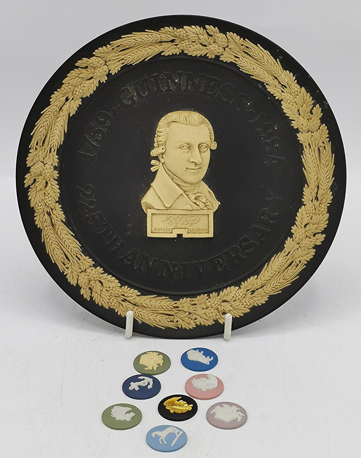 WEDGWOOD BLACK JASPER WARE PLATE (Made For The Guinness Anniversary 1984) TOGETHER WITH WEDGWWOD Small MEDALLIONS (8) IN VARIOUS COLOURS