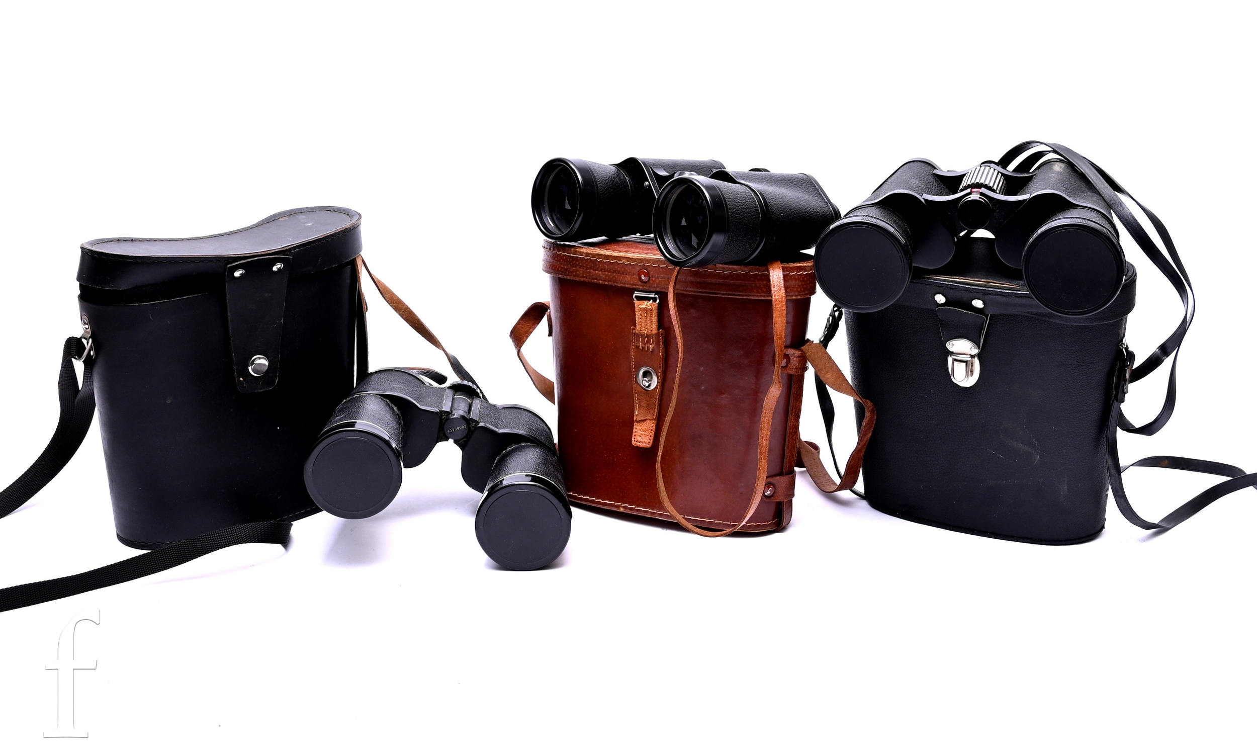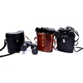 A pair of Eikow Air Port 7 x 50 binoculars in leather case, a pair of Russian 10 x 50 binoculars and another pair, in black cases. (3)