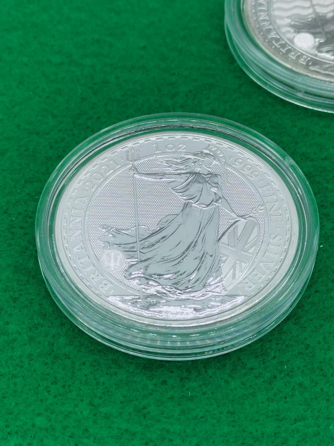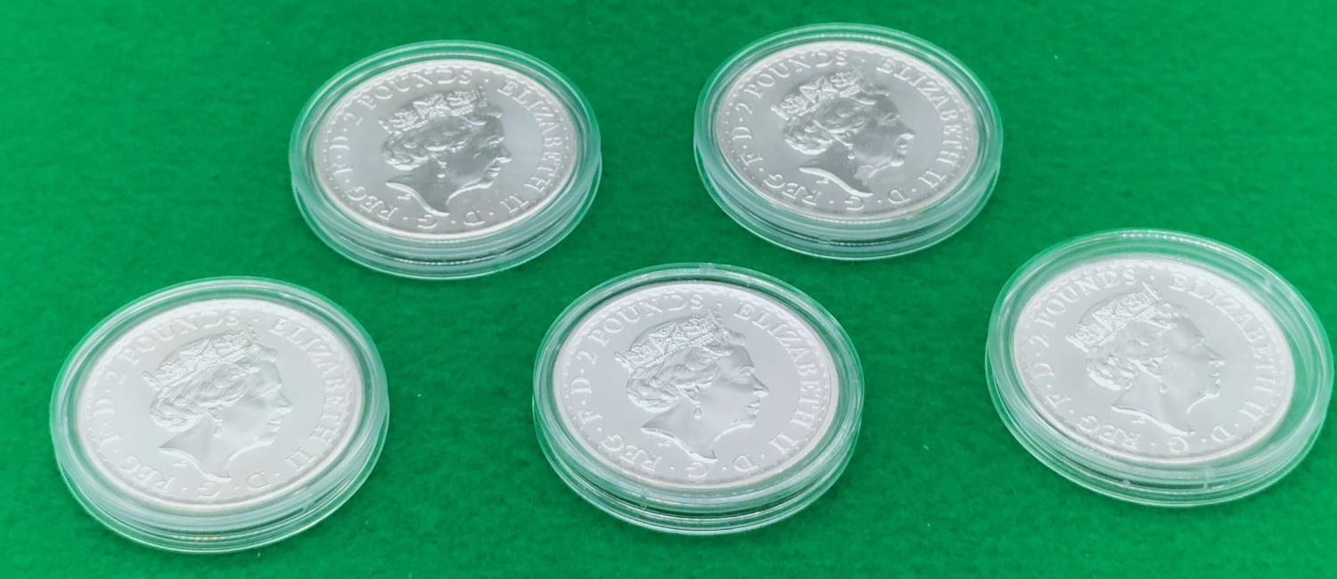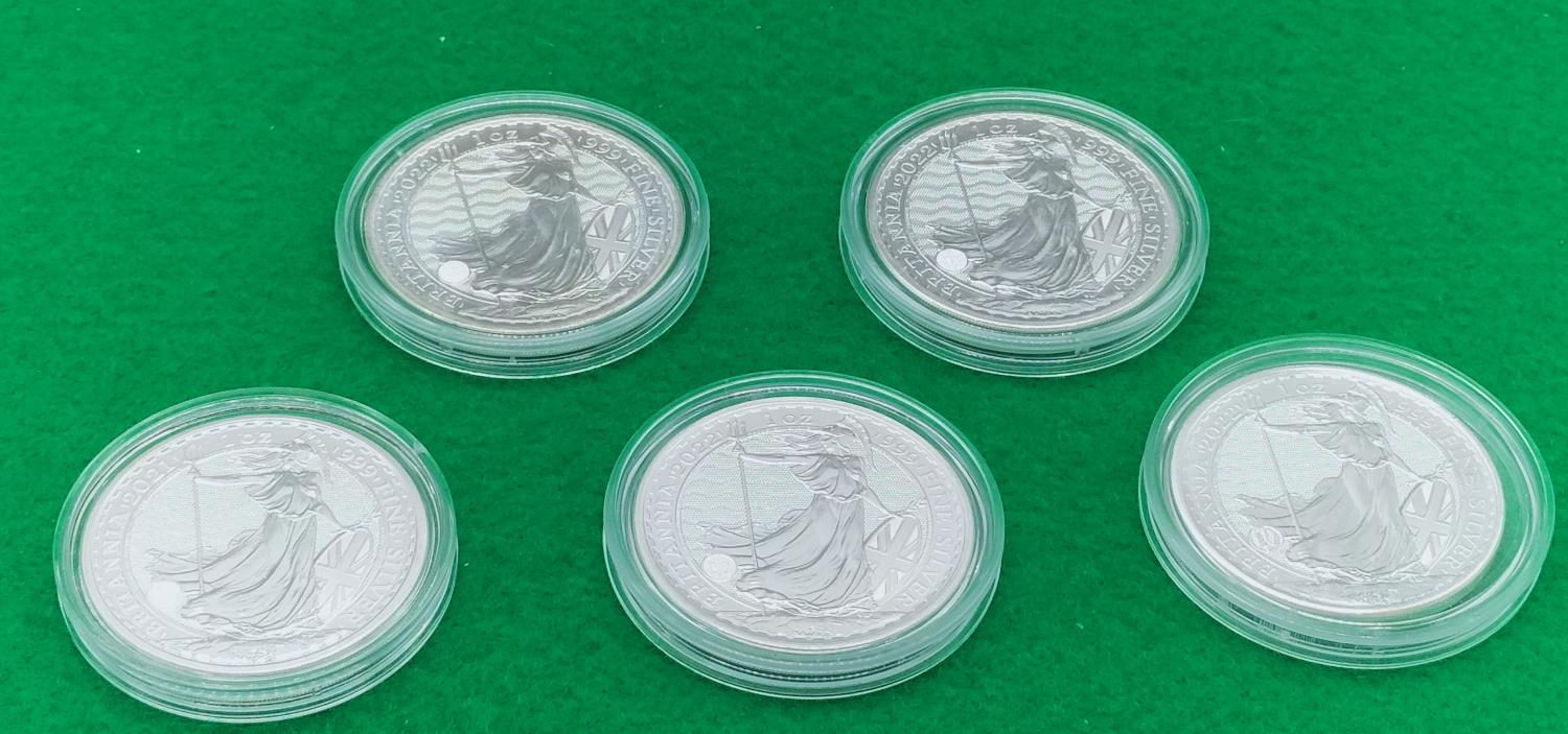 5 x 999 Fine Silver 1 Ounce Silver Britannia Coins 4 x 2022 plus 1 x 2021.