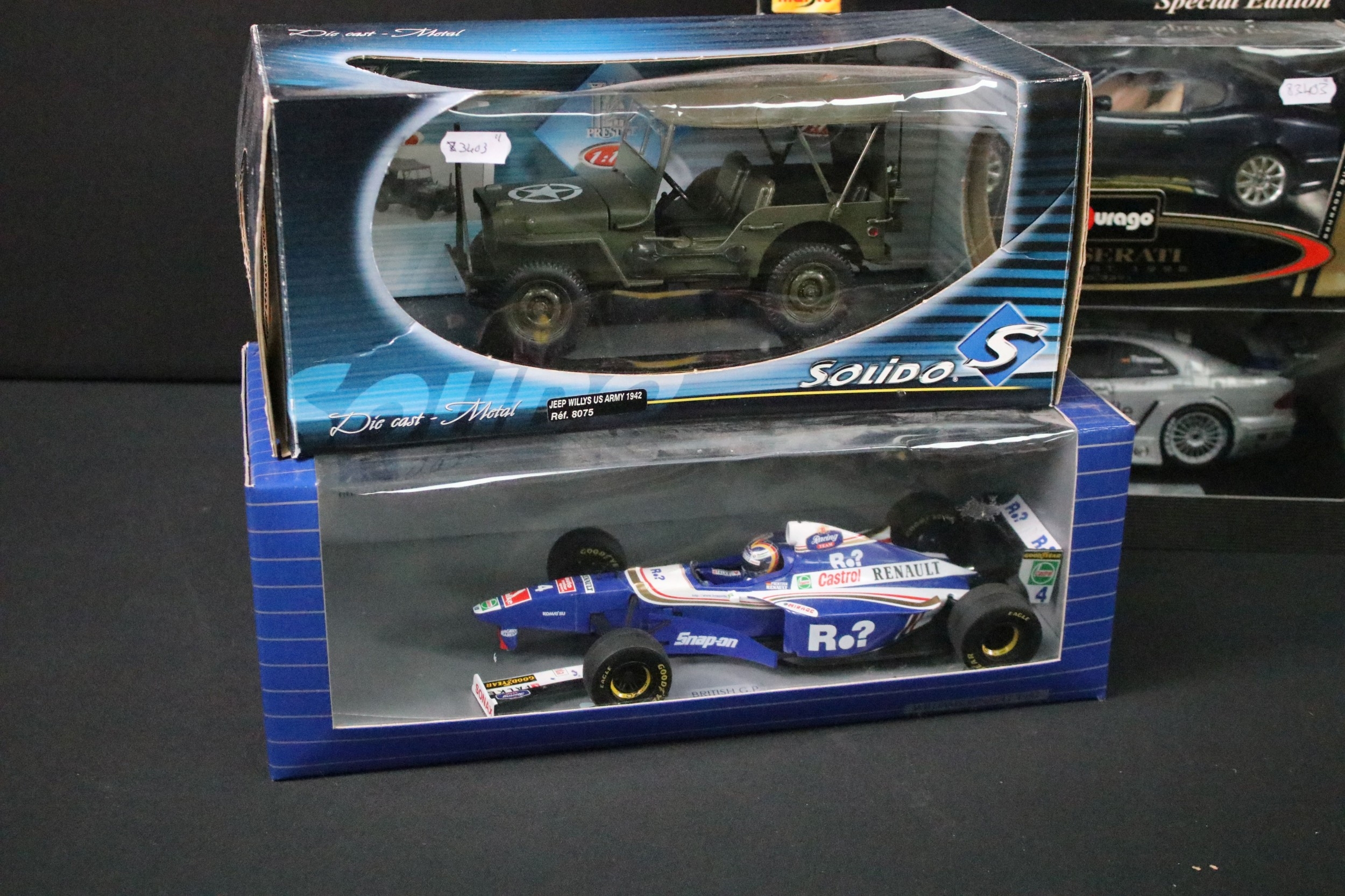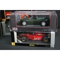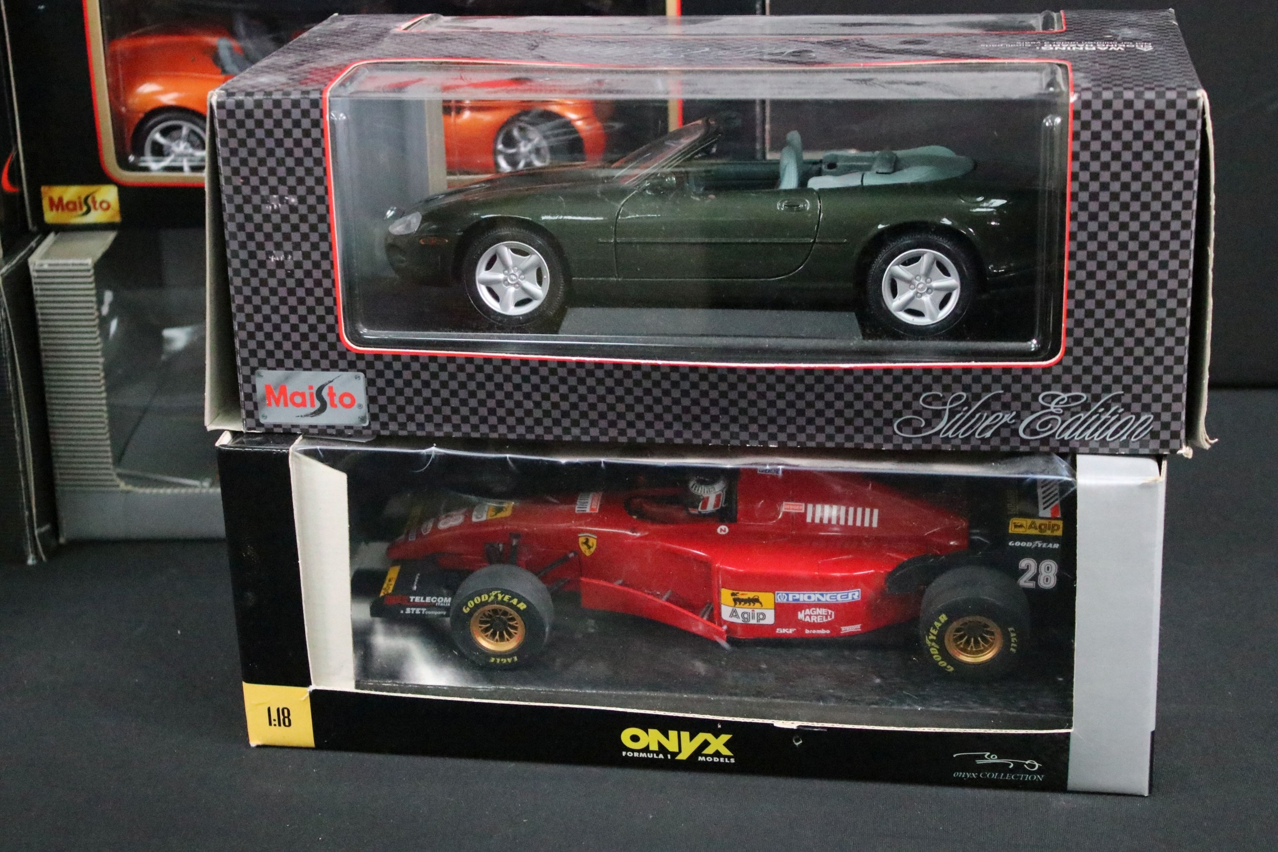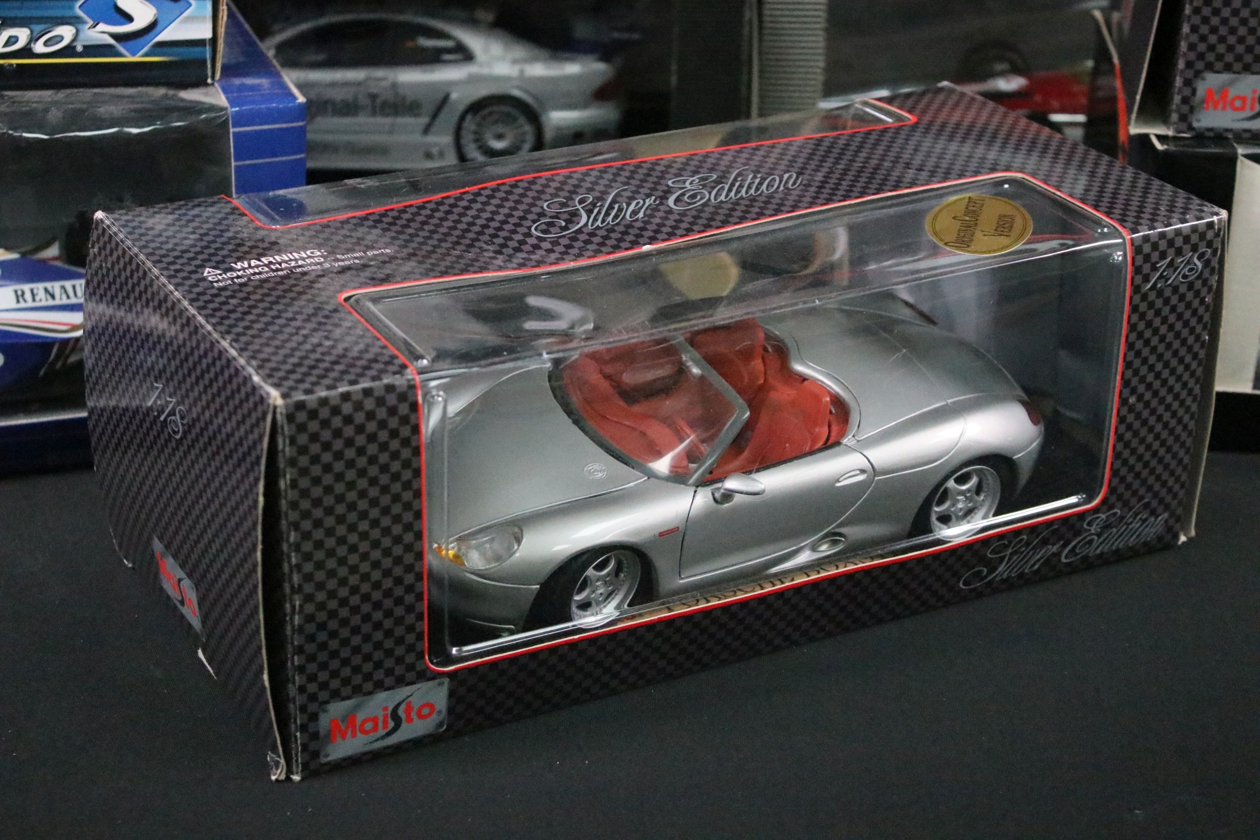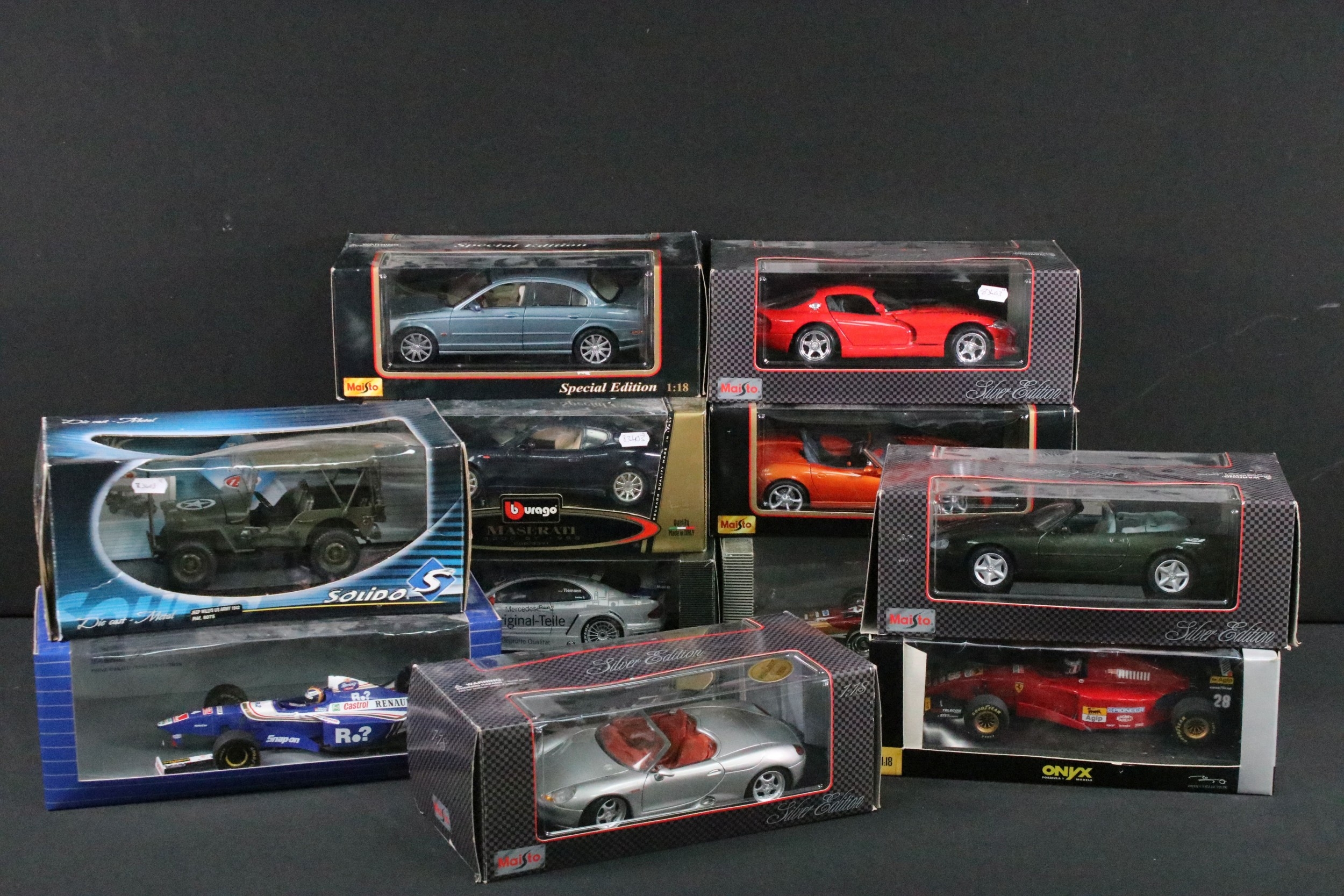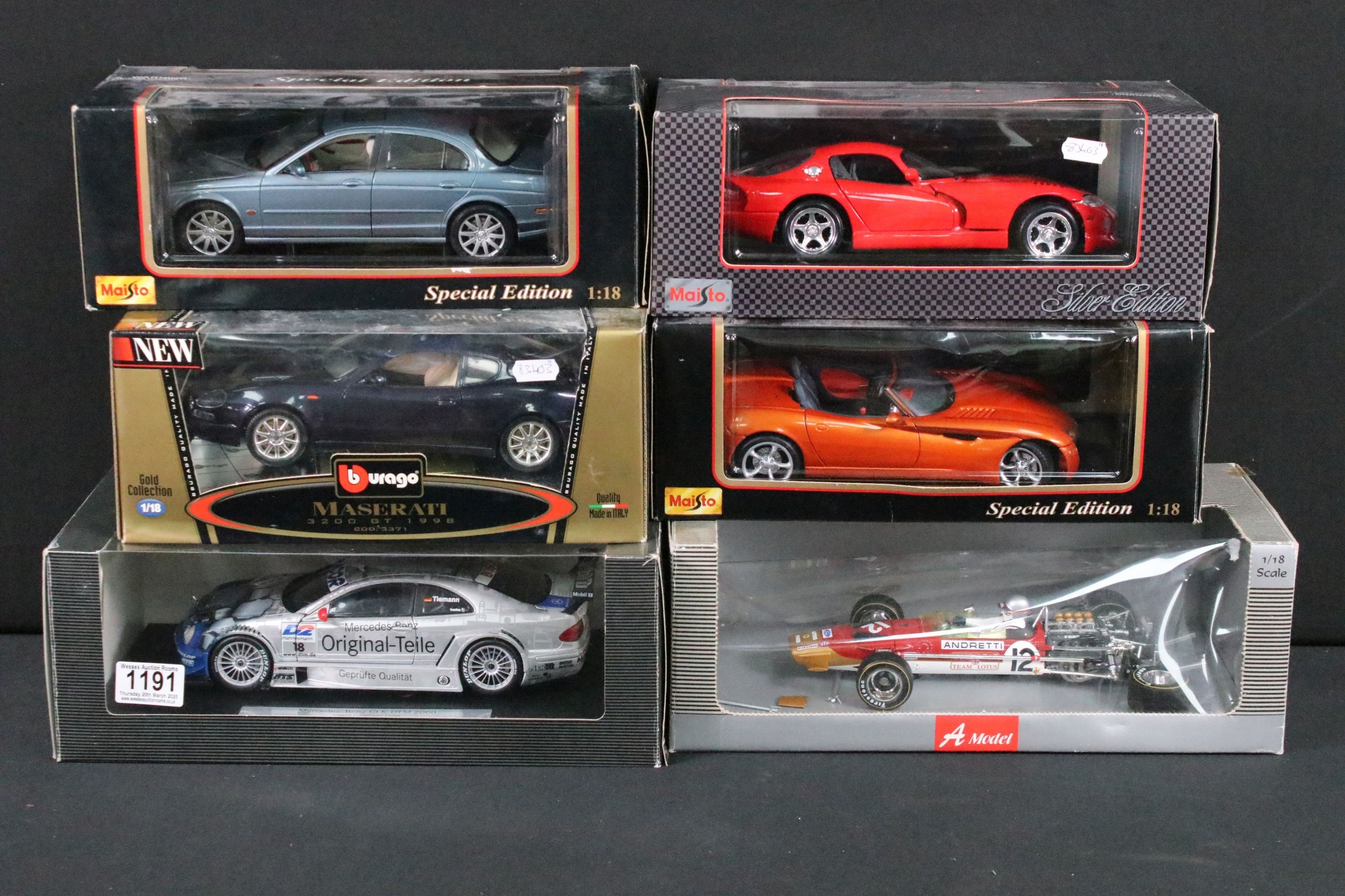 11 Boxed 1/18 diecast model cars featuring 5 x Maisto (Jaguar S-Type 1999, Porsche Boxster, etc), 1 x Mercedes-Benz CLK-DTM 2000, 1 x A Model Lotus 49B, 1 x Burago Maserati 3200 GT 1998, etc, boxes showing wear, diecast showing various faults